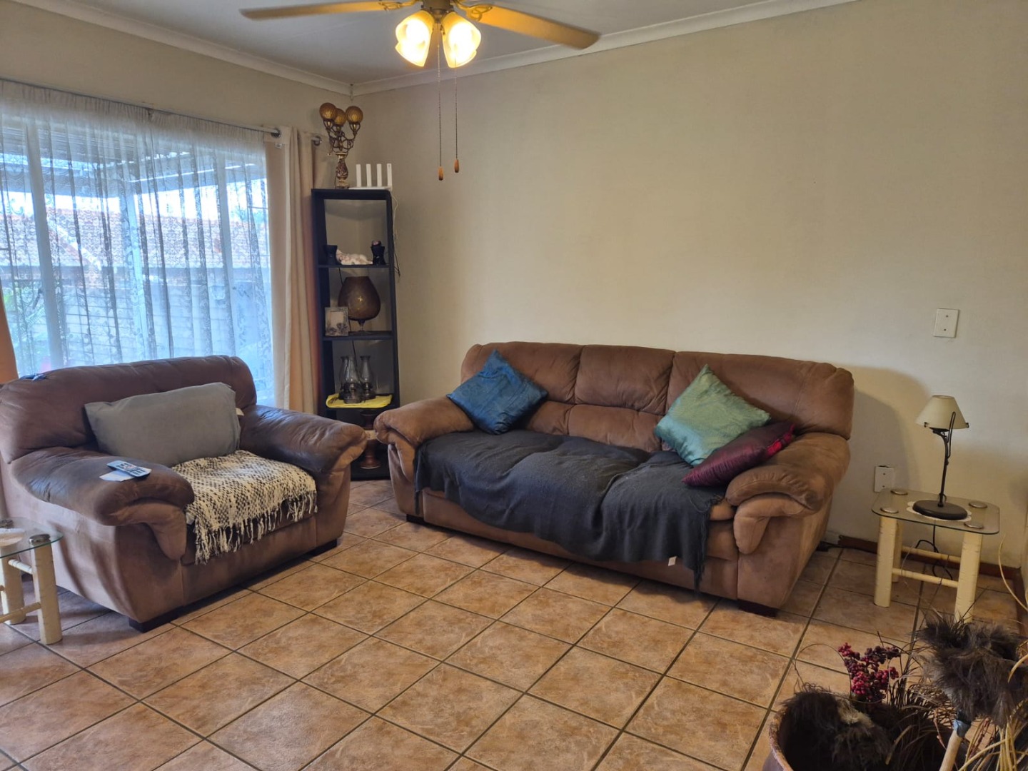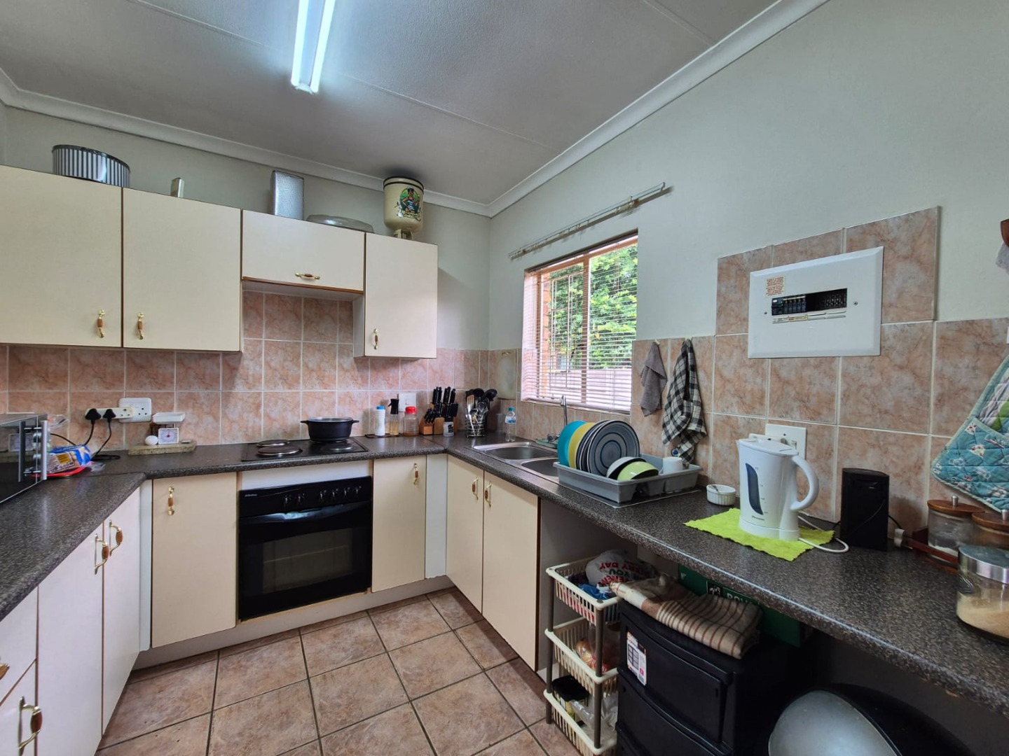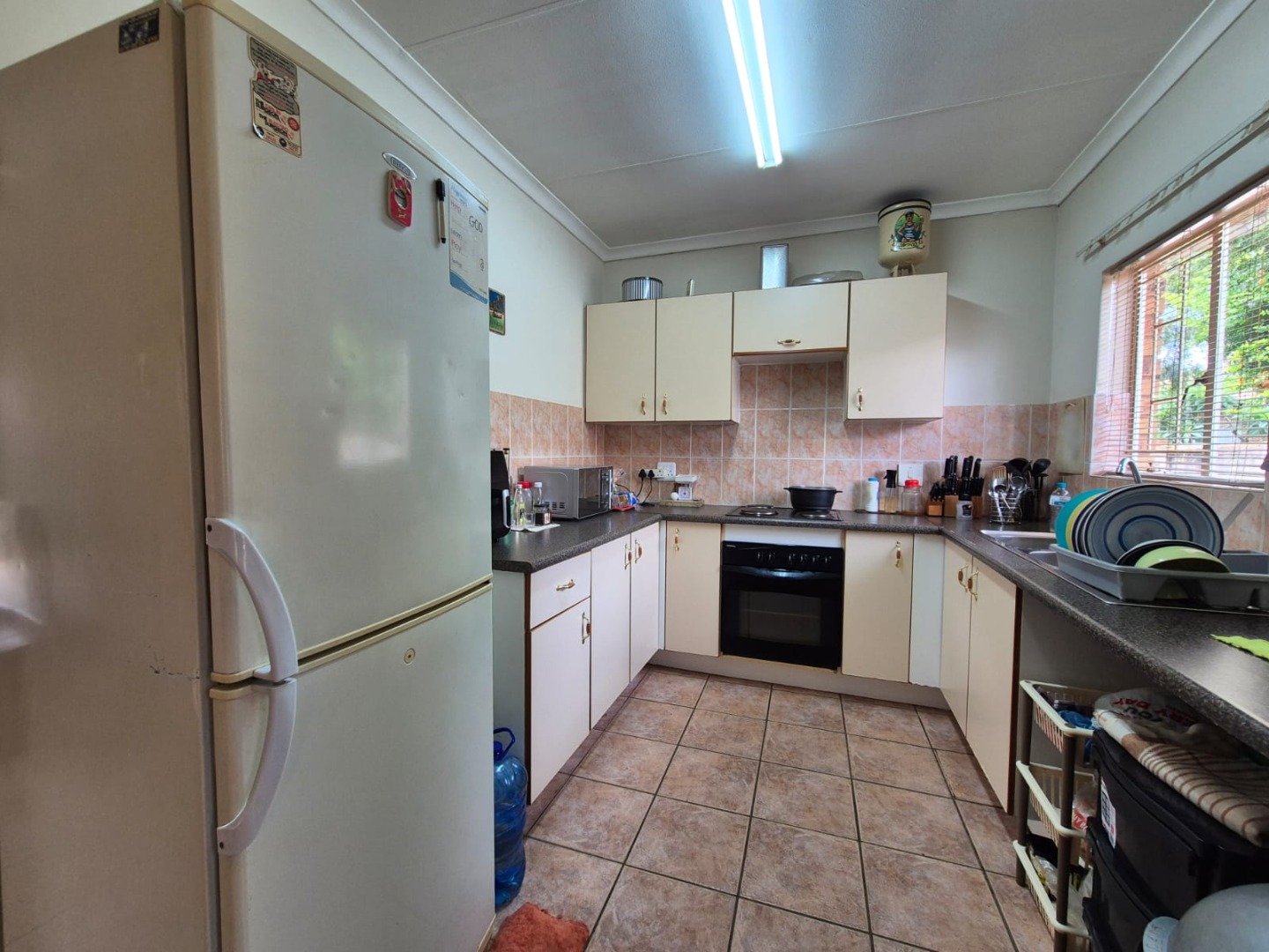 Step inside to a functional layout spanning 103 square metres, featuring a comfortable lounge and a dedicated dining room, both benefiting from durable tiled flooring. The living areas offer an open-plan potential and provide direct access to the outdoor patio, ensuring a seamless indoor-outdoor flow. The kitchen is equipped with ample cabinet and counter space, a built-in stove and oven, and receives natural light, making it a practical space for daily living.