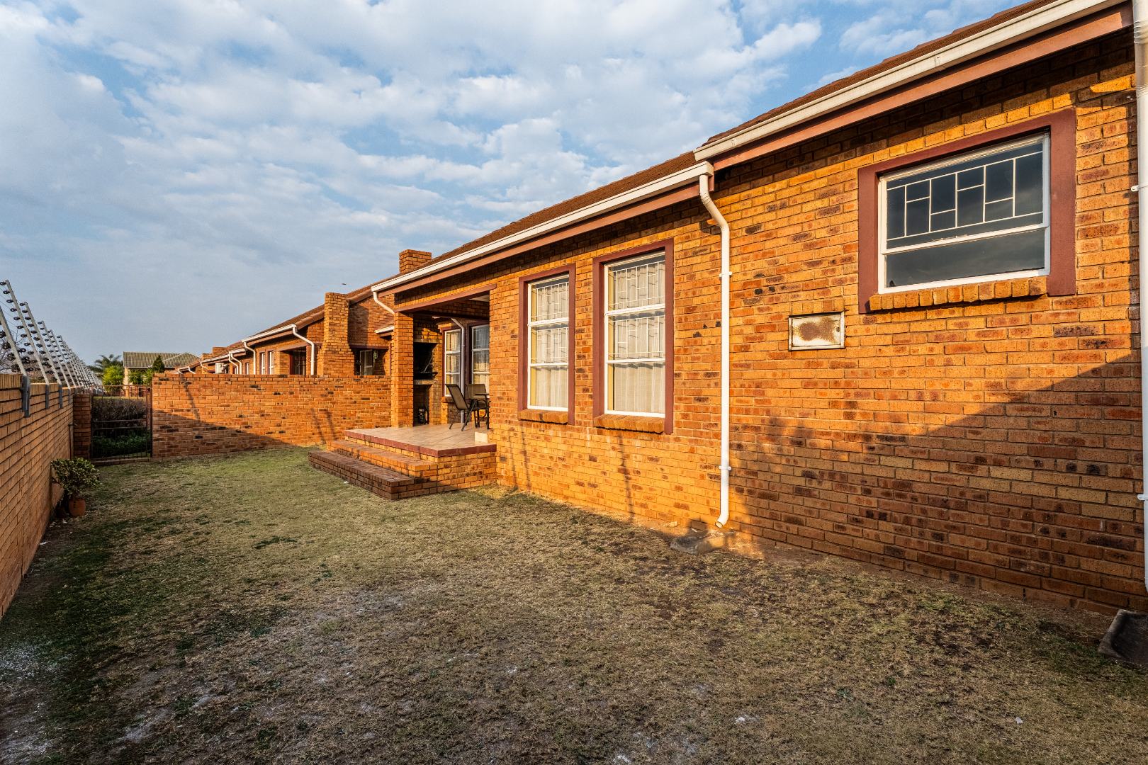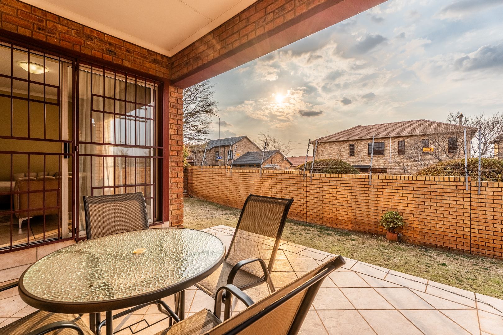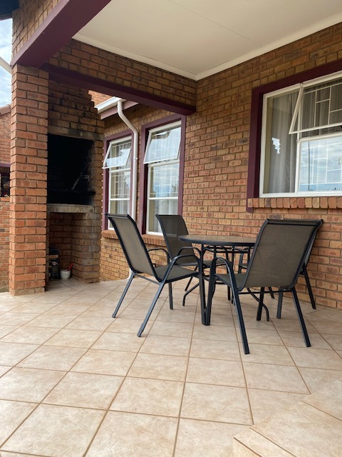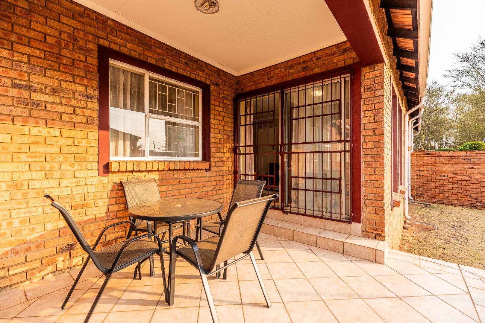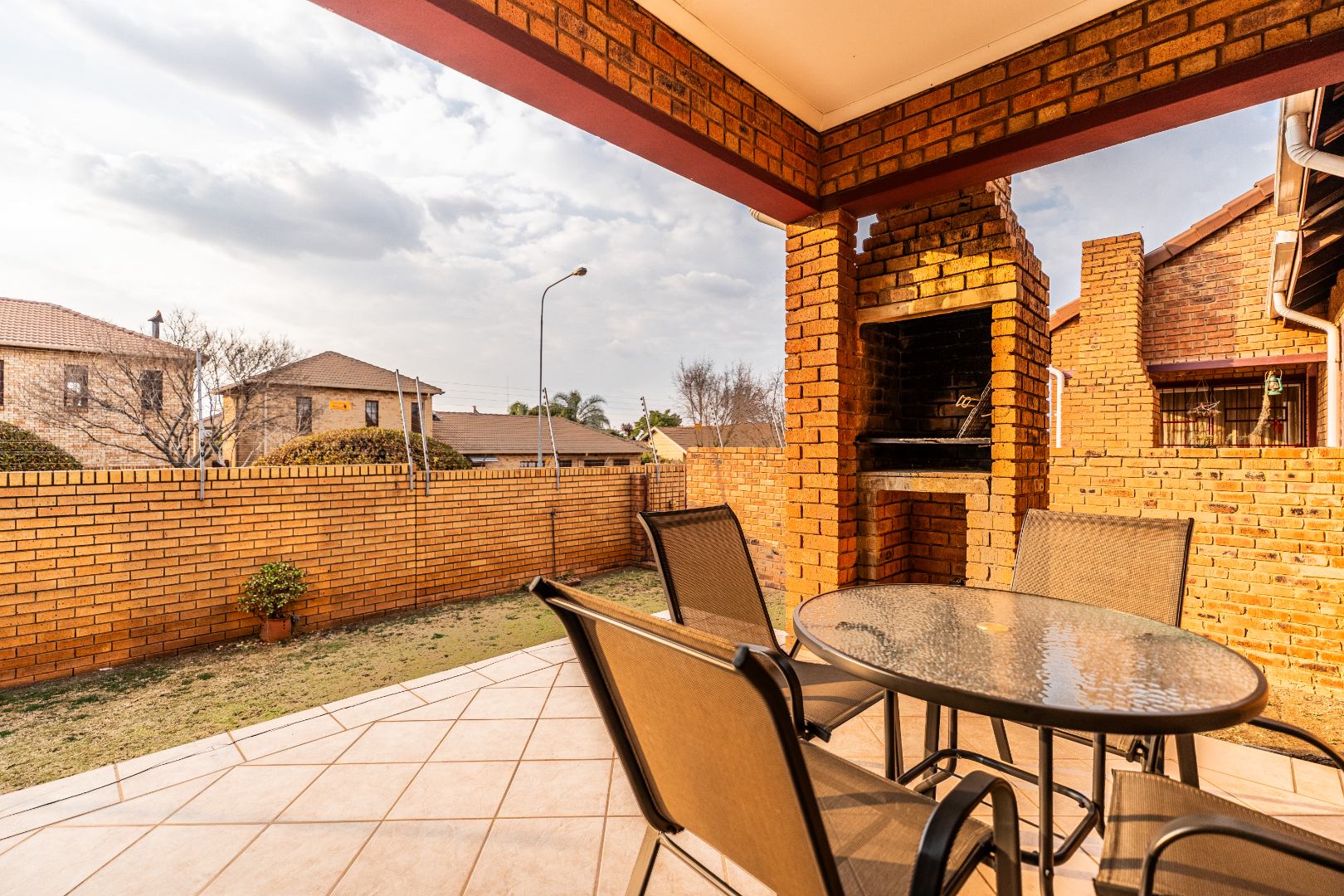 Glass sliding doors lead to a partially covered patio with a built-in braai, ideal for year-round entertaining and a neat manageable private garden.
