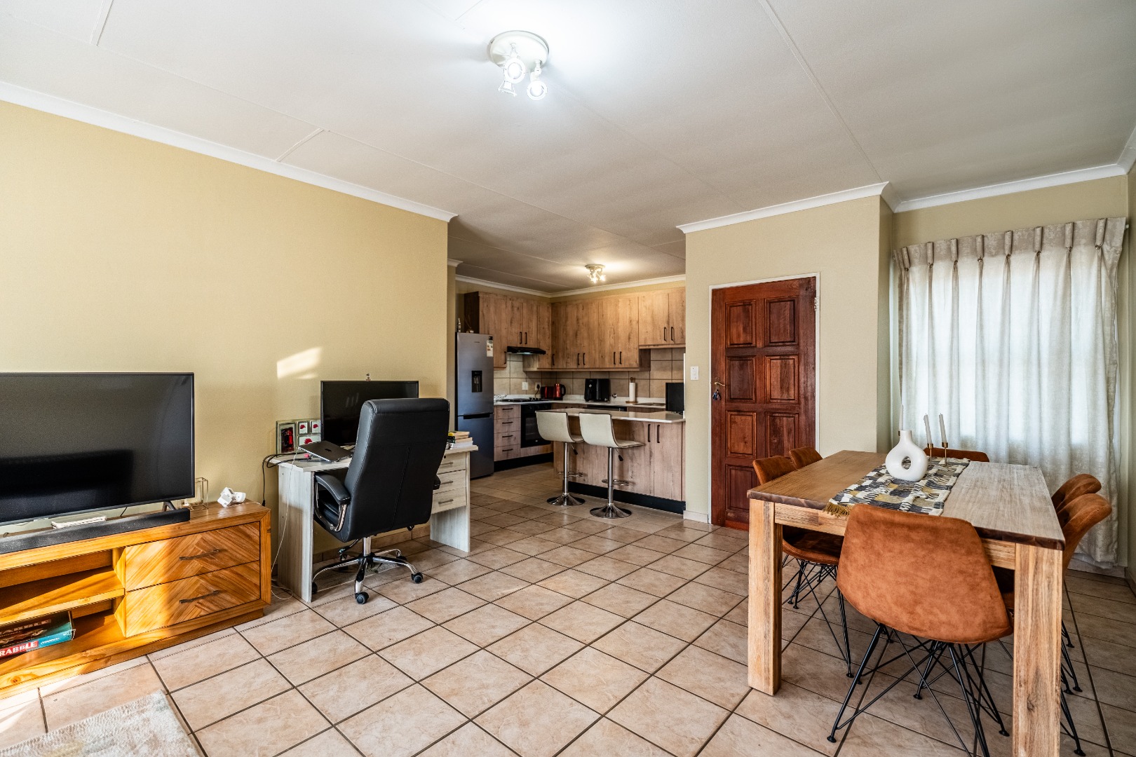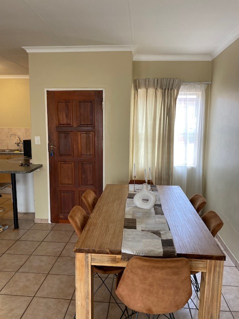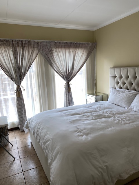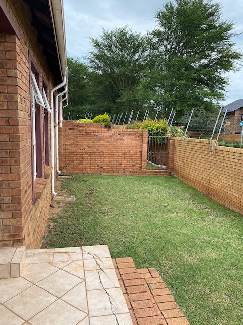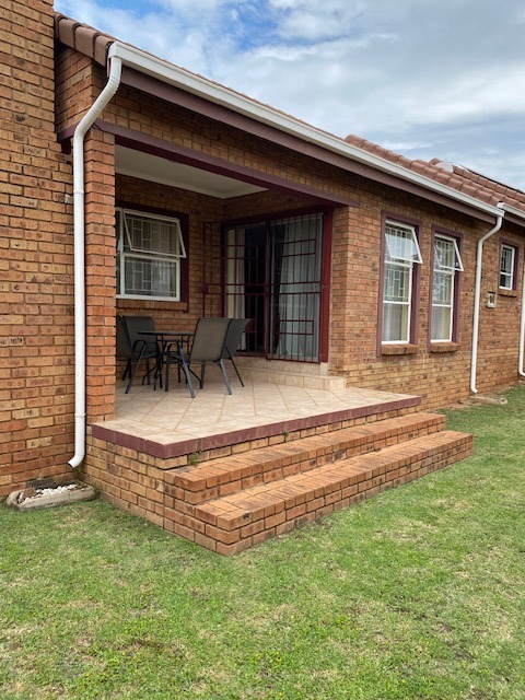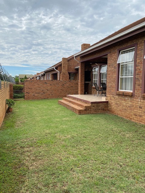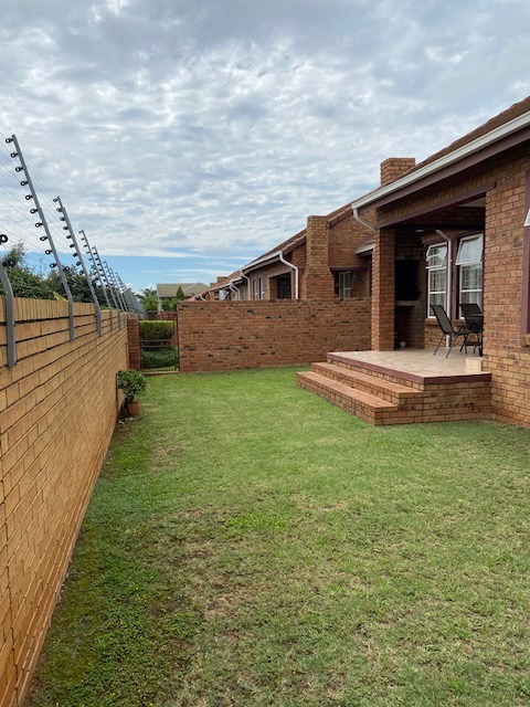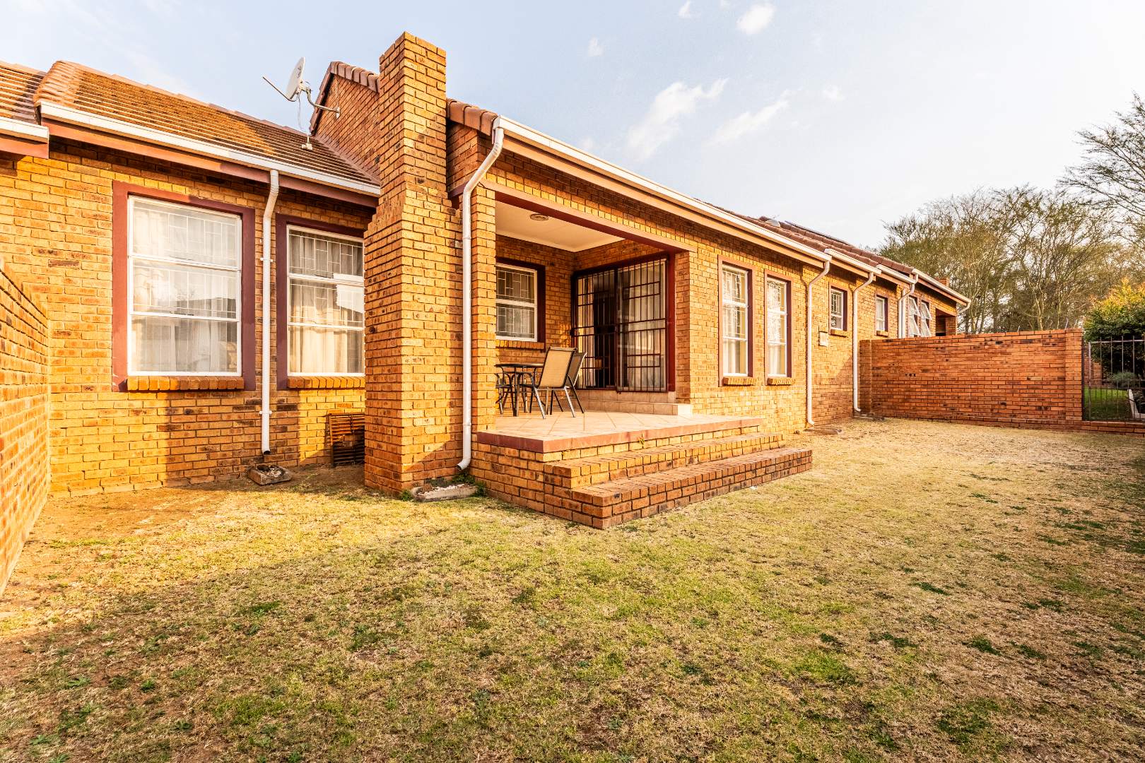 Glass sliding doors lead to a partially covered patio with a built-in braai, ideal for year-round entertaining and a neat manageable private garden.