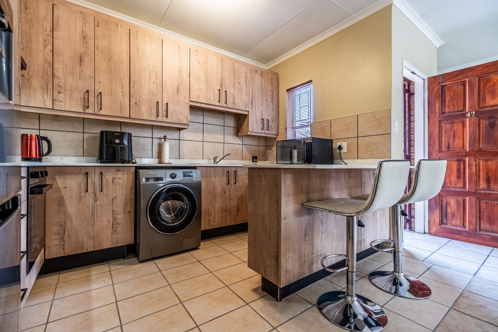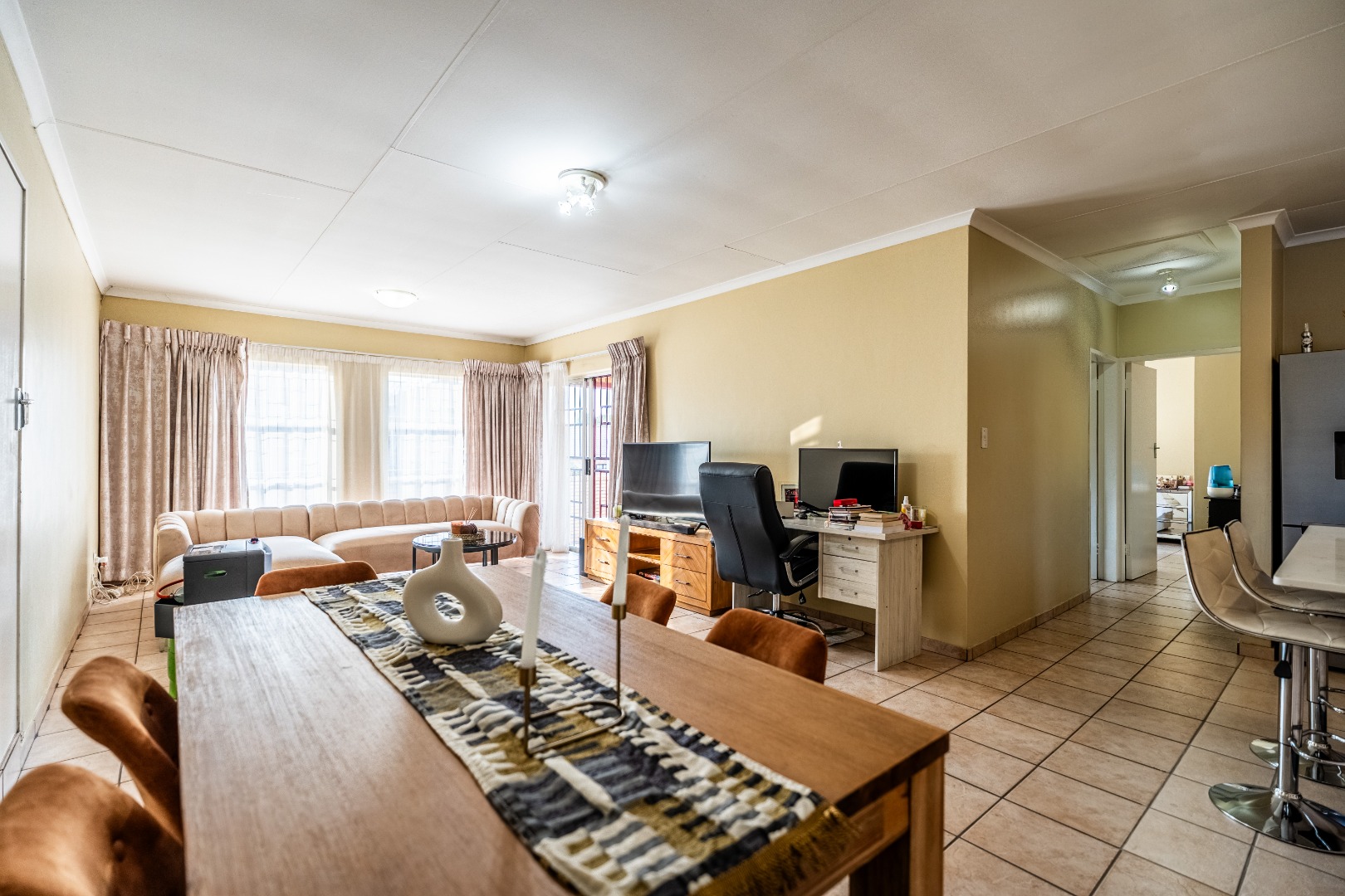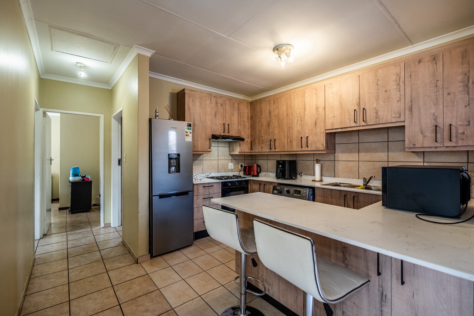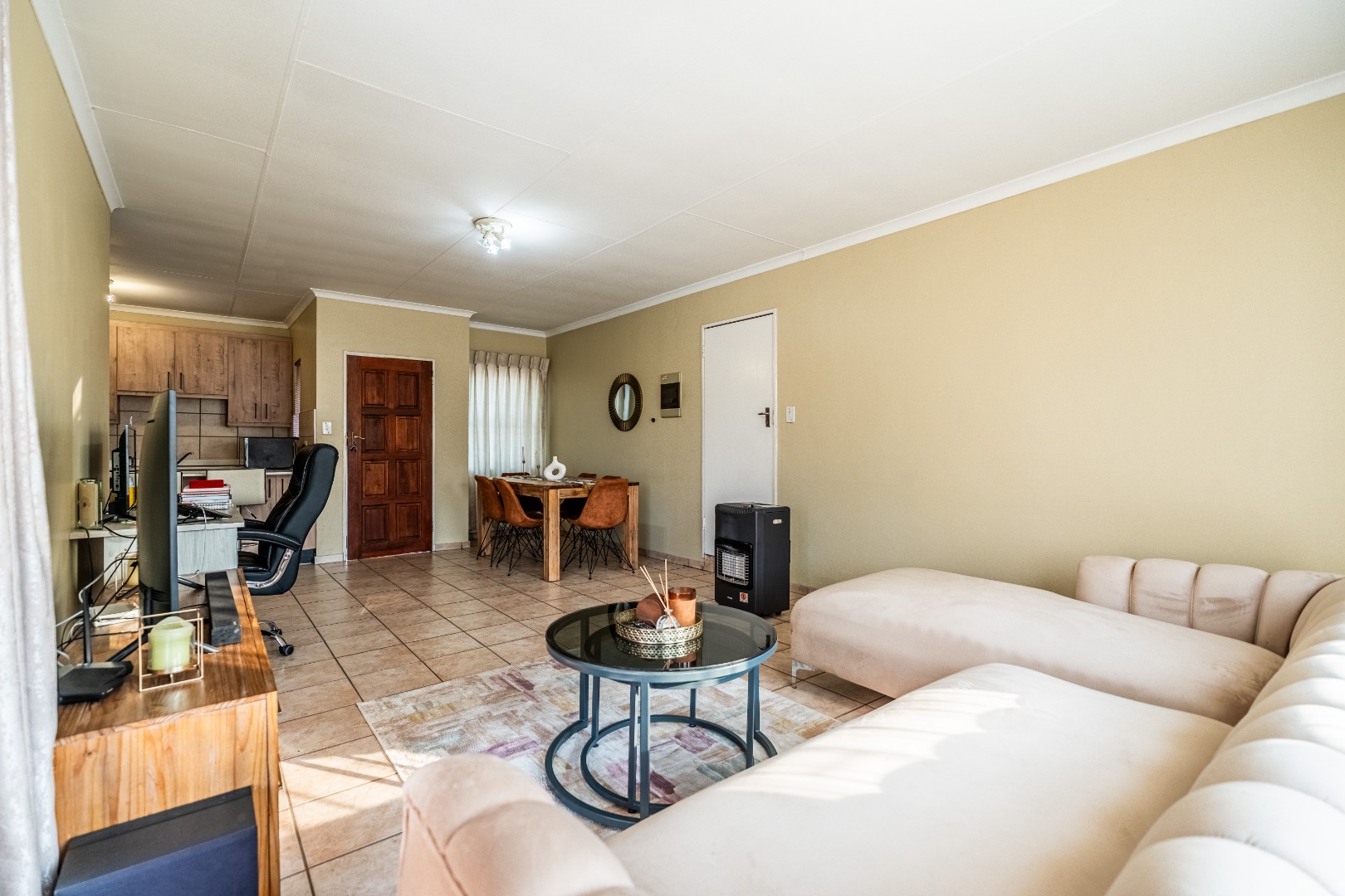 Glass sliding doors lead to a partially covered patio with a built-in braai, ideal for year-round entertaining and a neat manageable private garden.