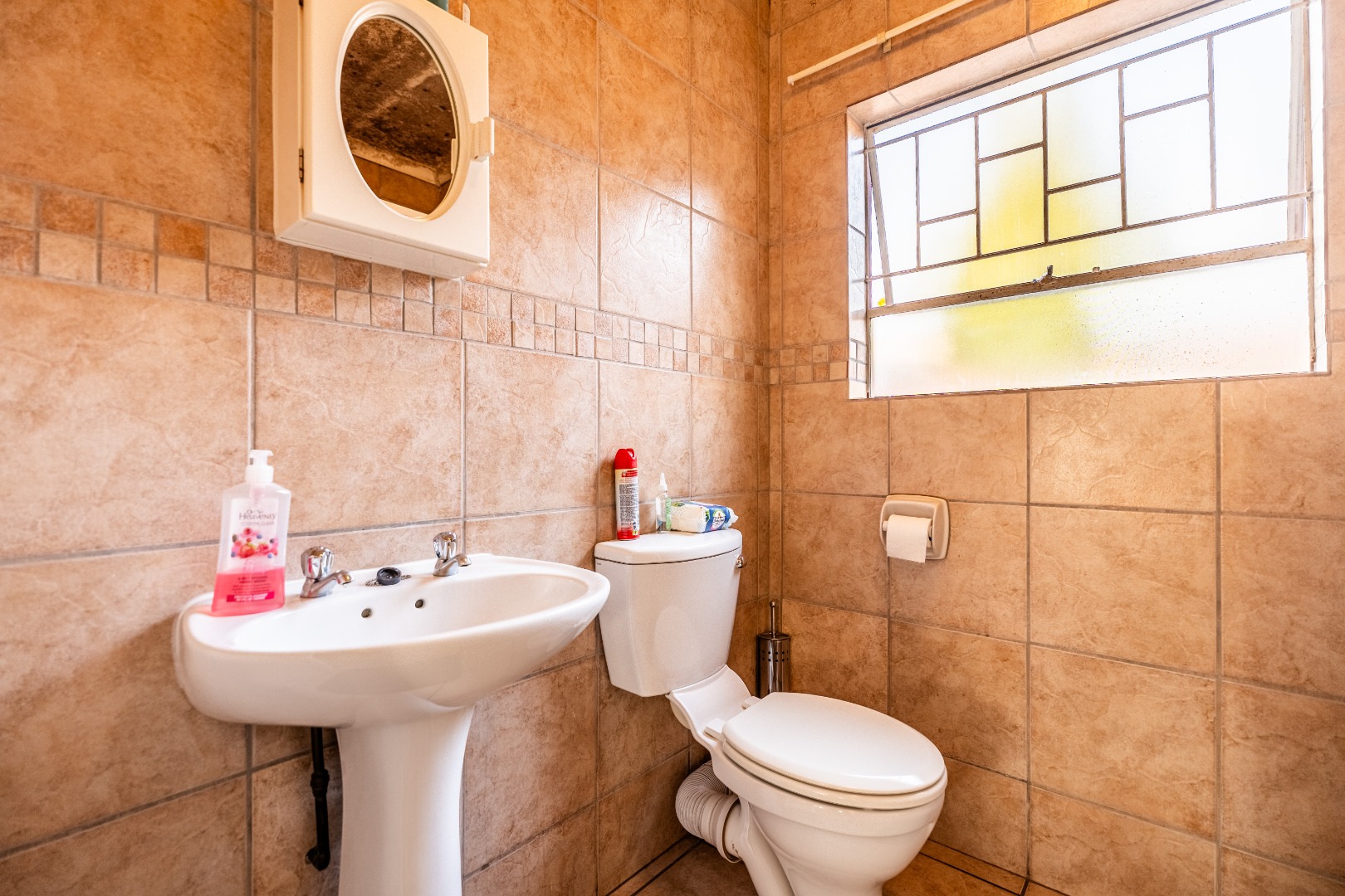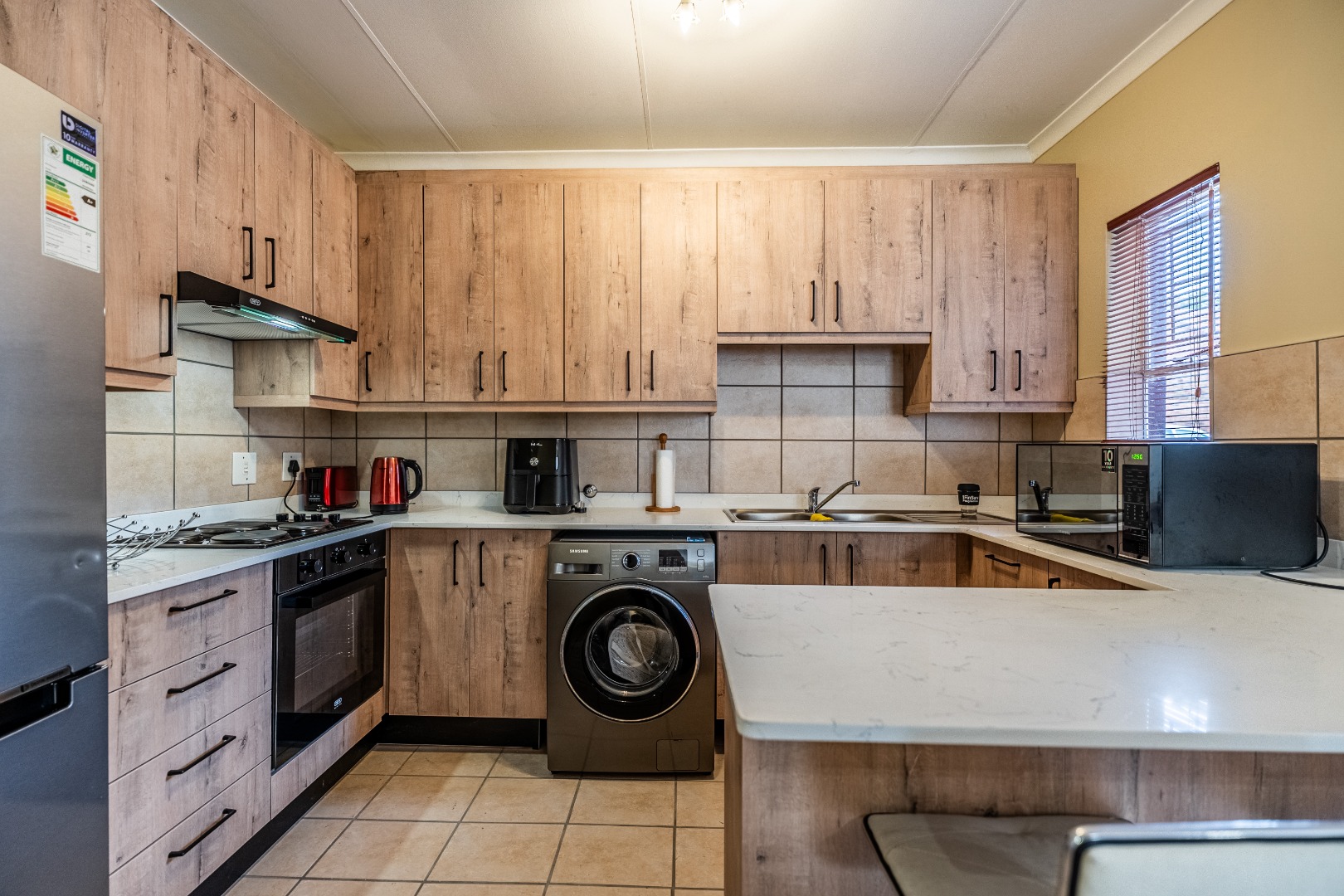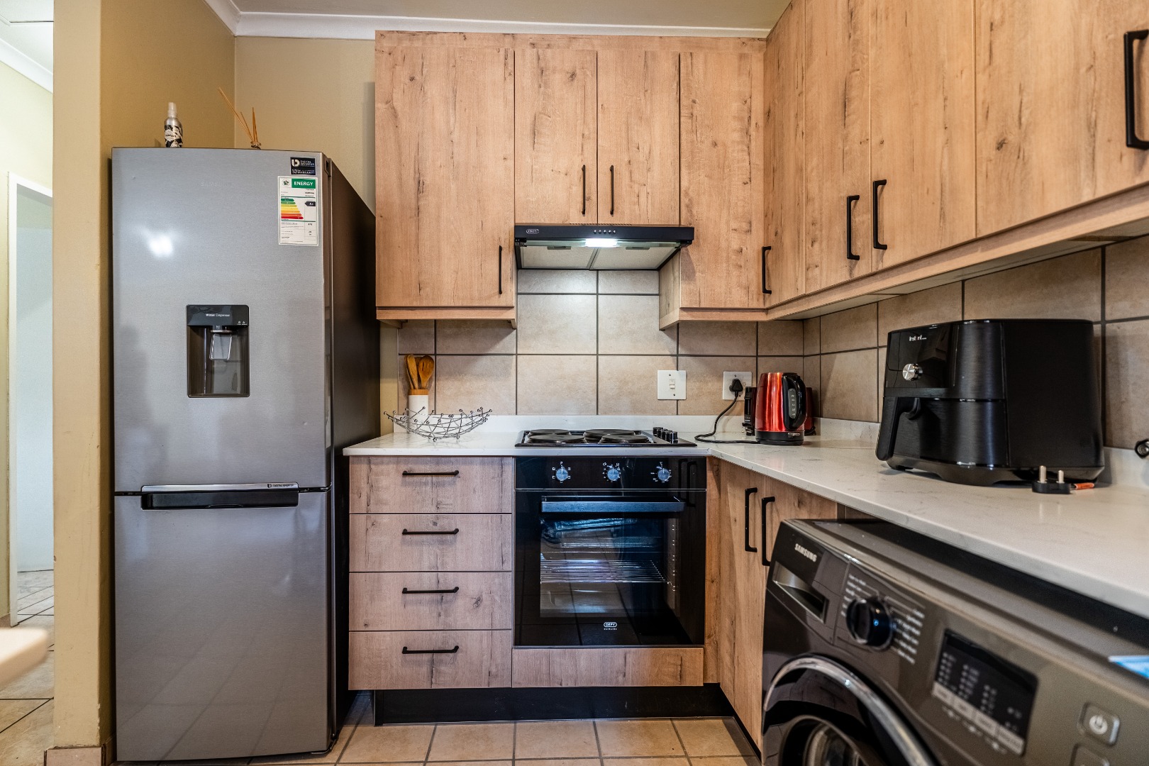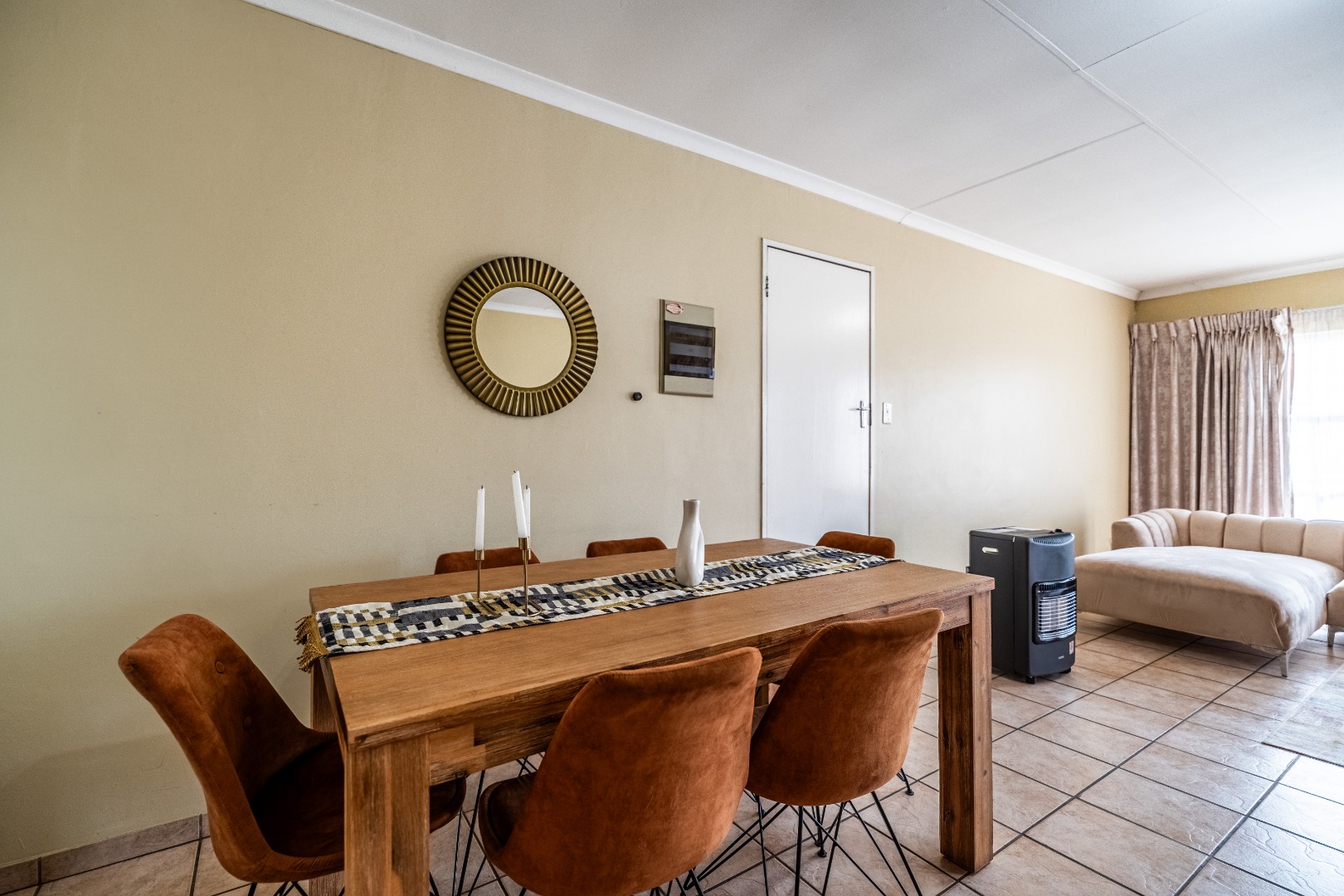 Glass sliding doors lead to a partially covered patio with a built-in braai, ideal for year-round entertaining and a neat manageable private garden.