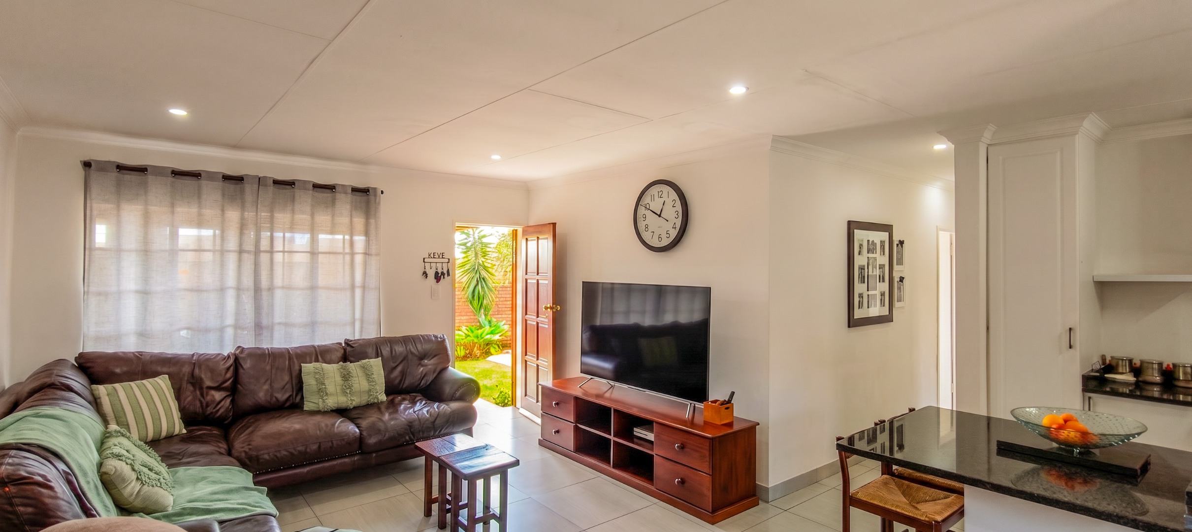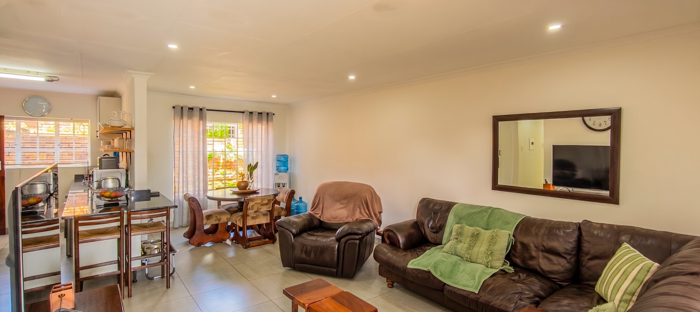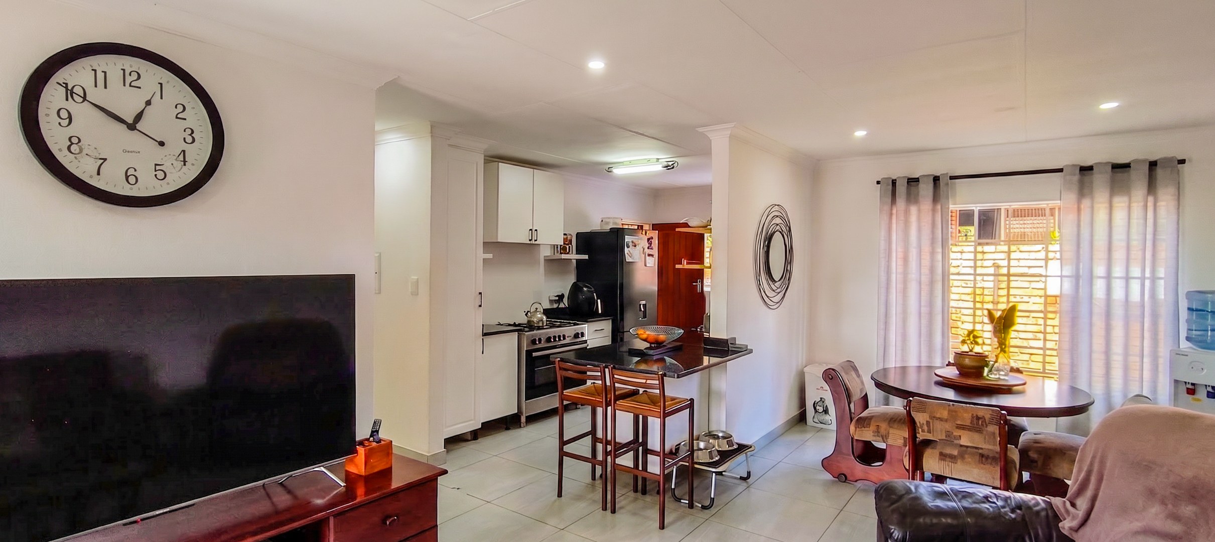 As you arrive, the front yard leads you to a welcoming patio with a built in braai, set alongside a covered swimming pool that creates a relaxed outdoor space right at the entrance. From here, you step into an open plan lounge, which flows into the dining area, forming a connected living space suited to everyday living.