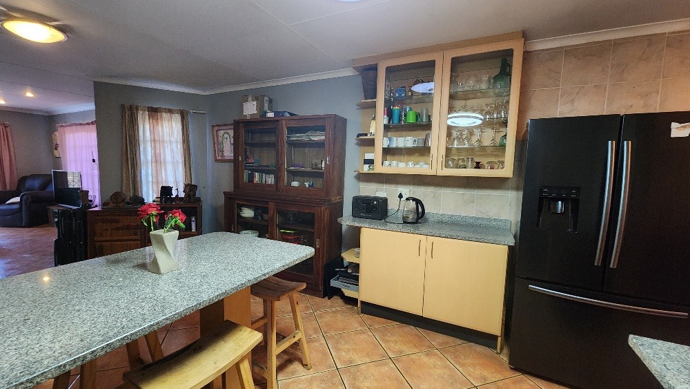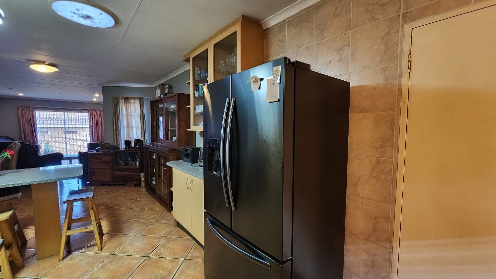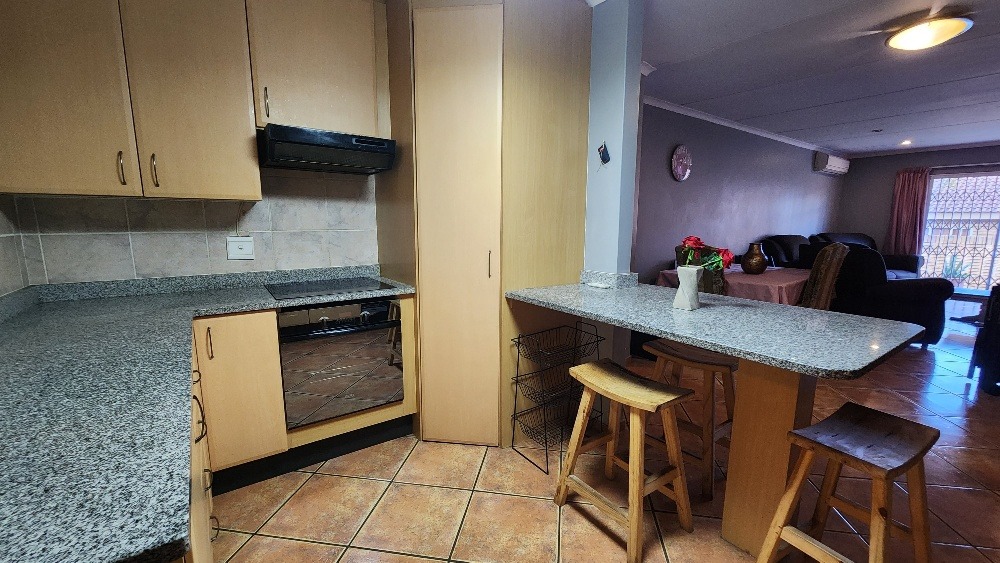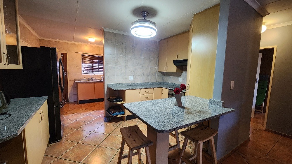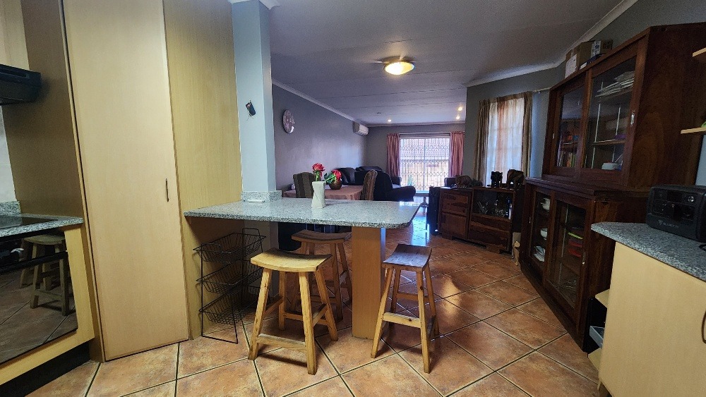 Step inside to an open-plan living and dining area, designed for comfortable family life. The interior boasts durable tiled flooring throughout and is equipped with air conditioning in the lounge for climate control. The functional kitchen is a highlight, featuring ample light-colored cabinetry, granite countertops, a practical breakfast bar, and a dedicated pantry, catering to all culinary needs.