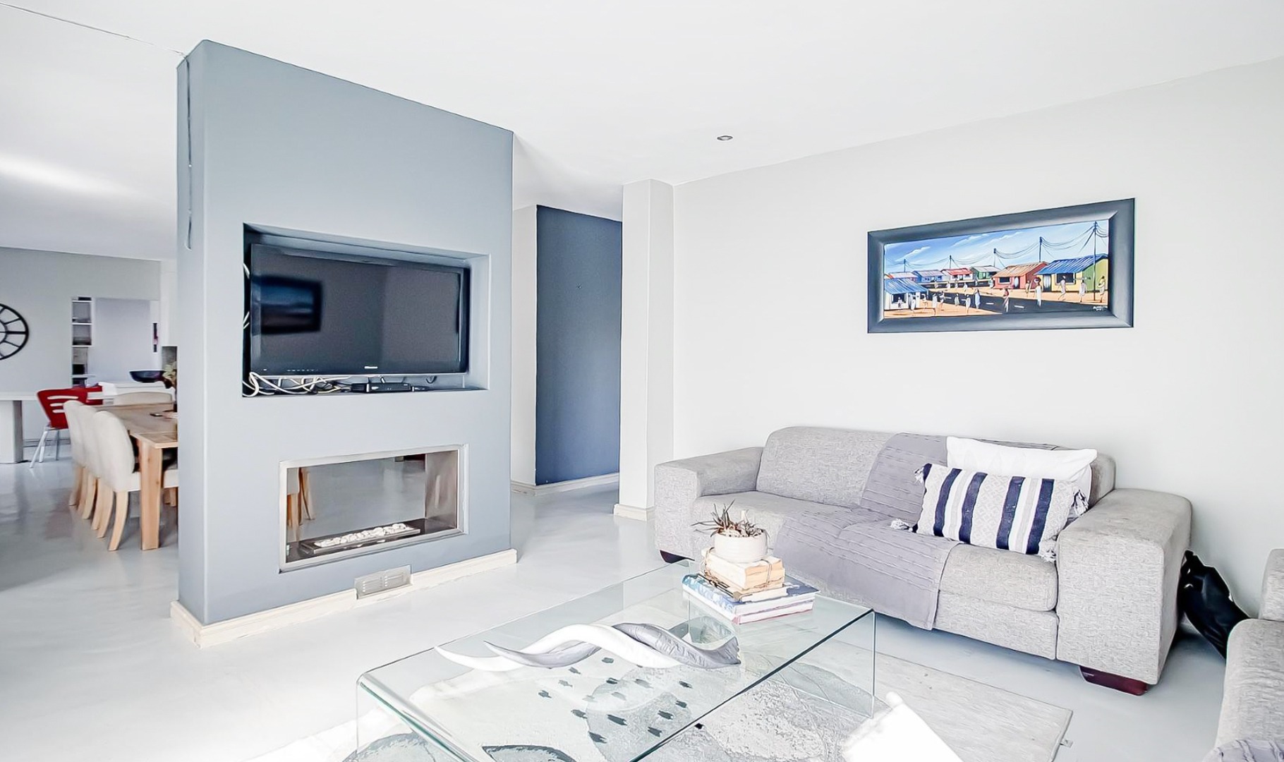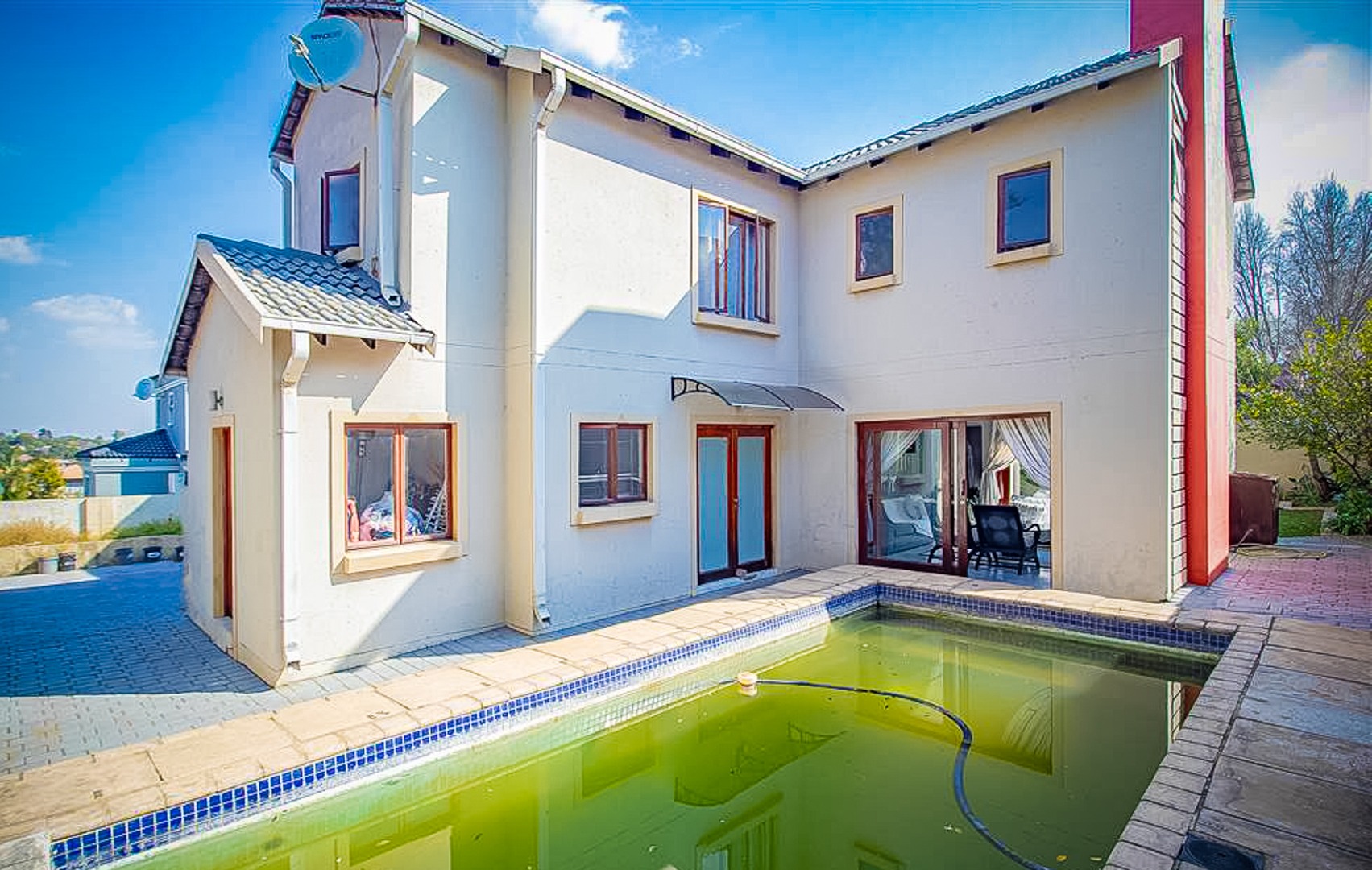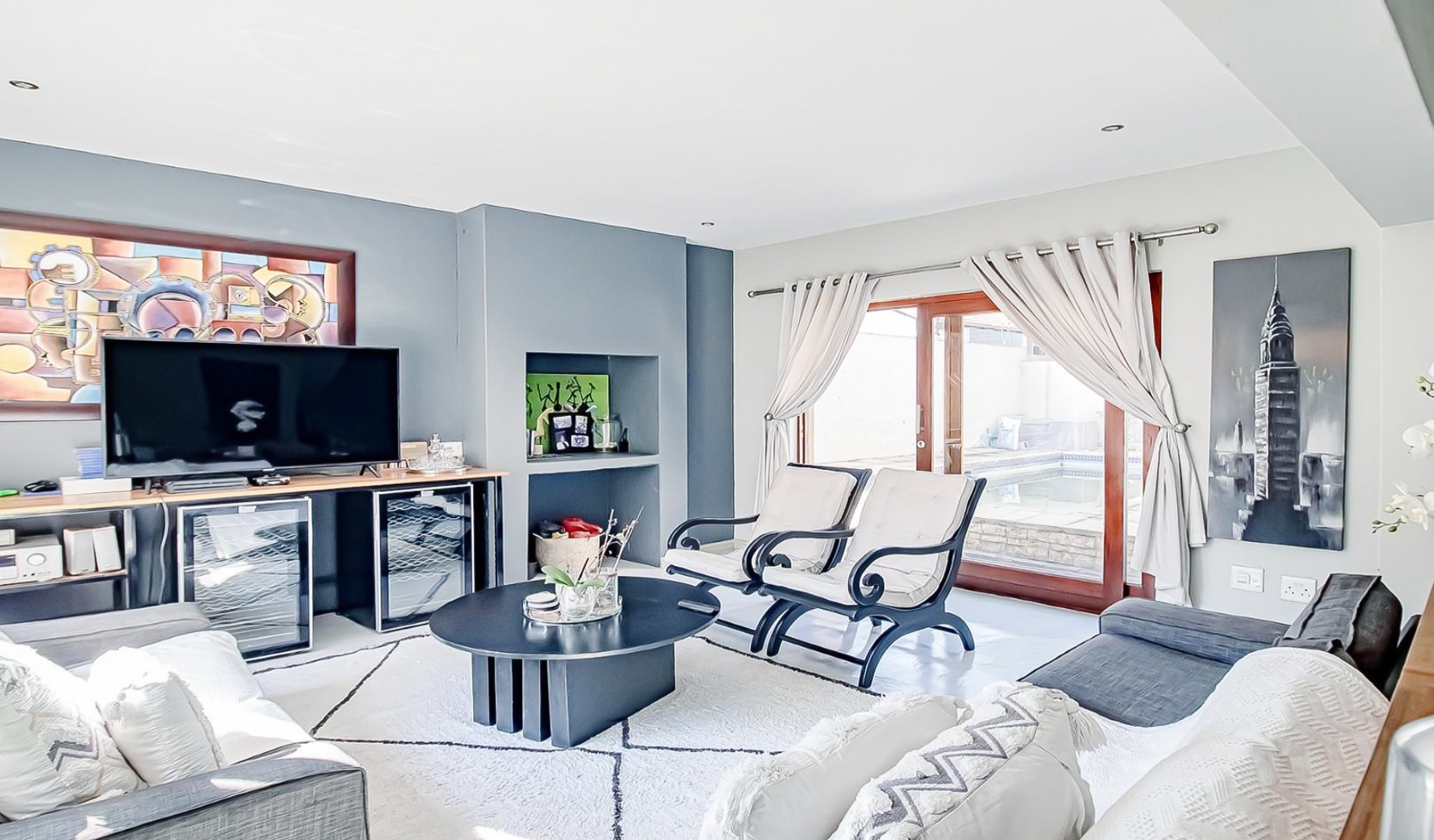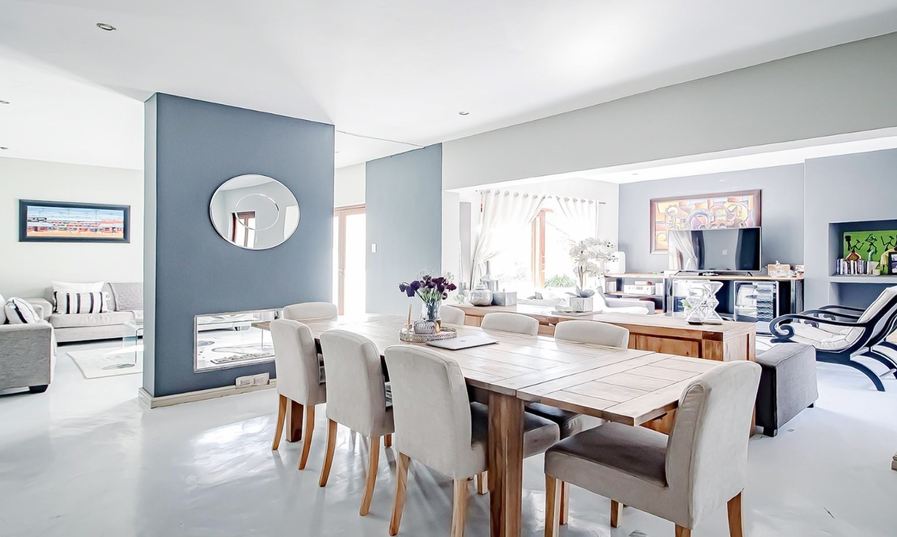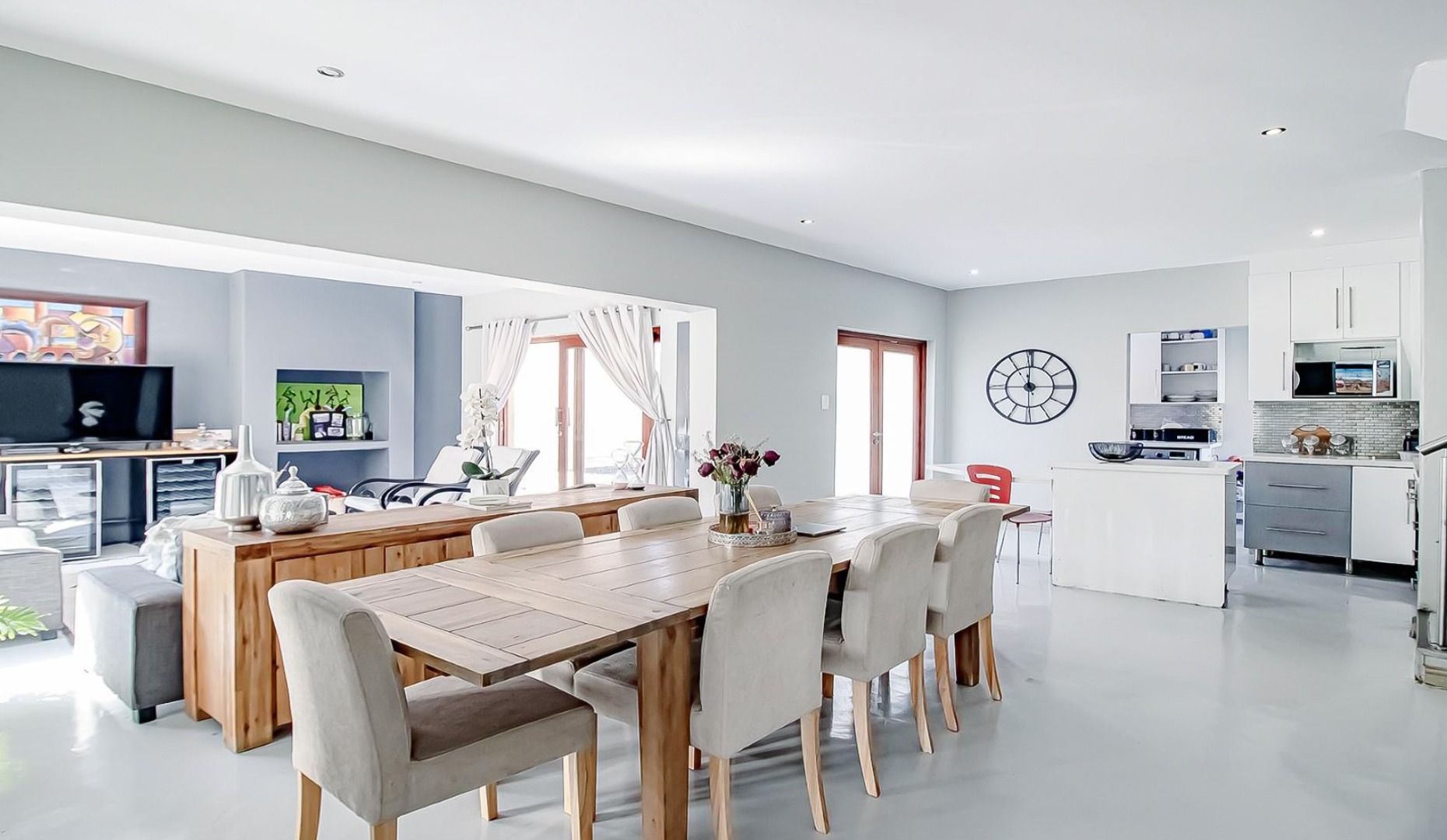 Open-plan dining and TV lounge flowing onto a sparkling swimming pool and beautifully maintained garden.