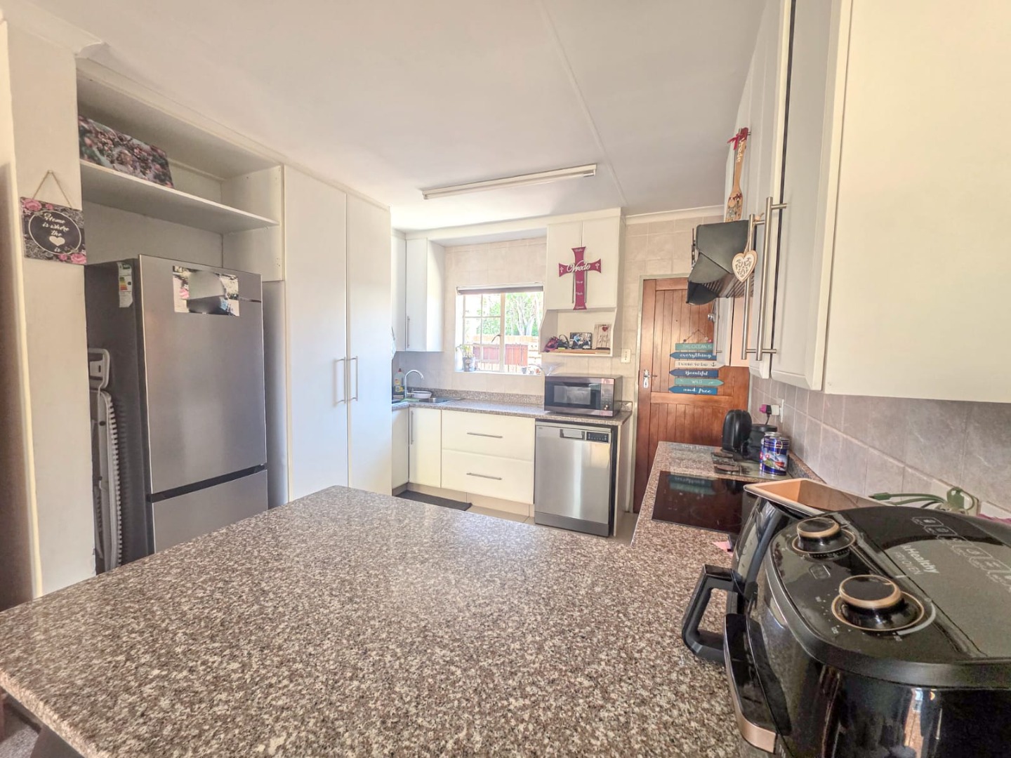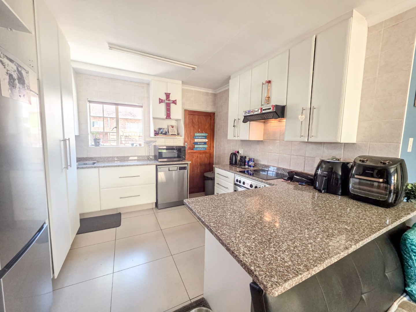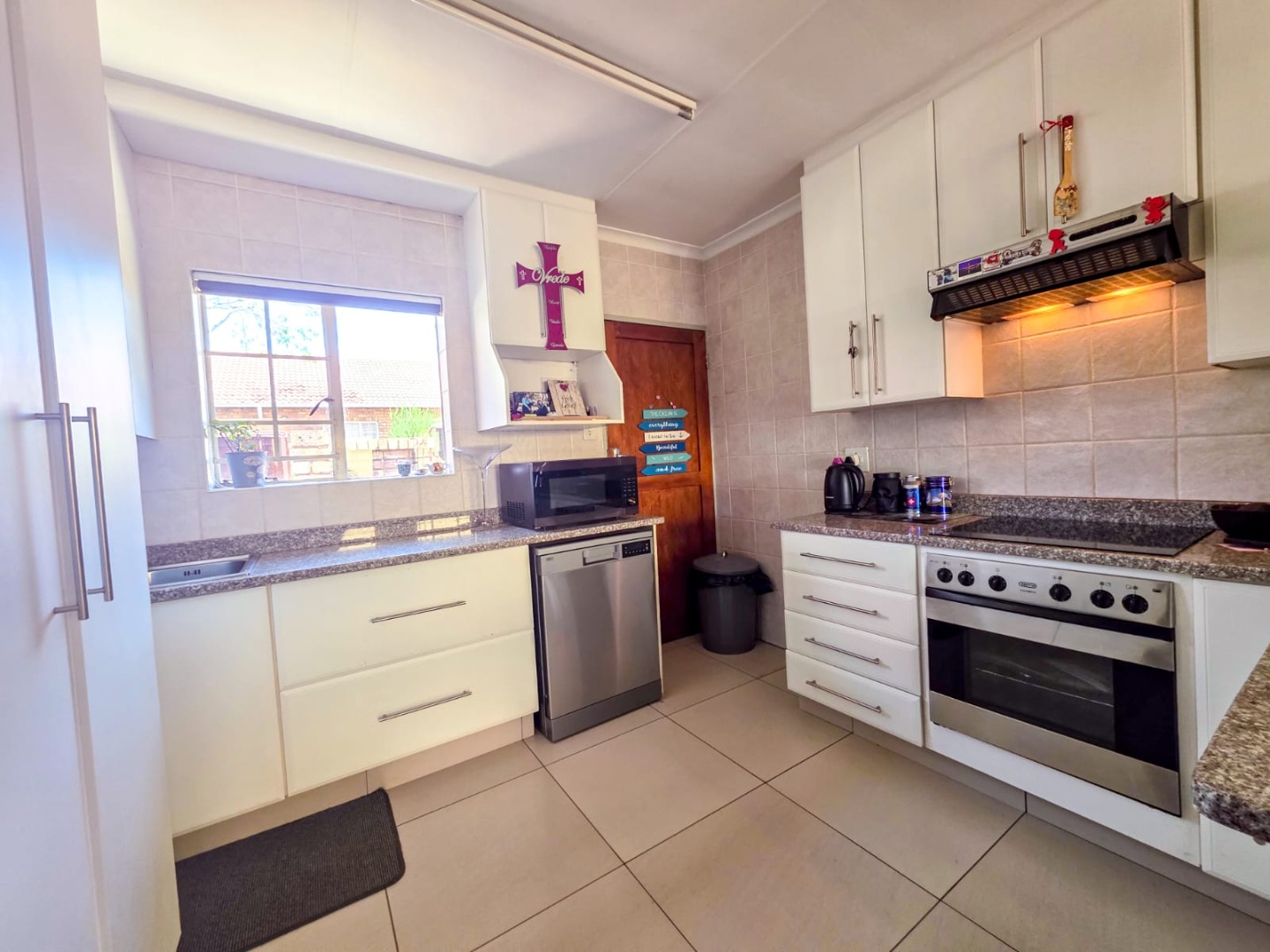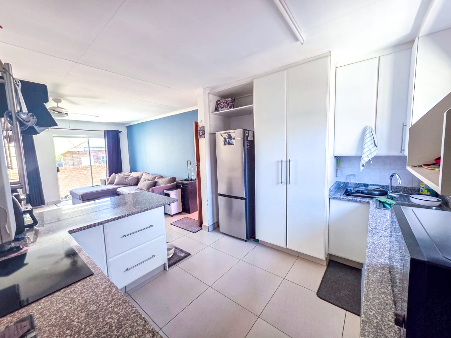 Discover modern comfort in this 90 sqm residence, nestled within a secure gated community in Amberfield, Centurion. The open-plan layout features a contemporary kitchen with white cabinetry, granite-look countertops, and integrated appliances. Natural light fills the spacious living area, which includes a ceiling fan and a sliding door opening to the private garden.