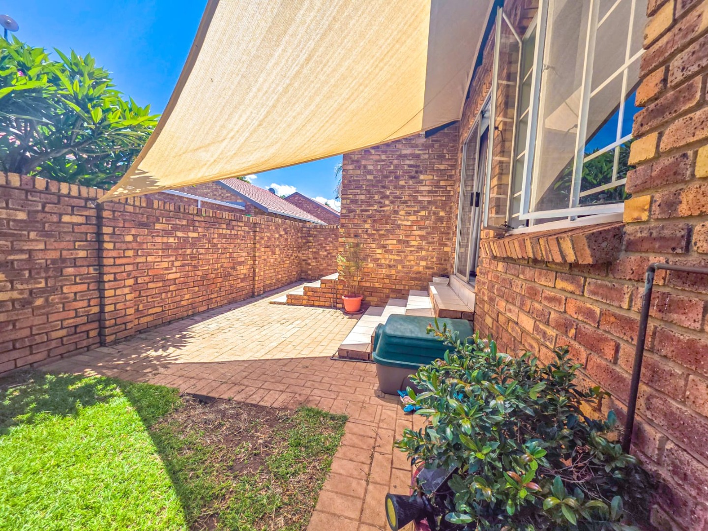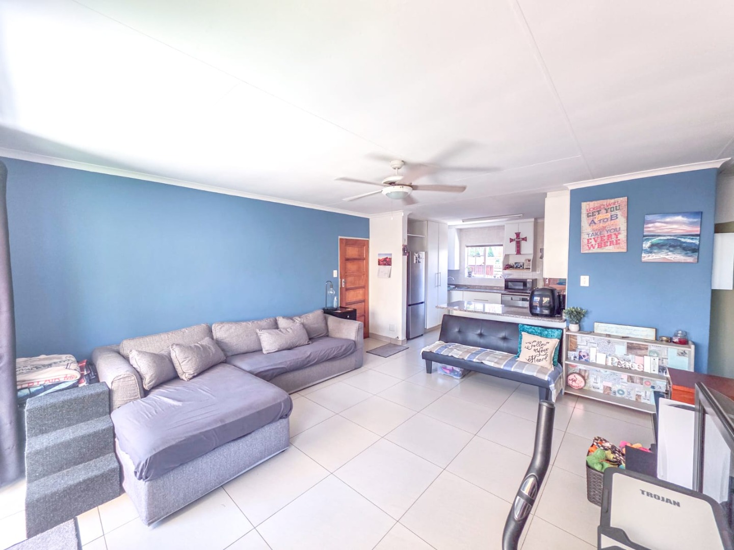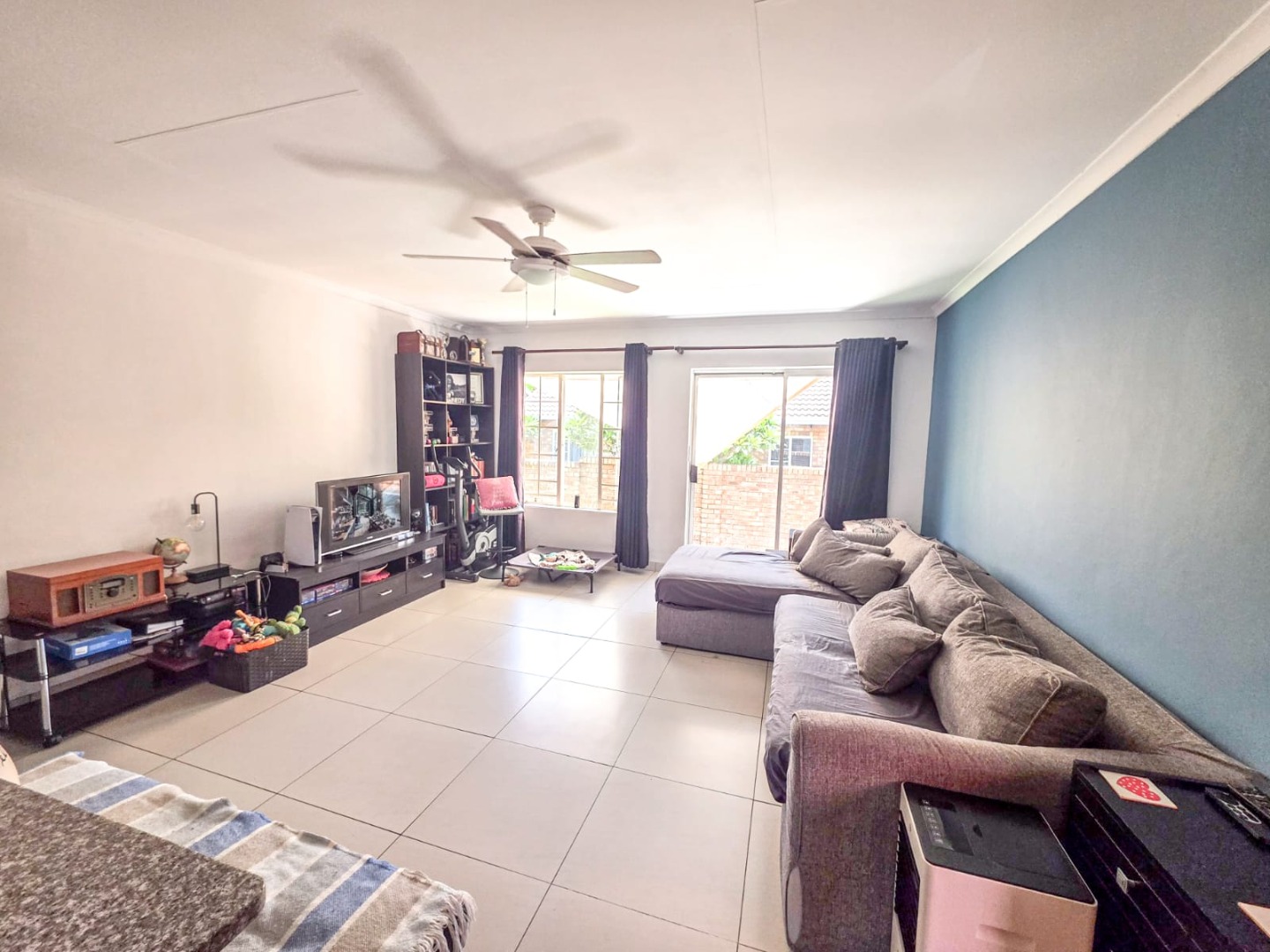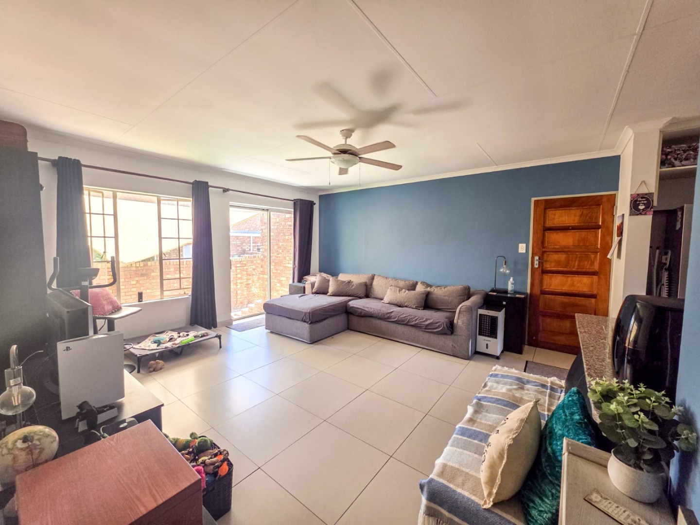 Discover modern comfort in this 90 sqm residence, nestled within a secure gated community in Amberfield, Centurion. The open-plan layout features a contemporary kitchen with white cabinetry, granite-look countertops, and integrated appliances. Natural light fills the spacious living area, which includes a ceiling fan and a sliding door opening to the private garden.