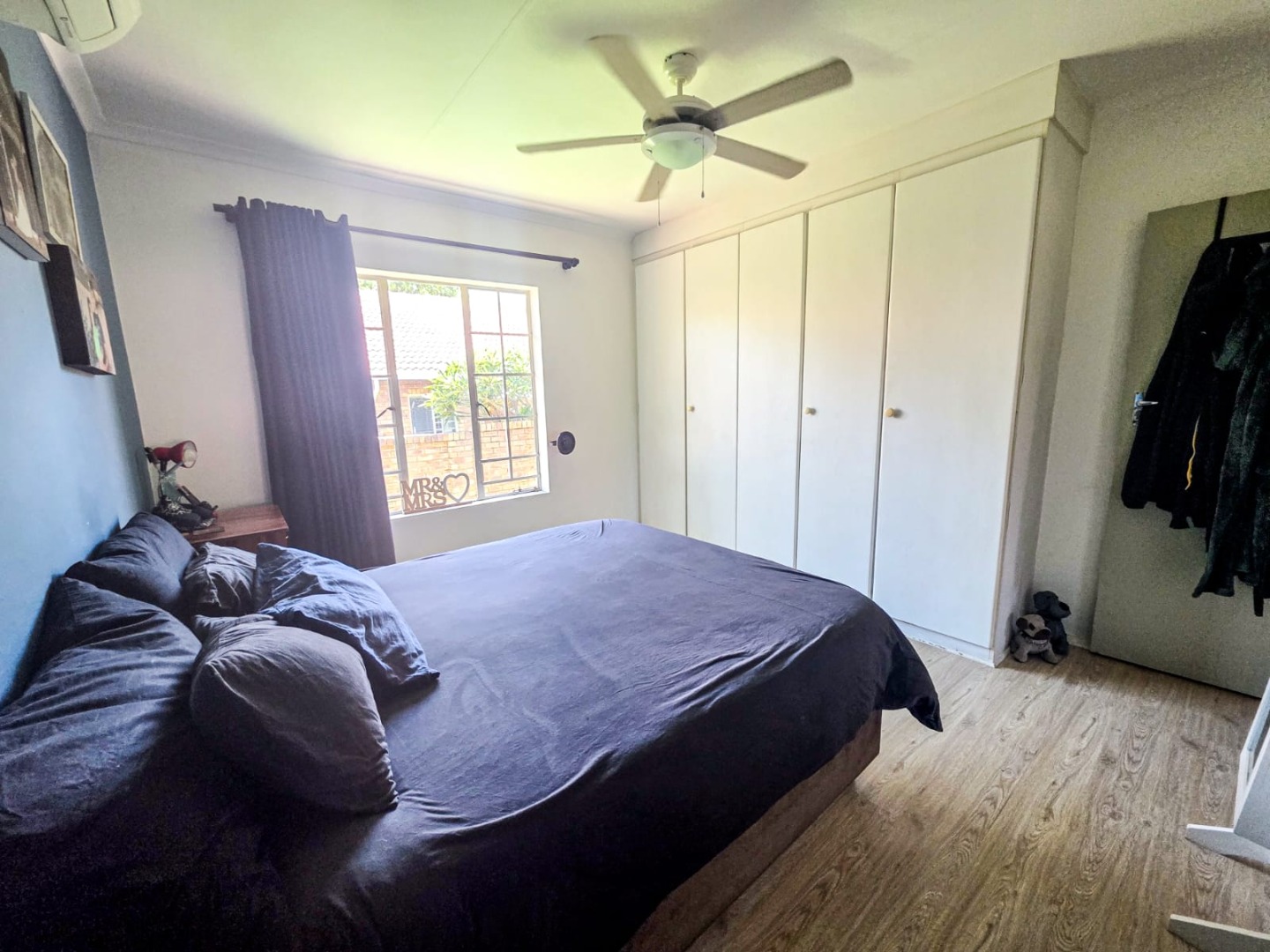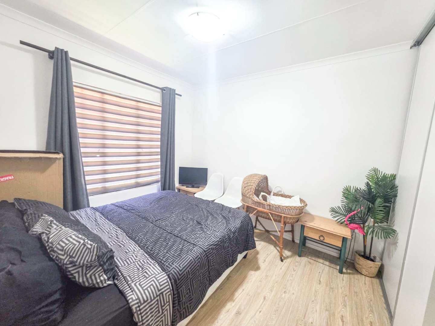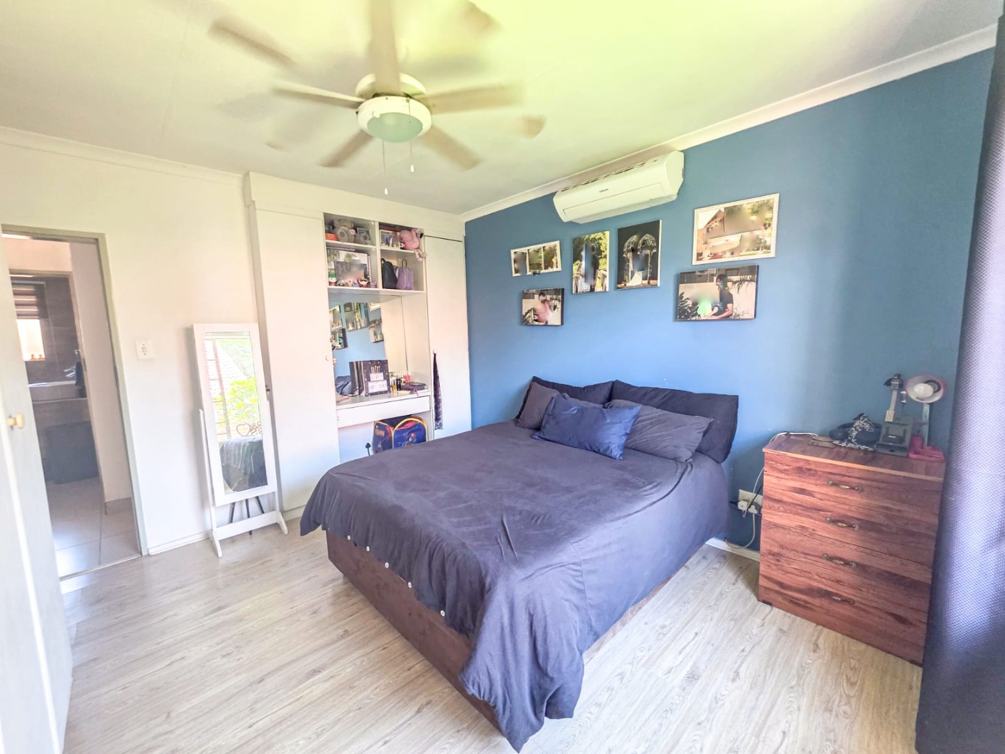 The home offers two comfortable bedrooms, each with durable laminate flooring, built-in wardrobes, integrated vanities, ceiling fans, and air conditioning for optimal climate control. A well-appointed bathroom serves these private quarters.