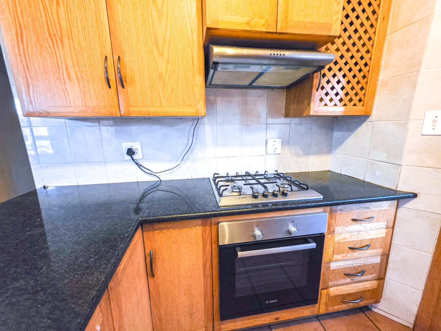 The living and dining areas are open plan and flow into a standard kitchen fitted with granite countertops and a gas stove. A separate scullery provides space for appliances and keeps the kitchen area functional and organised.
