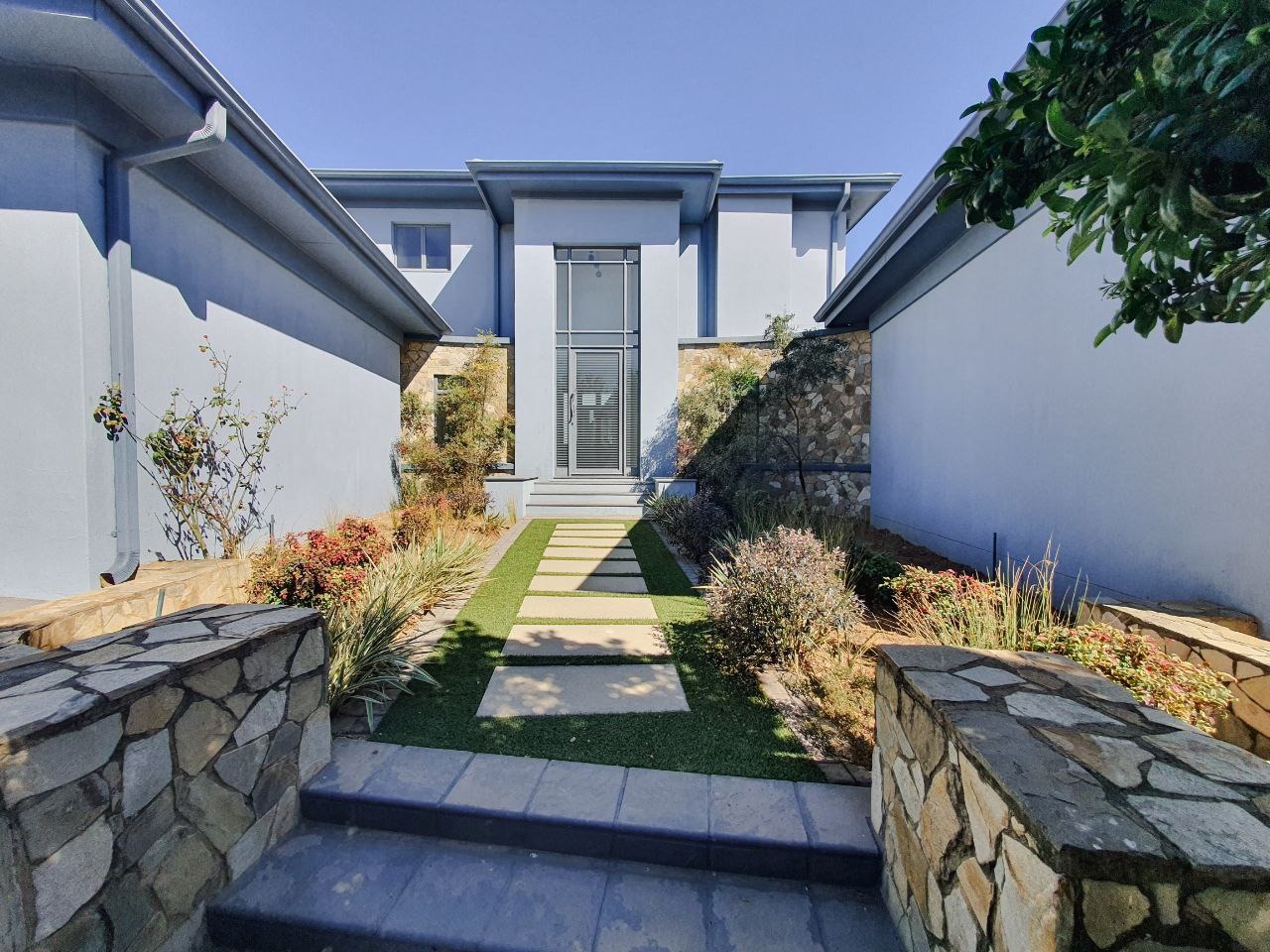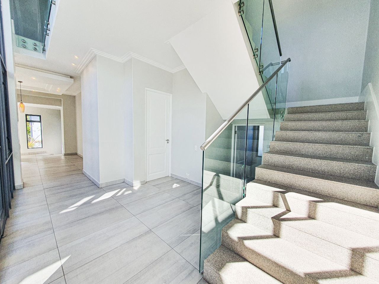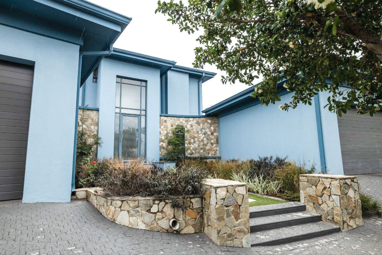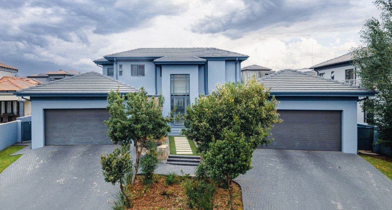 Nestled within the esteemed Blue Valley Golf Estate in Centurion, South Africa, this modern residence offers an exceptional lifestyle. The property immediately impresses with its contemporary architectural design, featuring a light blue/grey exterior, striking stone cladding accents, and a prominent central glass entrance. Paved driveways lead to two double garages, providing ample parking and storage for four vehicles, enhancing its curb appeal. Step inside to discover a bright and spacious interior, characterized by an open-plan layout and modern finishes. The elegant entryway boasts light-colored tiled flooring, stone steps, and a sleek glass and stainless steel railing, setting a sophisticated tone. The home features three distinct lounges and a dedicated dining room, offering versatile spaces for relaxation and entertaining. Large windows throughout ensure abundant natural light, creating an inviting atmosphere. This family-friendly home comprises four generously sized bedrooms, each benefiting from its own en-suite bathroom, ensuring privacy and comfort for all residents. A convenient guest toilet is also available. Practical amenities include a dedicated study, staff quarters, and additional storage, catering to diverse household needs. Outside, the property features a well-maintained garden with an irrigation system and a refreshing swimming pool, perfect for outdoor enjoyment. Sustainability and security are paramount, with solar panels, a battery inverter, and a gas geyser contributing to energy efficiency. A borehole ensures water resilience. Residents benefit from 24-hour security within this secure golf estate, which also offers access to a golf course, clubhouse, and tennis courts. Fibre connectivity is installed, providing high-speed internet. Key Features: * 4 Bedrooms, 4.5 Bathrooms (4 En-suite) * 4 Garages, Paved Driveways * 3 Lounges, 1 Dining Room, Open Plan Design * Swimming Pool, Irrigated Garden * Solar Panels, Battery Inverter, Gas Geyser, Borehole * Staff Quarters, Study, Storage * 24-Hour Security, Access Gate, Security Gate * Fibre Connectivity, Pets Allowed * Located in Blue Valley Golf Estate with Golf Course, Clubhouse, Tennis Court