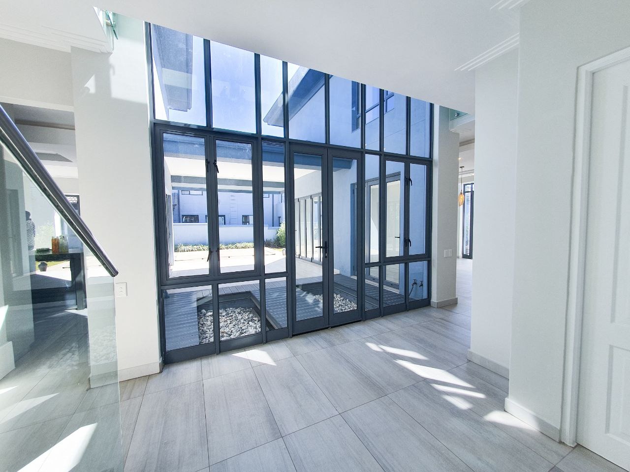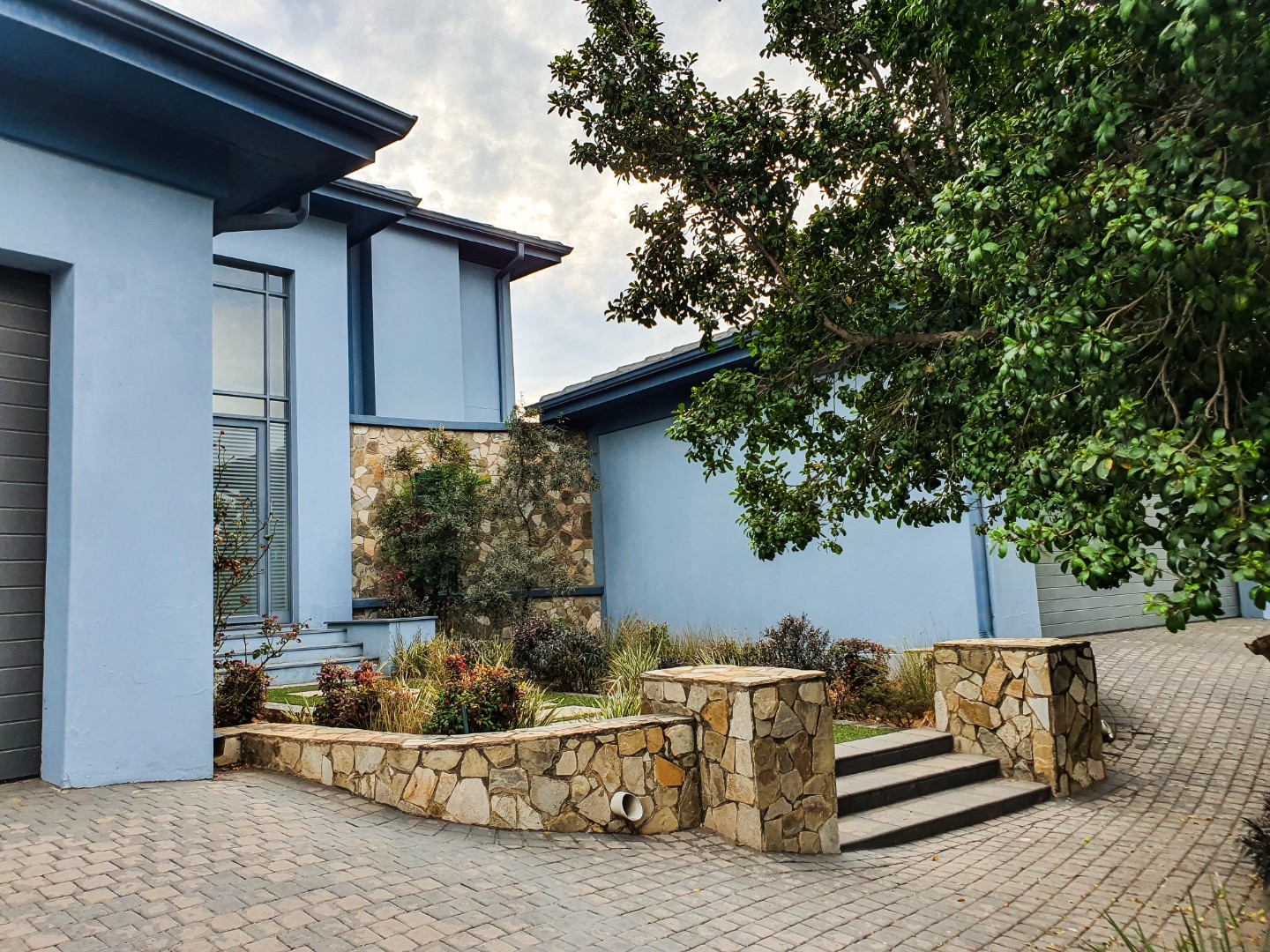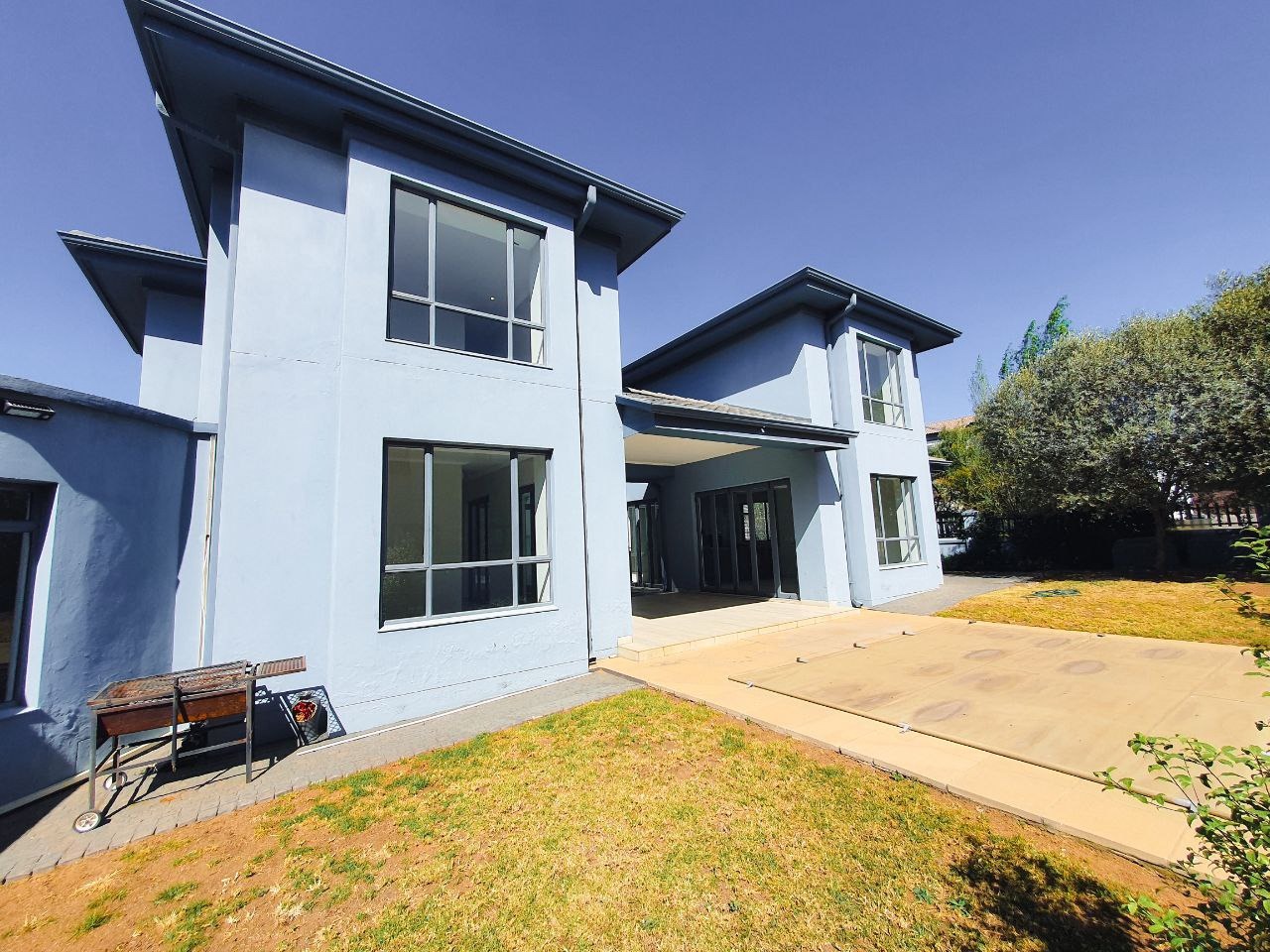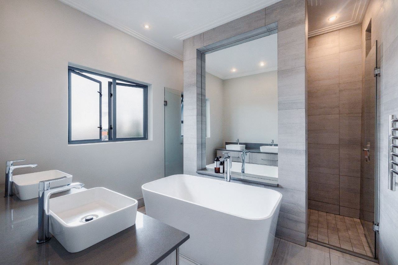 Nestled within the esteemed Blue Valley Golf Estate in Centurion, South Africa, this modern residence offers an exceptional lifestyle. The property immediately impresses with its contemporary architectural design, featuring a light blue/grey exterior, striking stone cladding accents, and a prominent central glass entrance. Paved driveways lead to two double garages, providing ample parking and storage for four vehicles, enhancing its curb appeal. Step inside to discover a bright and spacious interior, characterized by an open-plan layout and modern finishes. The elegant entryway boasts light-colored tiled flooring, stone steps, and a sleek glass and stainless steel railing, setting a sophisticated tone. The home features three distinct lounges and a dedicated dining room, offering versatile spaces for relaxation and entertaining. Large windows throughout ensure abundant natural light, creating an inviting atmosphere. This family-friendly home comprises four generously sized bedrooms, each benefiting from its own en-suite bathroom, ensuring privacy and comfort for all residents. A convenient guest toilet is also available. Practical amenities include a dedicated study, staff quarters, and additional storage, catering to diverse household needs. Outside, the property features a well-maintained garden with an irrigation system and a refreshing swimming pool, perfect for outdoor enjoyment. Sustainability and security are paramount, with solar panels, a battery inverter, and a gas geyser contributing to energy efficiency. A borehole ensures water resilience. Residents benefit from 24-hour security within this secure golf estate, which also offers access to a golf course, clubhouse, and tennis courts. Fibre connectivity is installed, providing high-speed internet. Key Features: * 4 Bedrooms, 4.5 Bathrooms (4 En-suite) * 4 Garages, Paved Driveways * 3 Lounges, 1 Dining Room, Open Plan Design * Swimming Pool, Irrigated Garden * Solar Panels, Battery Inverter, Gas Geyser, Borehole * Staff Quarters, Study, Storage * 24-Hour Security, Access Gate, Security Gate * Fibre Connectivity, Pets Allowed * Located in Blue Valley Golf Estate with Golf Course, Clubhouse, Tennis Court