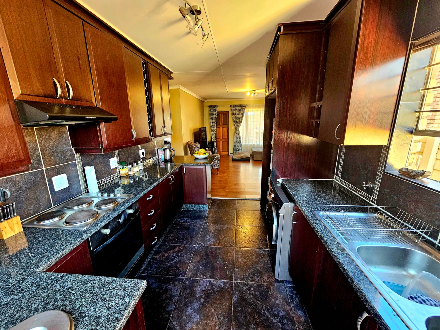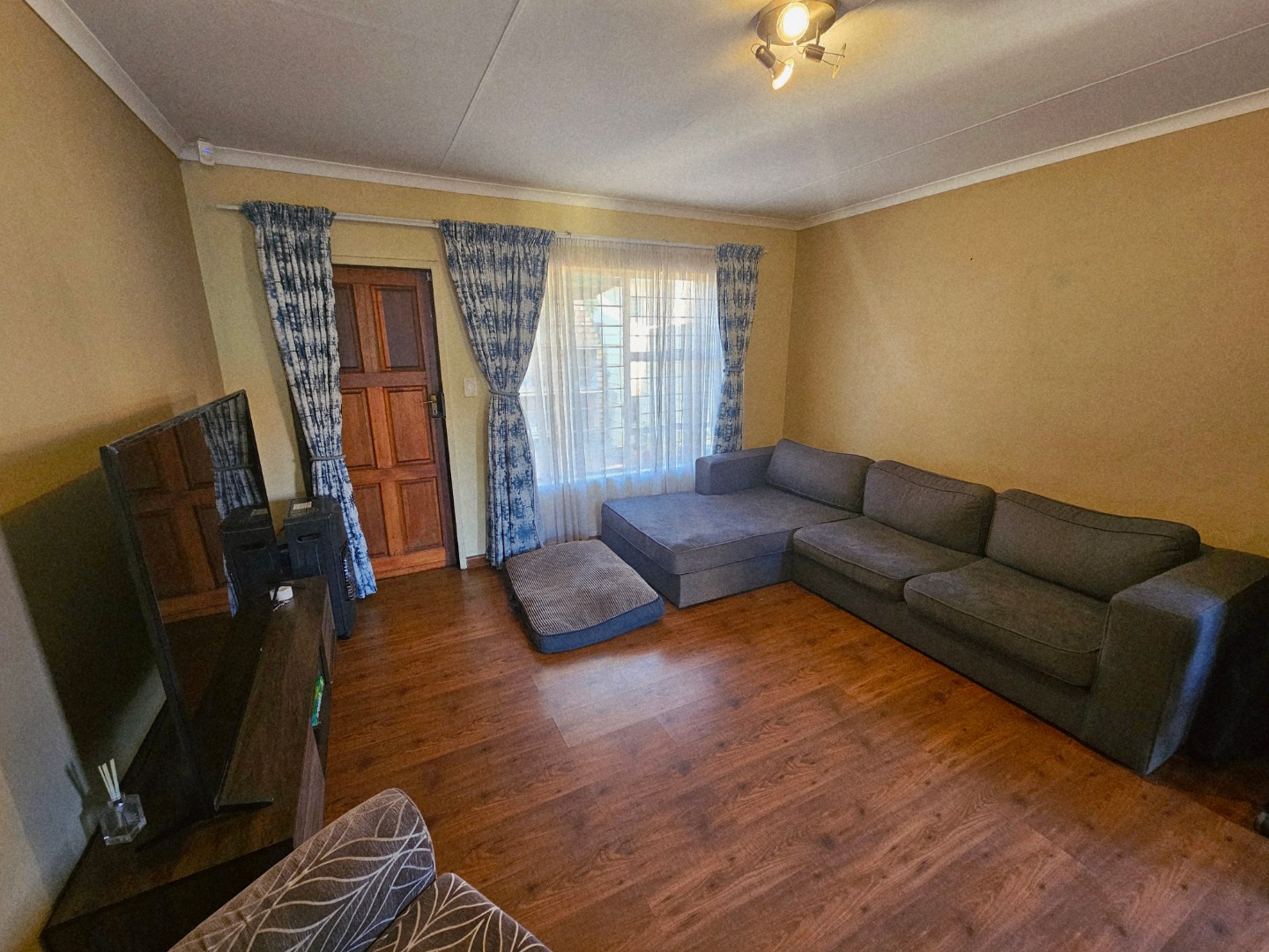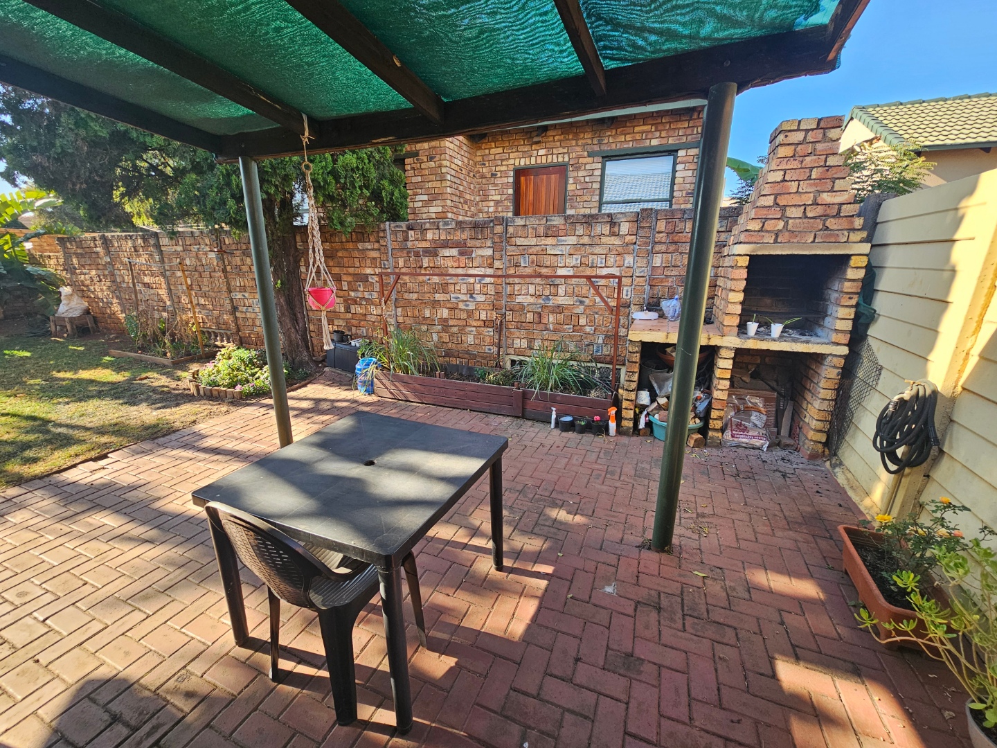 Lovely open plan living area and kitchen. The kitchen will be getting new oven installed with a new extractor fan. The living area also walks out onto an open patio area. There is a build in braai and quite a nice space for garden which wraps around the unit, so ample garden space for pets to have space to run around.