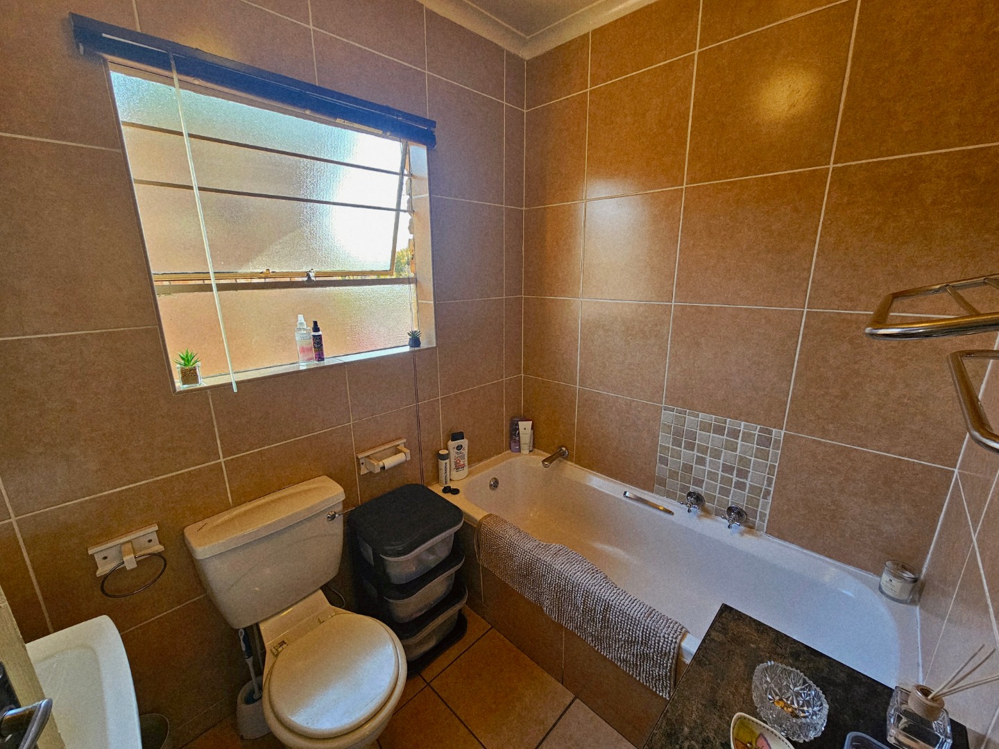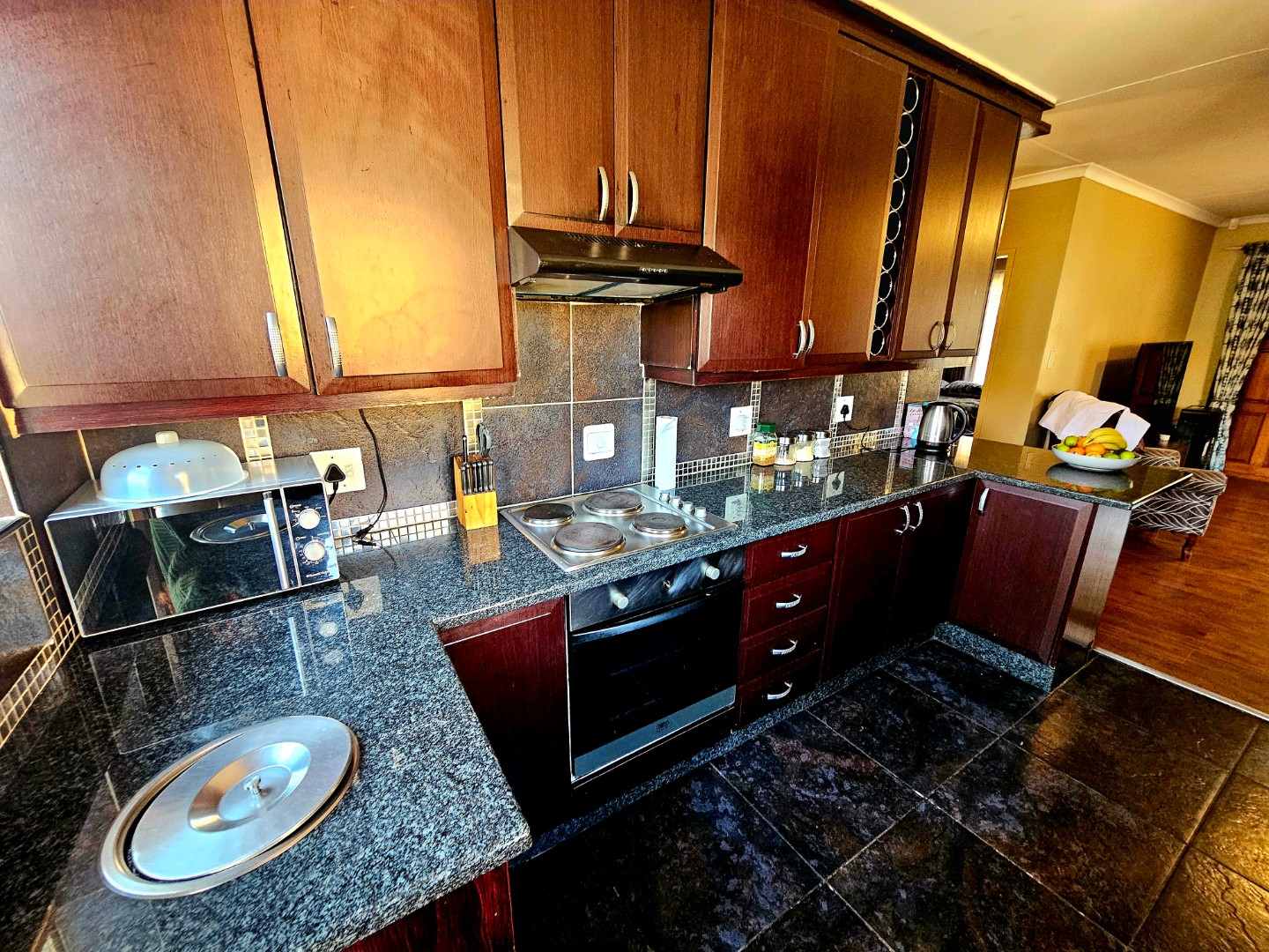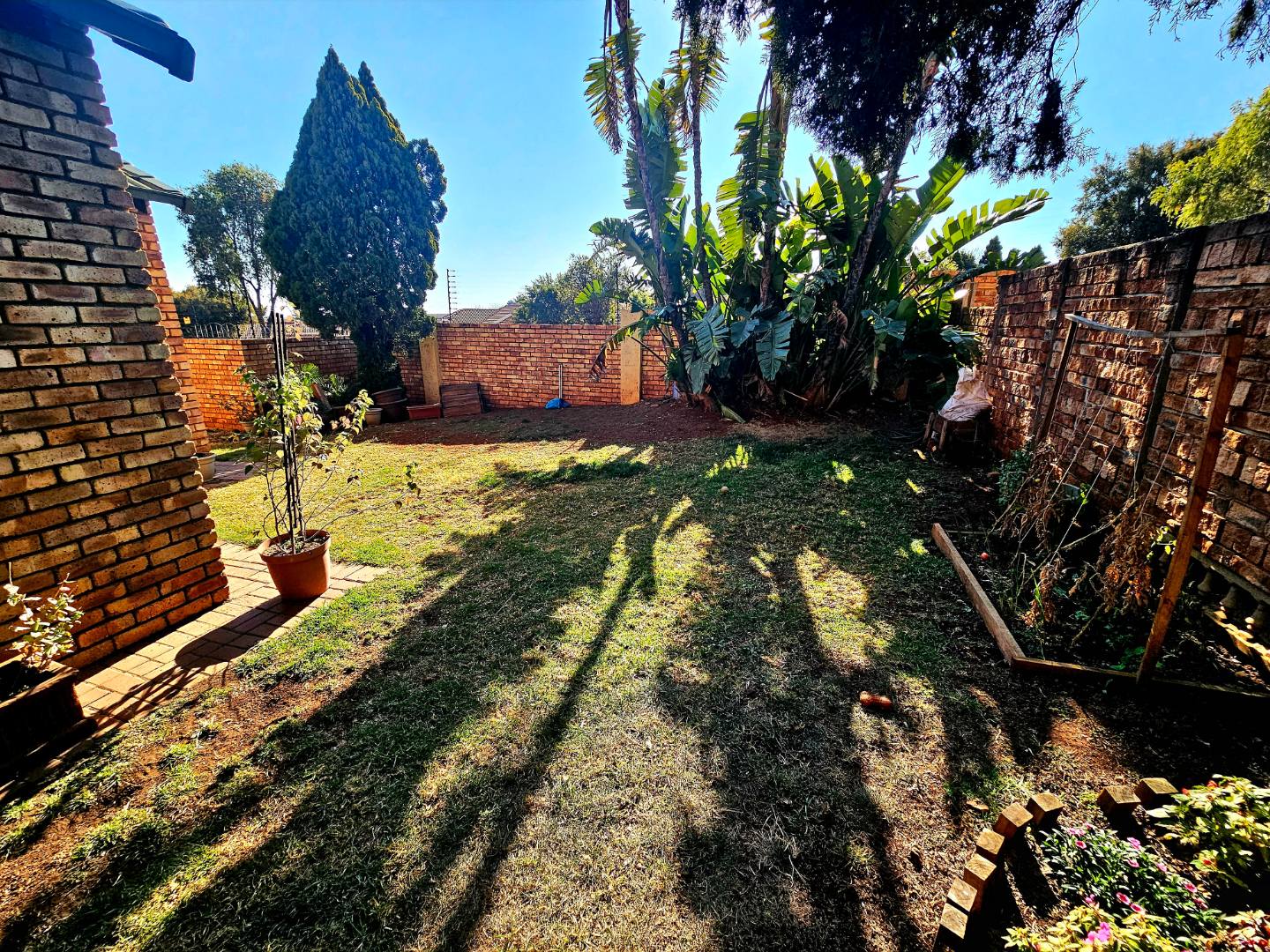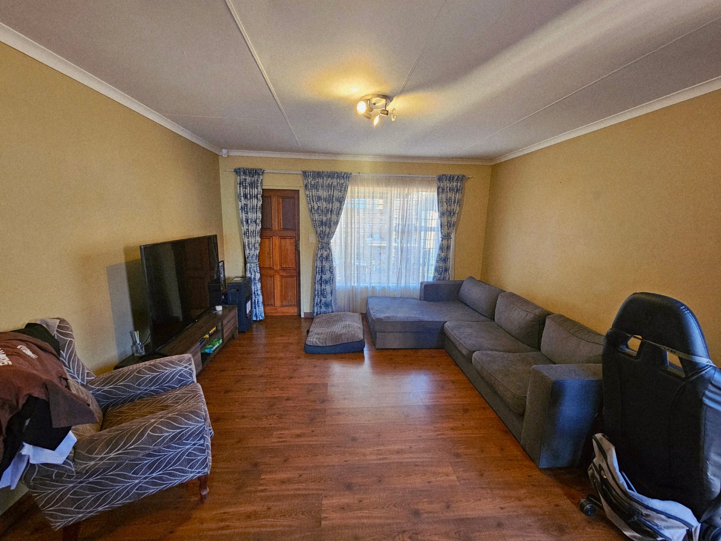 Lovely open plan living area and kitchen. The kitchen will be getting new oven installed with a new extractor fan. The living area also walks out onto an open patio area. There is a build in braai and quite a nice space for garden which wraps around the unit, so ample garden space for pets to have space to run around.