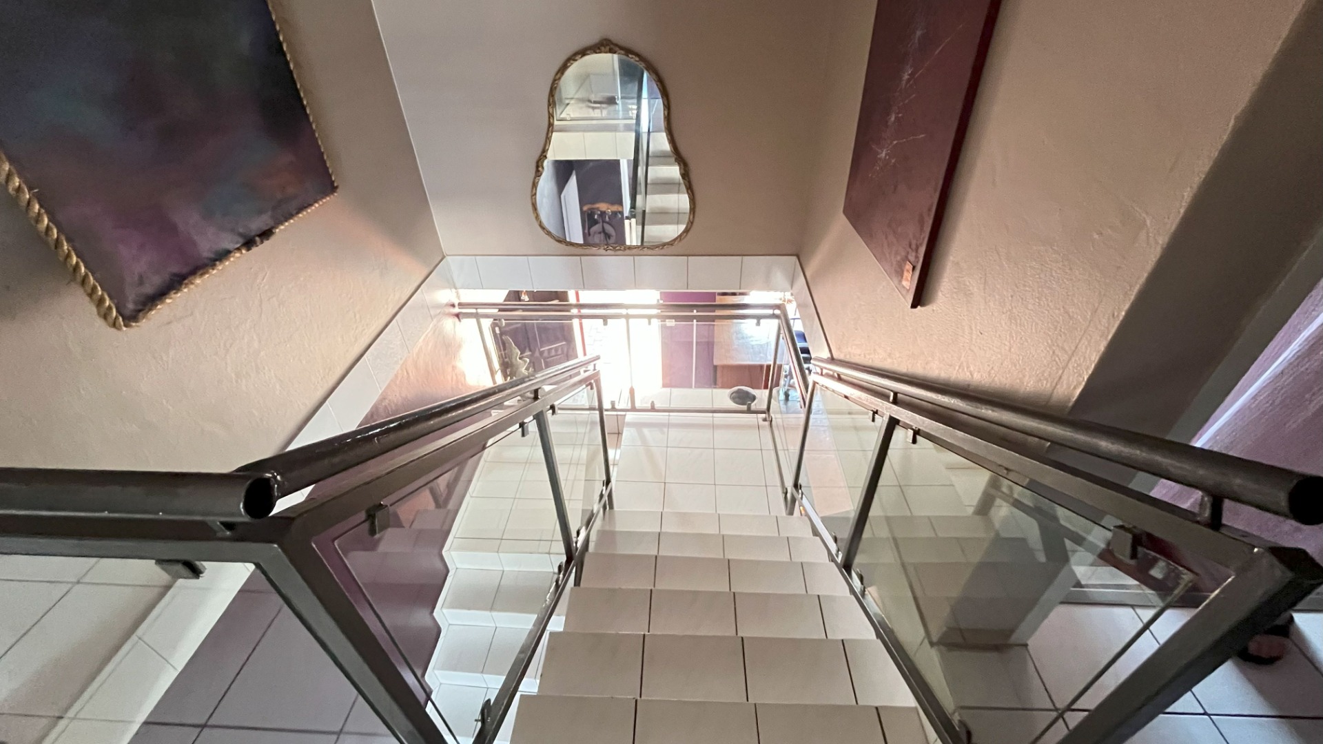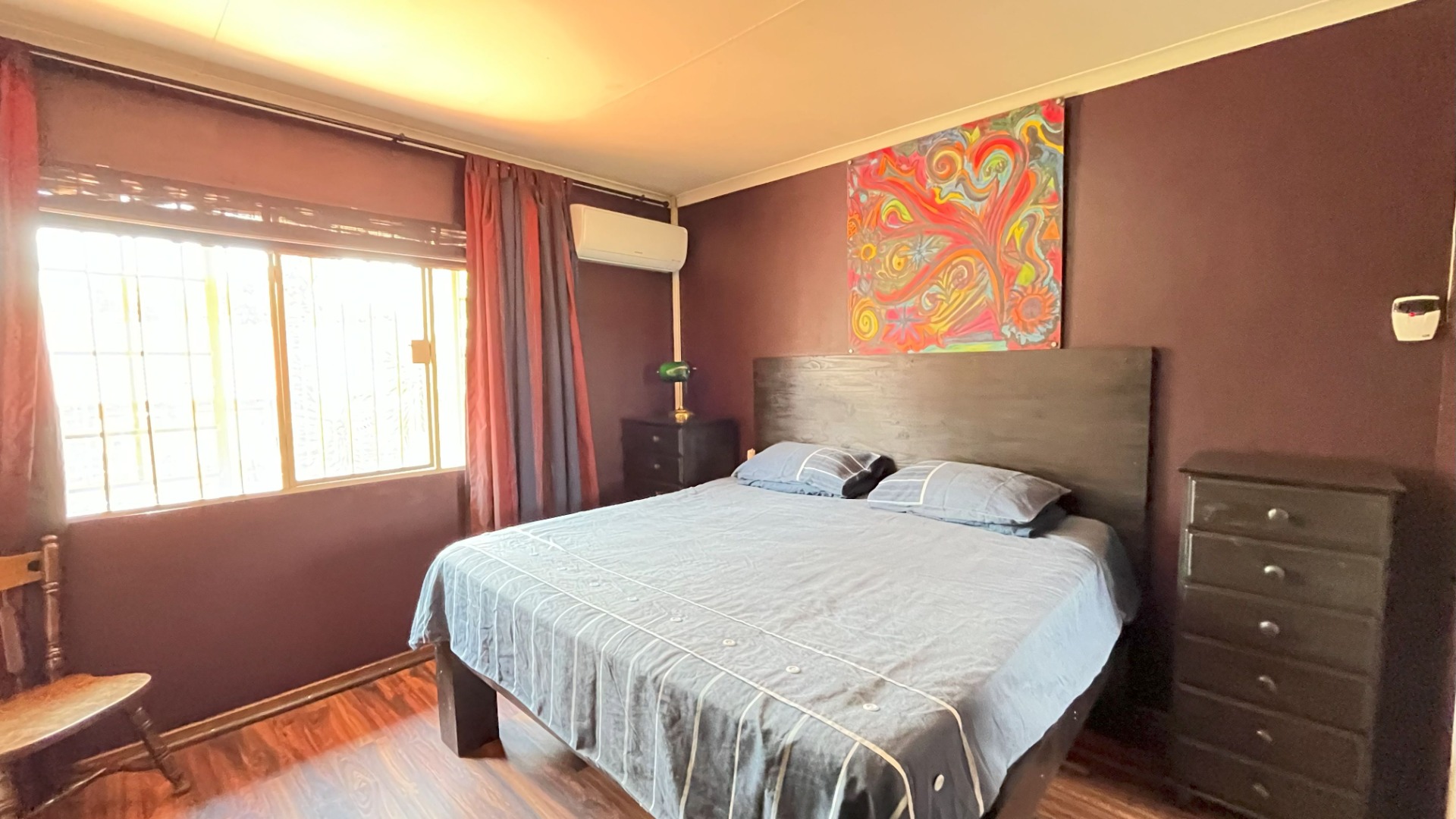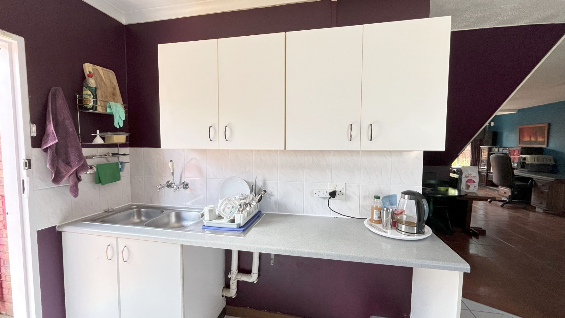 Step inside and you’ll find a welcoming layout that connects the lounge and dining areas, making it super easy to entertain or just relax. The kitchen is a real highlight, featuring ample white cabinetry, a handy island, and a built-in stove with an extractor fan. You'll notice the distinctive dark purple walls here, adding a touch of character, and there's even direct access to the outdoors. The living space continues this vibrant theme with bold teal and purple walls and terracotta floor tiles, plus a modern staircase with glass railings that adds a stylish touch. You’ll also appreciate the air conditioning for those warmer days. Convenient guest toilet downstairs.