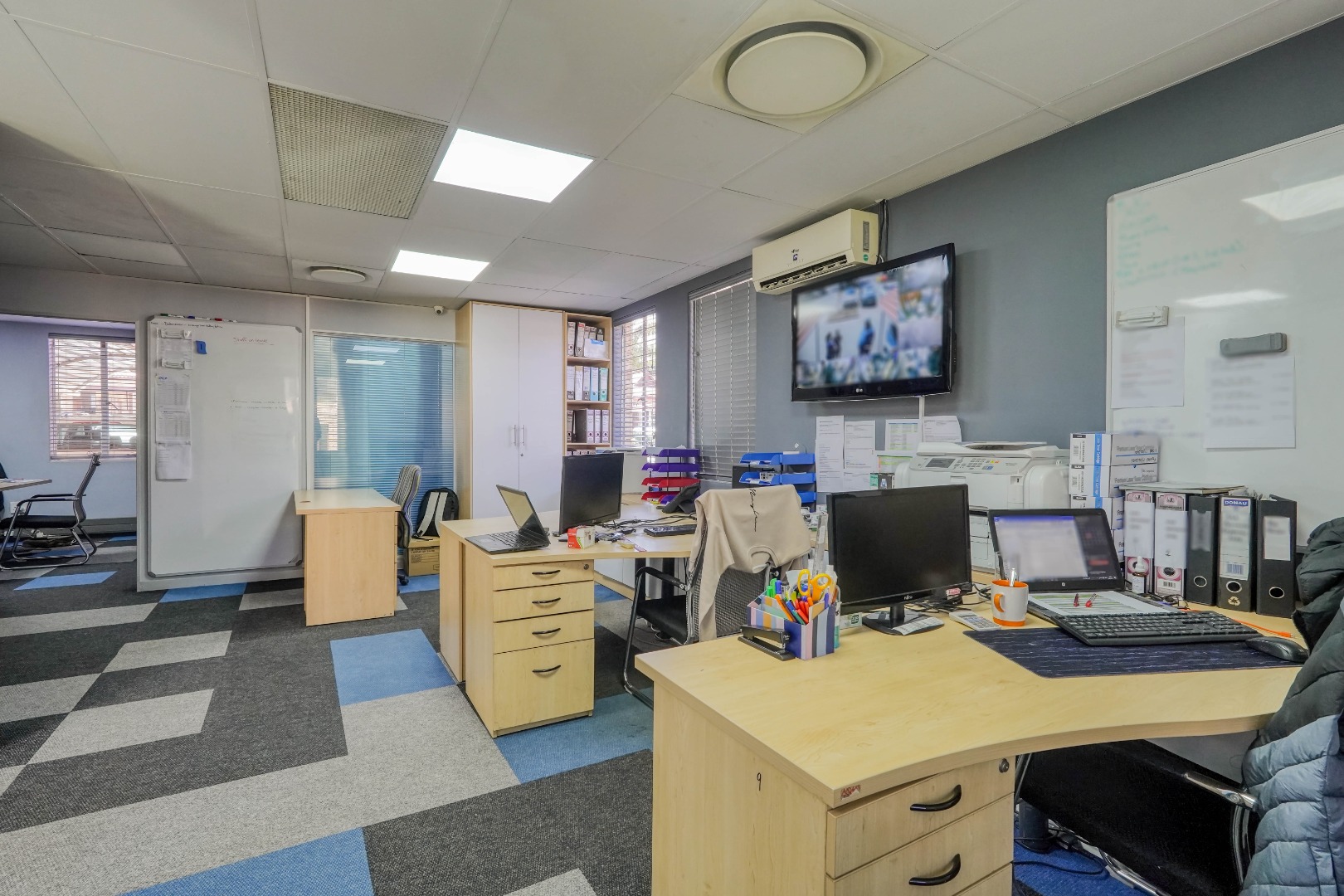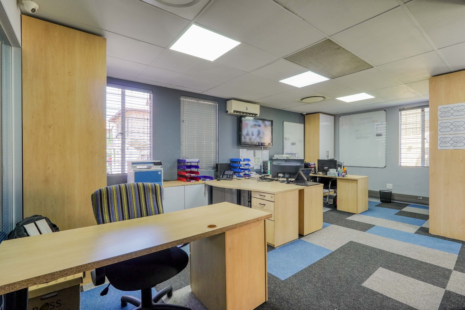 All office areas throughout the building are fitted with durable industrial carpeting, providing a professional and comfortable working environment.