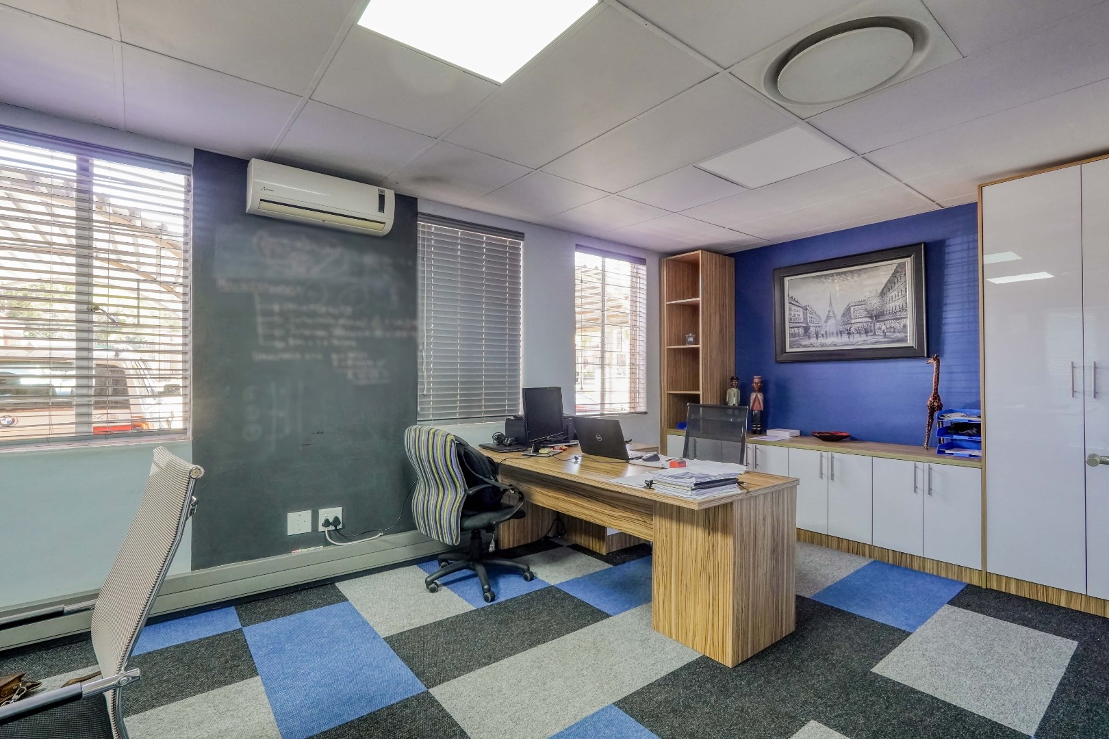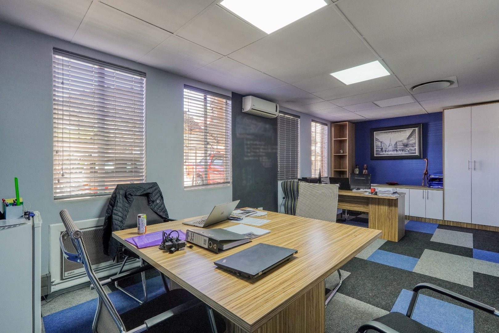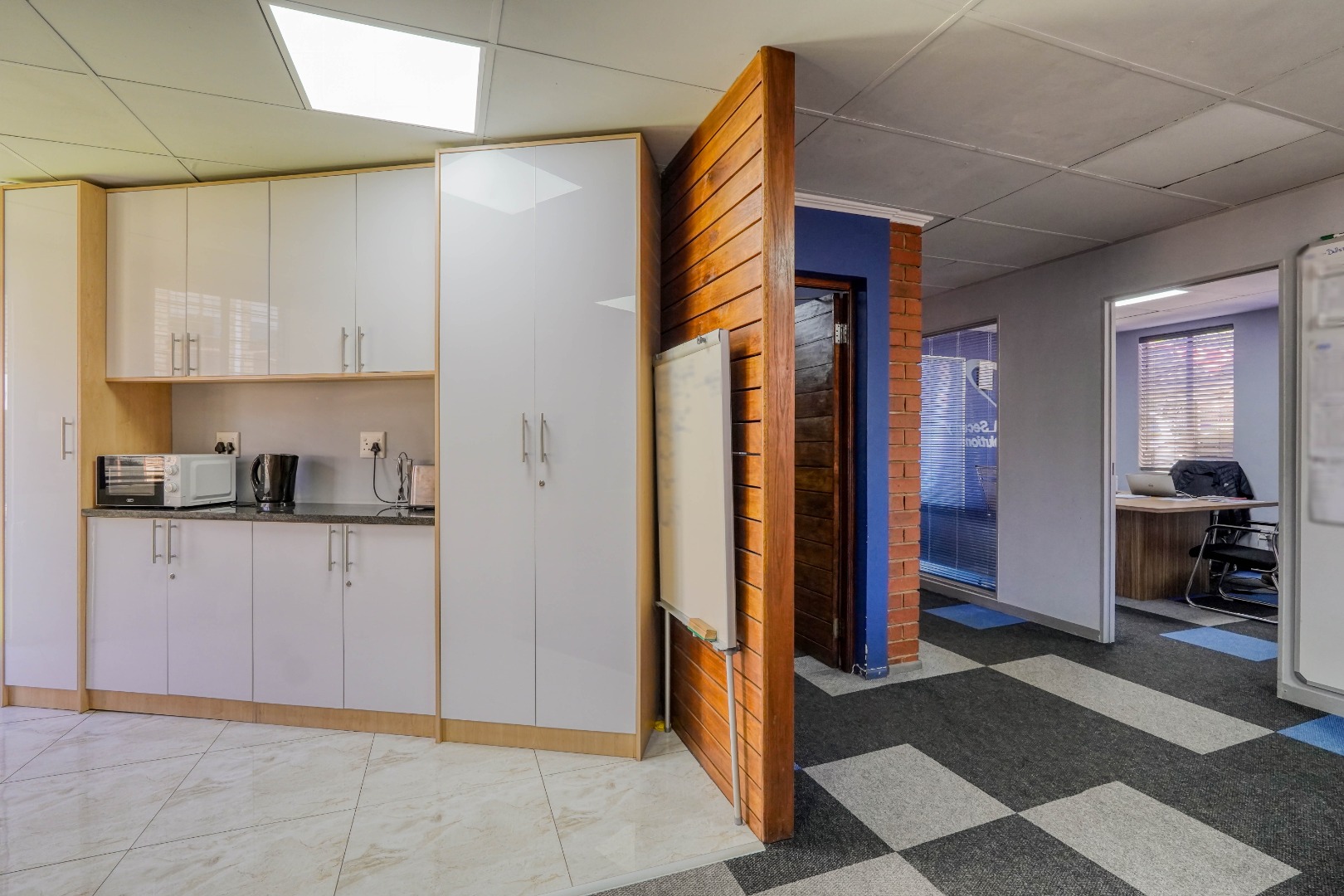 Further inside, the layout opens into a larger shared office area that comfortably fits three desks and built in cupboards, creating a collaborative workspace. Adjacent to this area is a compact kitchen fitted with tiled flooring, built in cupboards, and granite countertops, providing a neat and functional break area.