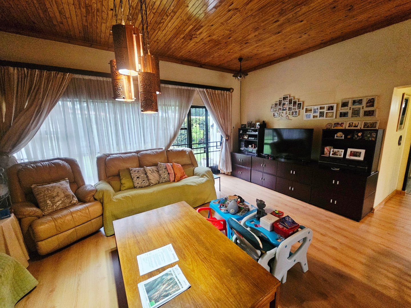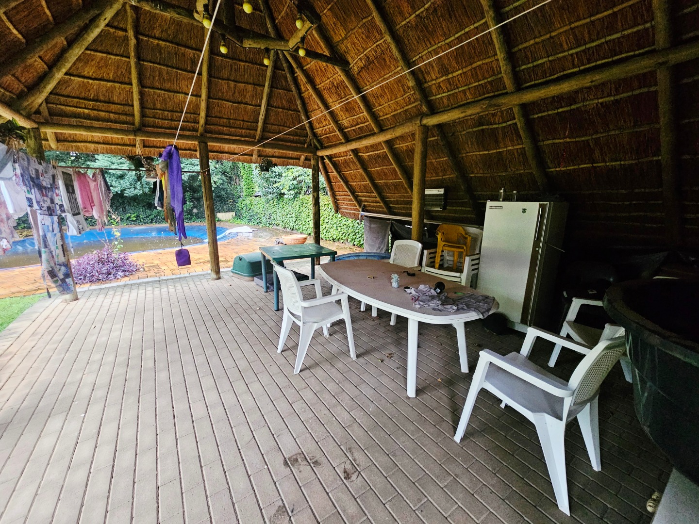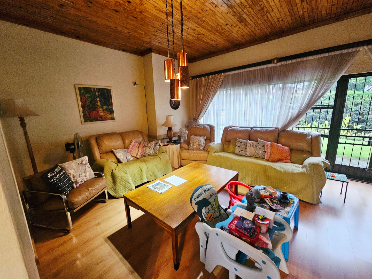 A dedicated study offers flexibility, easily repurposed as a fourth bedroom if needed. Parking is plentiful with a double garage and ample space outside, all secured behind automated gates. Step outside to discover practical extras—a store room and an outdoor toilet, plus a large Lapa shaded by the garden and a generously sized pool, perfect for relaxation and gatherings.
