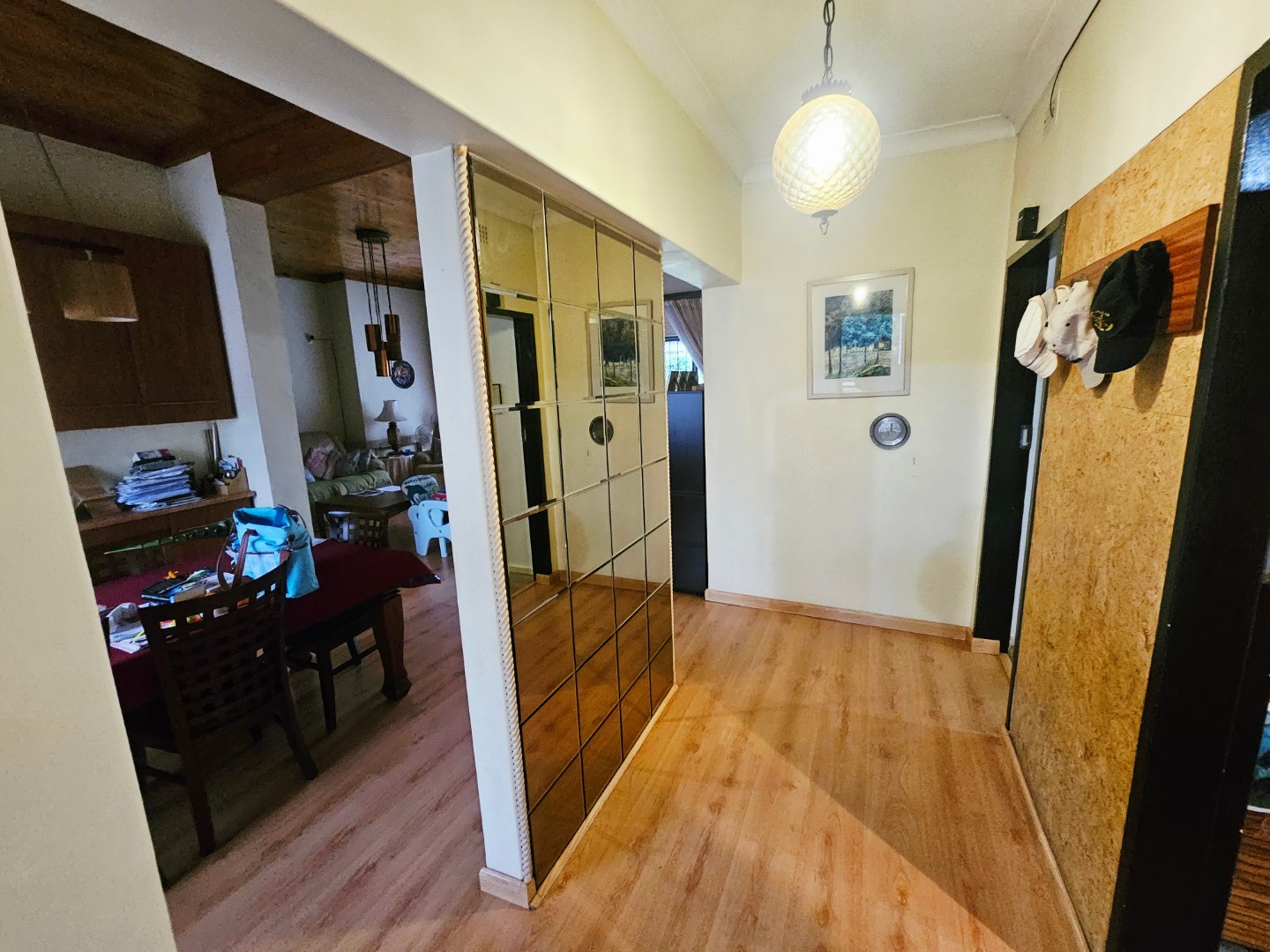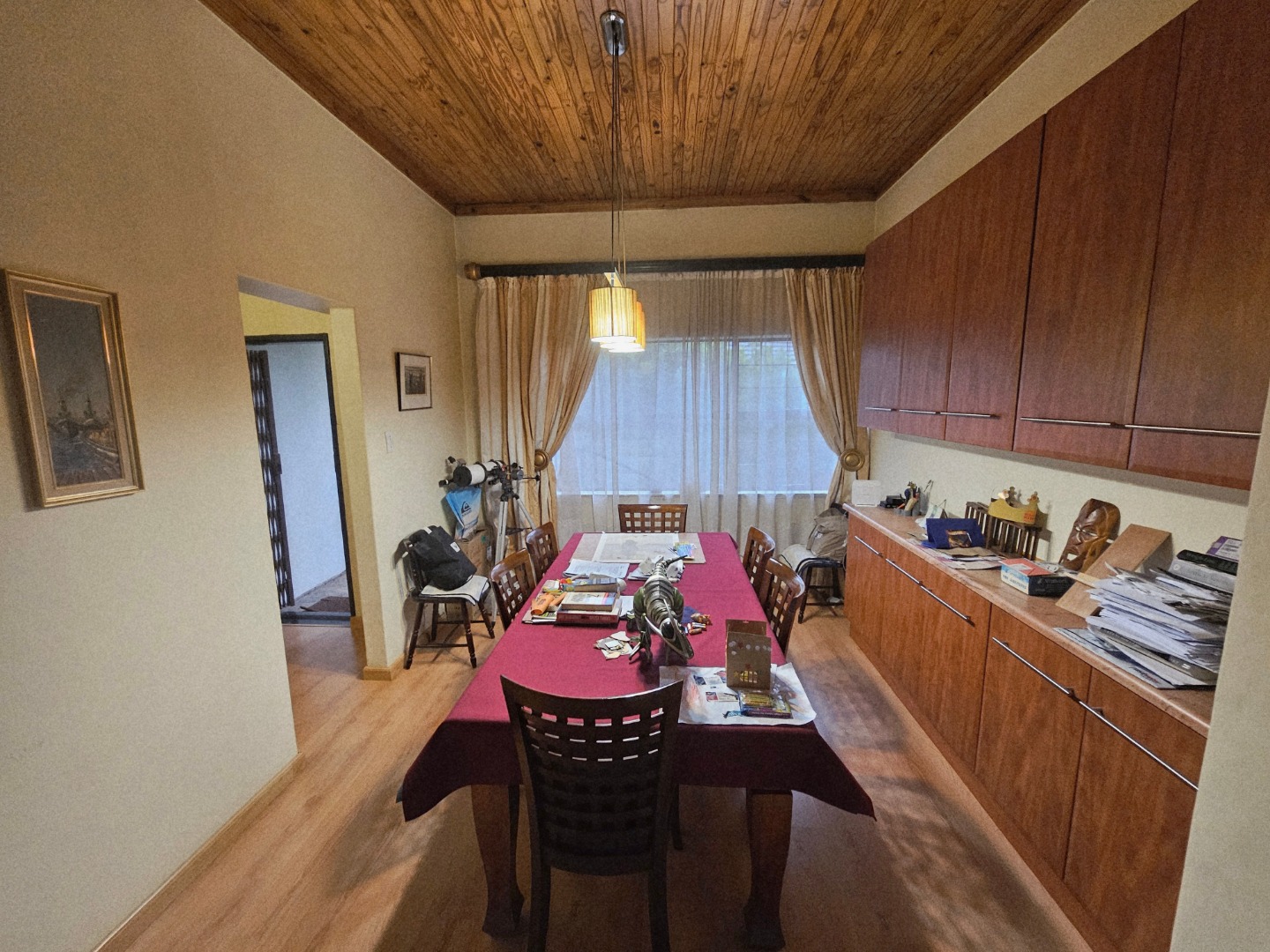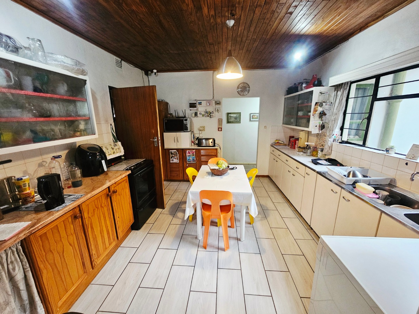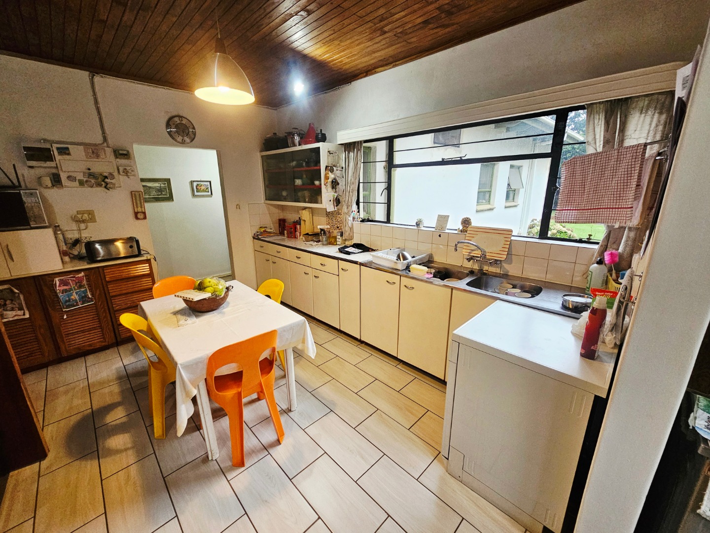 The heart of the home is its open-plan layout, where the TV room and dining area melt into one cohesive living space. French doors from the TV room open onto the garden, inviting the outdoors in and creating a seamless flow for everyday living and entertaining. An inviting entrance hall guides you toward the dining area and kitchen, a practical and sociable space where abundant cupboard storage and a scullery await.