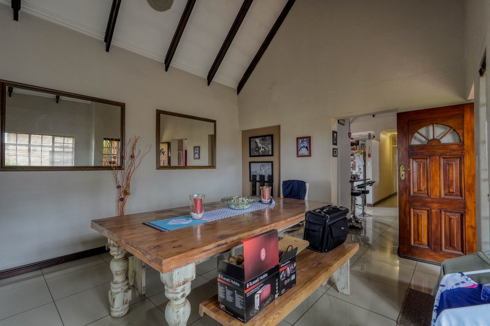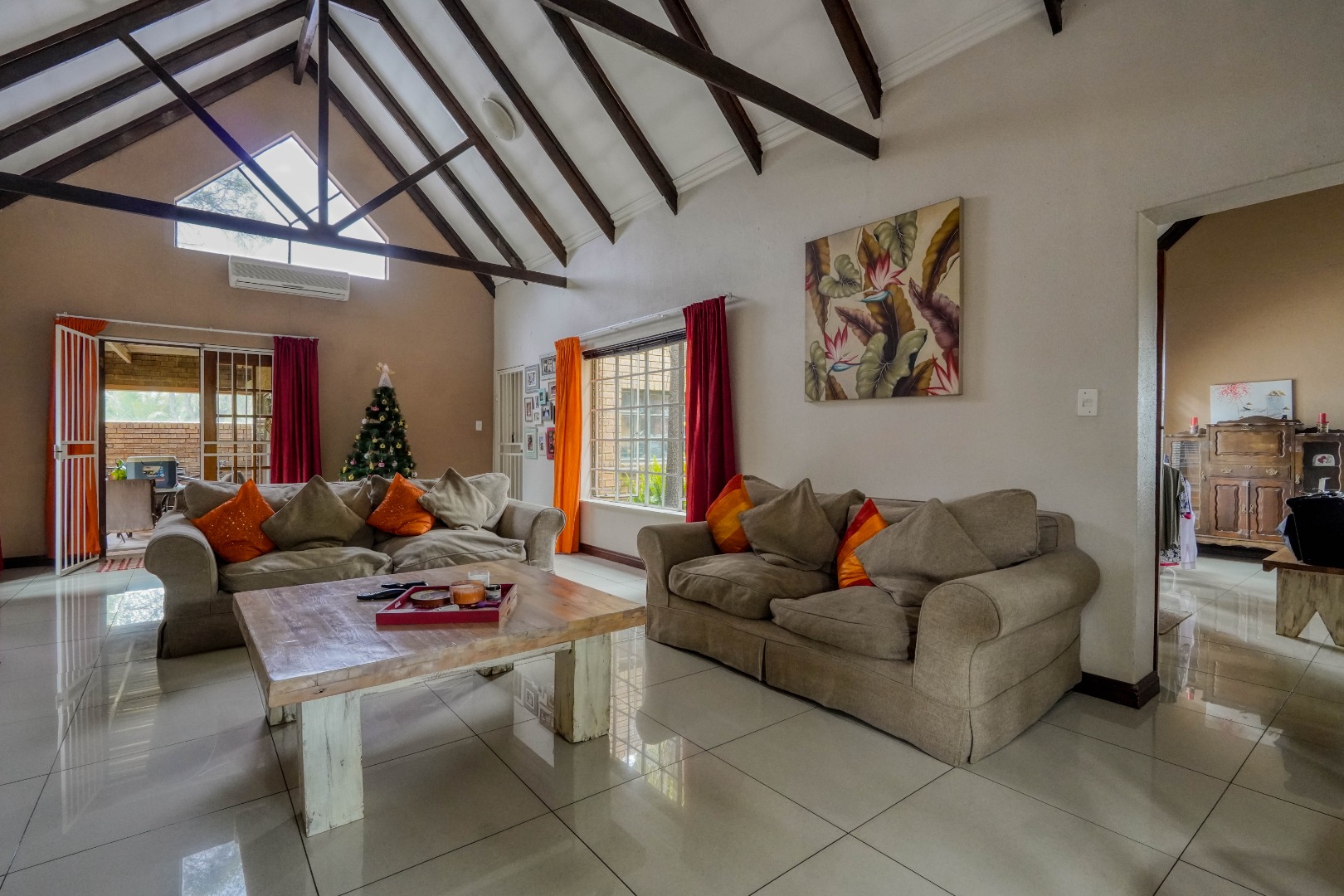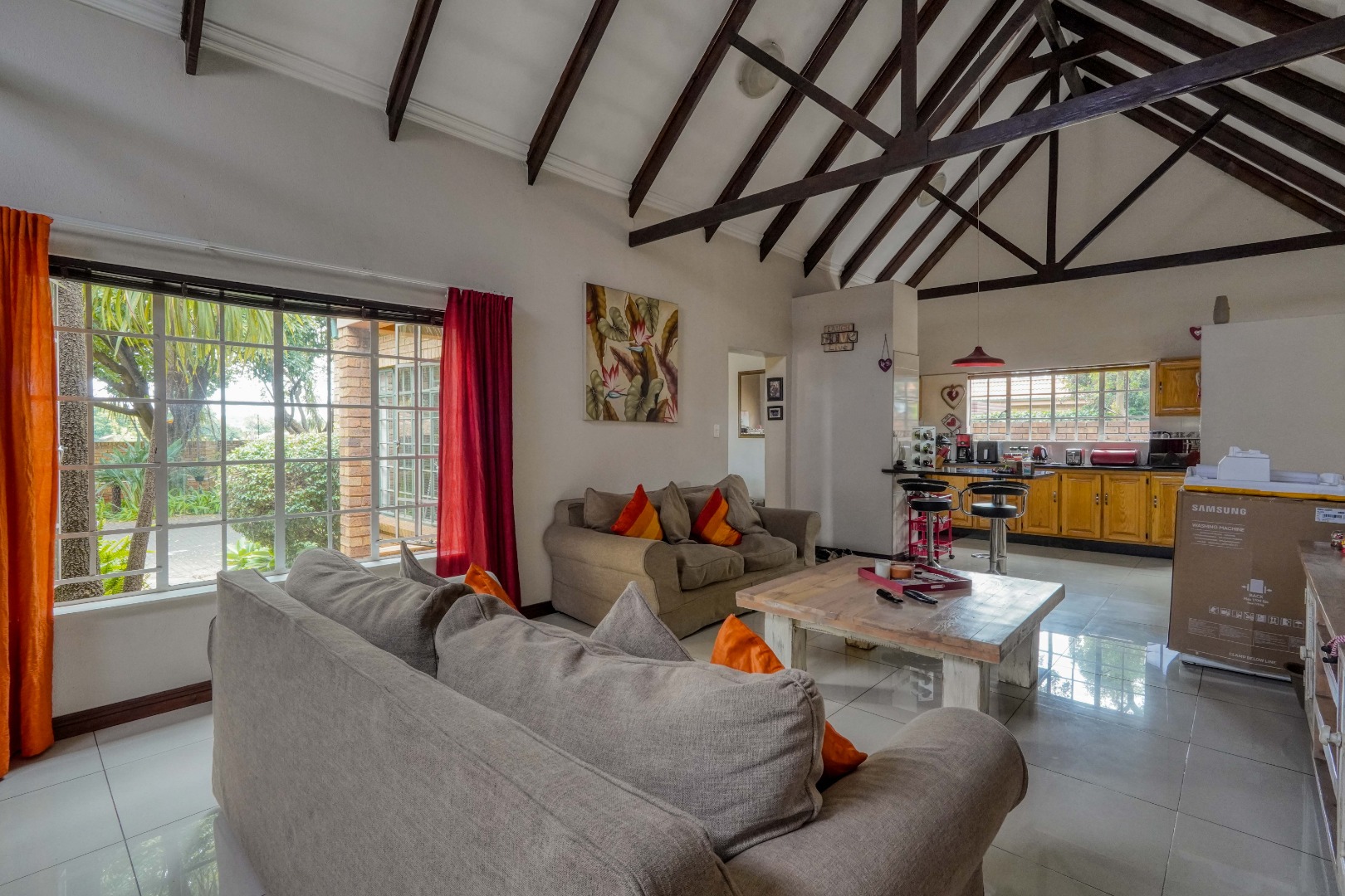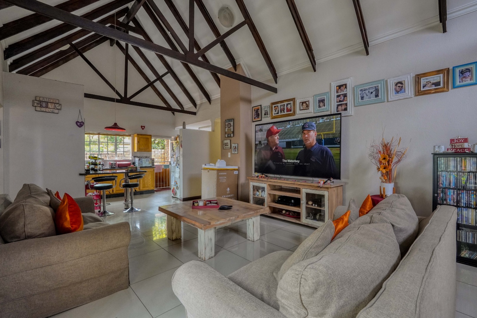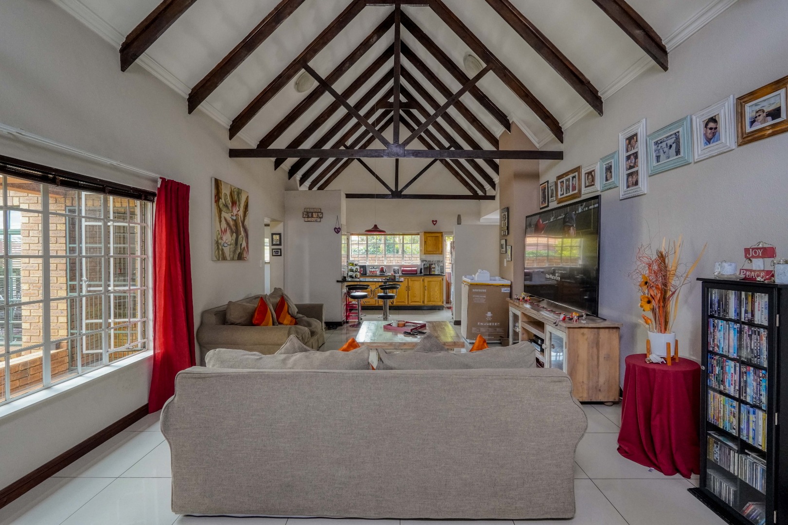 From the front door, you step into a spacious entrance hall that is large enough to function as a dining area, creating a welcoming first impression. This space flows effortlessly into the lounge, where an open-plan layout brings everything together. On the left, the kitchen features a breakfast nook and a separate scullery, while the rest of the lounge opens up to the right, creating a generous central living space ideal for everyday living and entertaining.