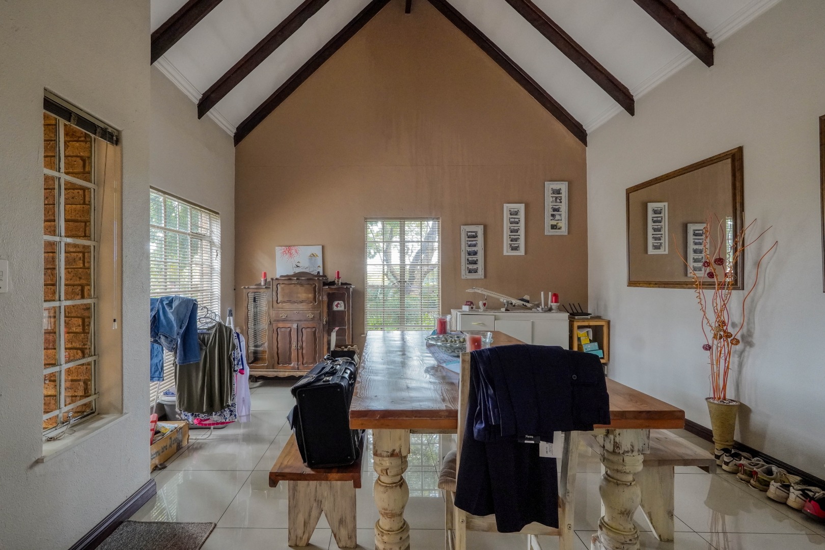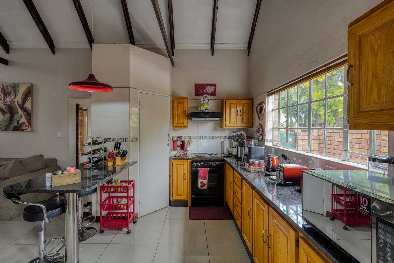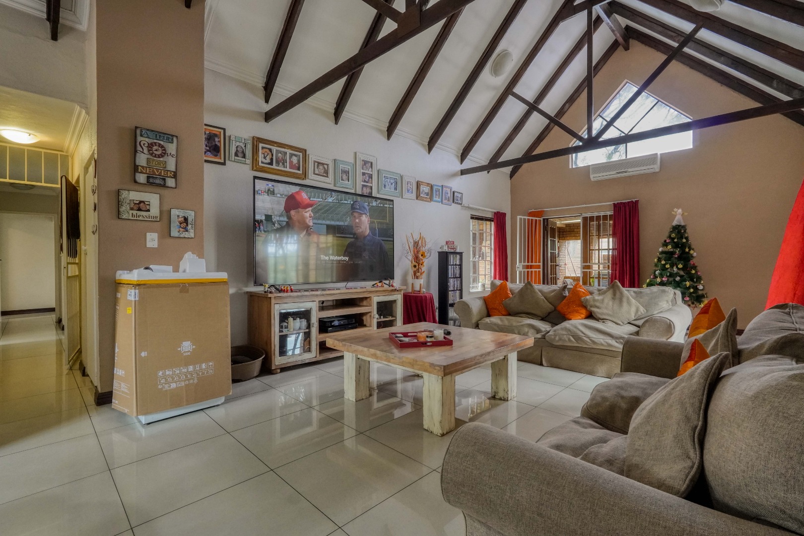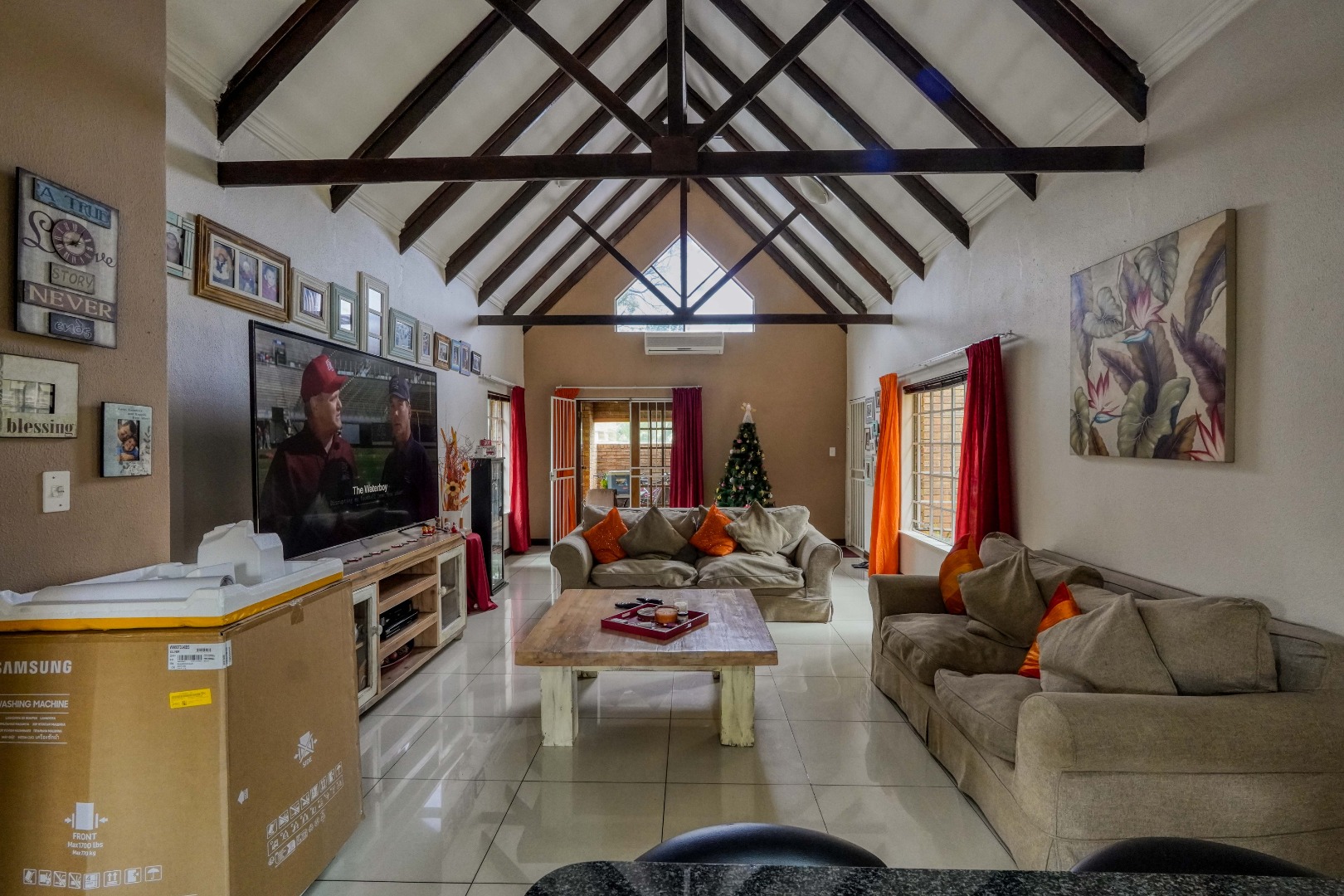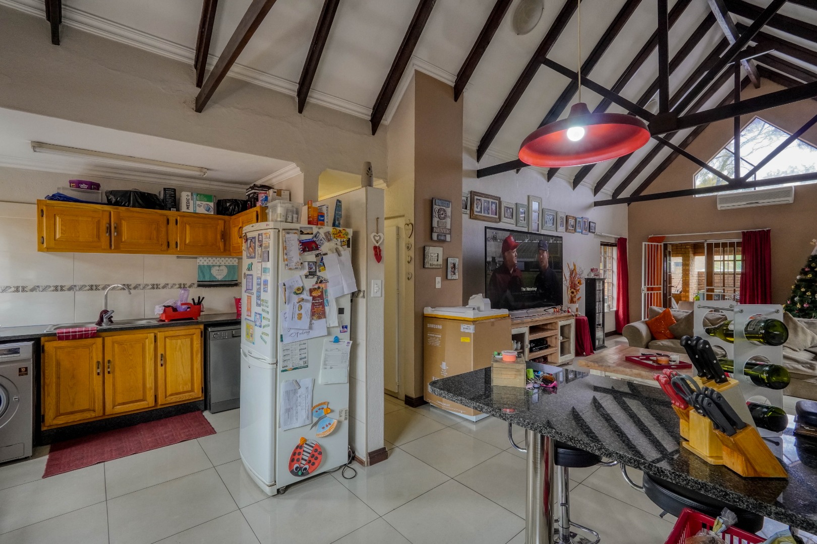 From the front door, you step into a spacious entrance hall that is large enough to function as a dining area, creating a welcoming first impression. This space flows effortlessly into the lounge, where an open-plan layout brings everything together. On the left, the kitchen features a breakfast nook and a separate scullery, while the rest of the lounge opens up to the right, creating a generous central living space ideal for everyday living and entertaining.