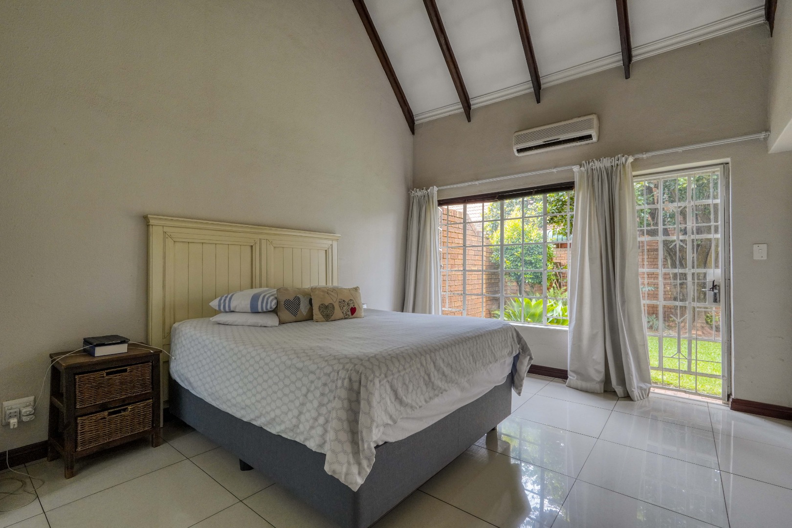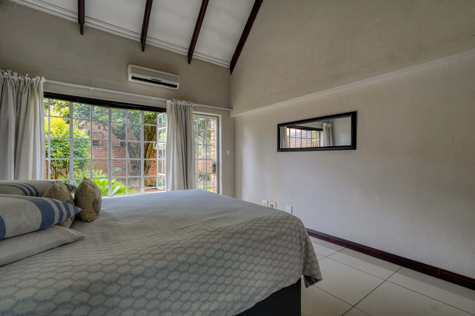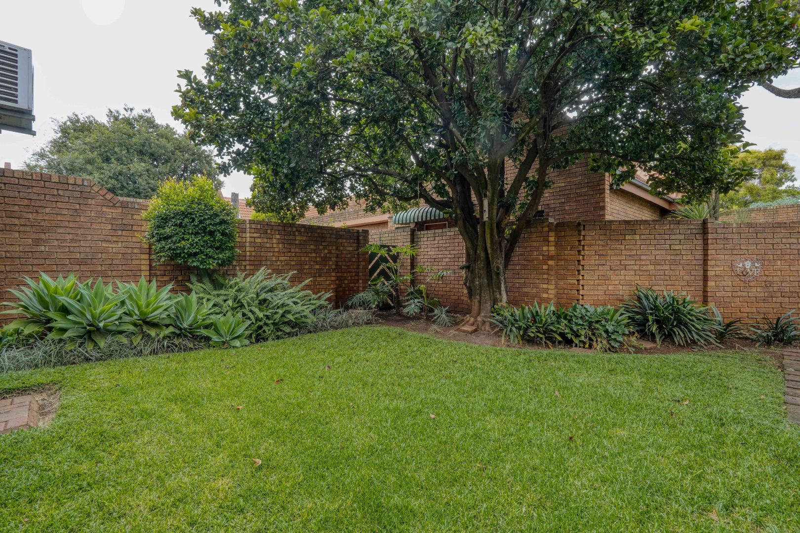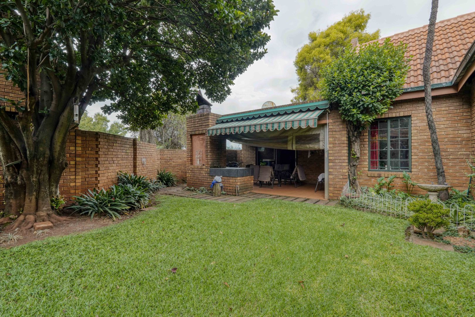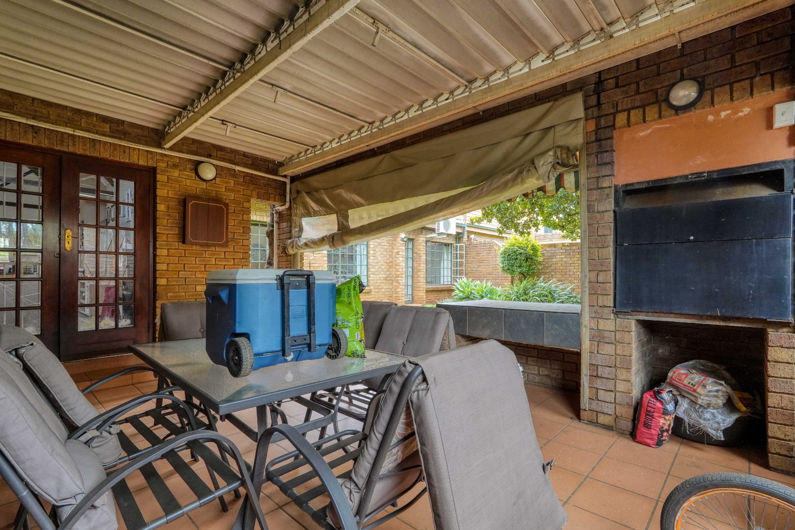At the far end of the lounge, a doorway opens onto a covered patio with a built-in braai, overlooking a private garden with a mature tree, providing a pleasant outdoor space to relax or entertain within the secure complex.