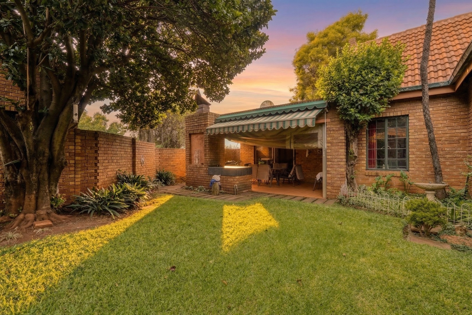 At the far end of the lounge, a doorway opens onto a covered patio with a built-in braai, overlooking a private garden with a mature tree, providing a pleasant outdoor space to relax or entertain within the secure complex.