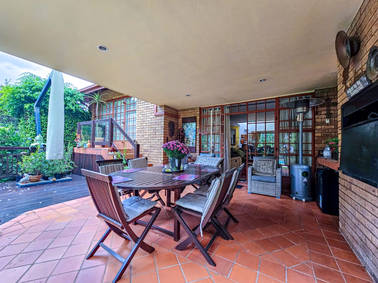 This remarkable property offers 4 spacious bedrooms, 2.5 bathrooms (main en-suite with his & hers vanity), and a study. The open-plan kitchen boasts granite tops, an anthracite oven, scullery, pantry, gas & electric hob, eye-level oven, and a breakfast nook. Living areas include a dining room, TV room with fireplace, and enclosed patio with built-in braai. Enjoy a lush garden with irrigation, a pool, solar power (5KW, 2 batteries), 3 aircons, prepaid electricity, a flatlet, staff quarters & 3 garages. Contact me for a private viewing!