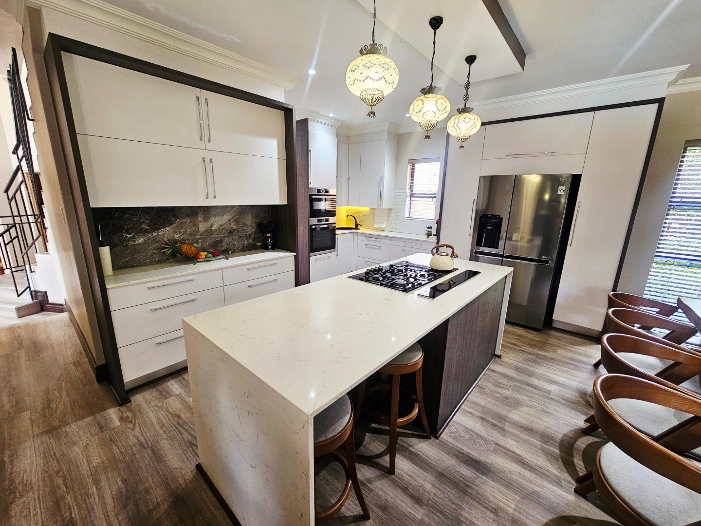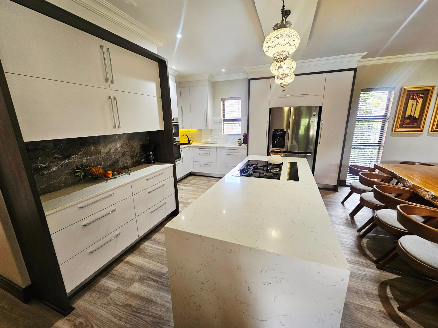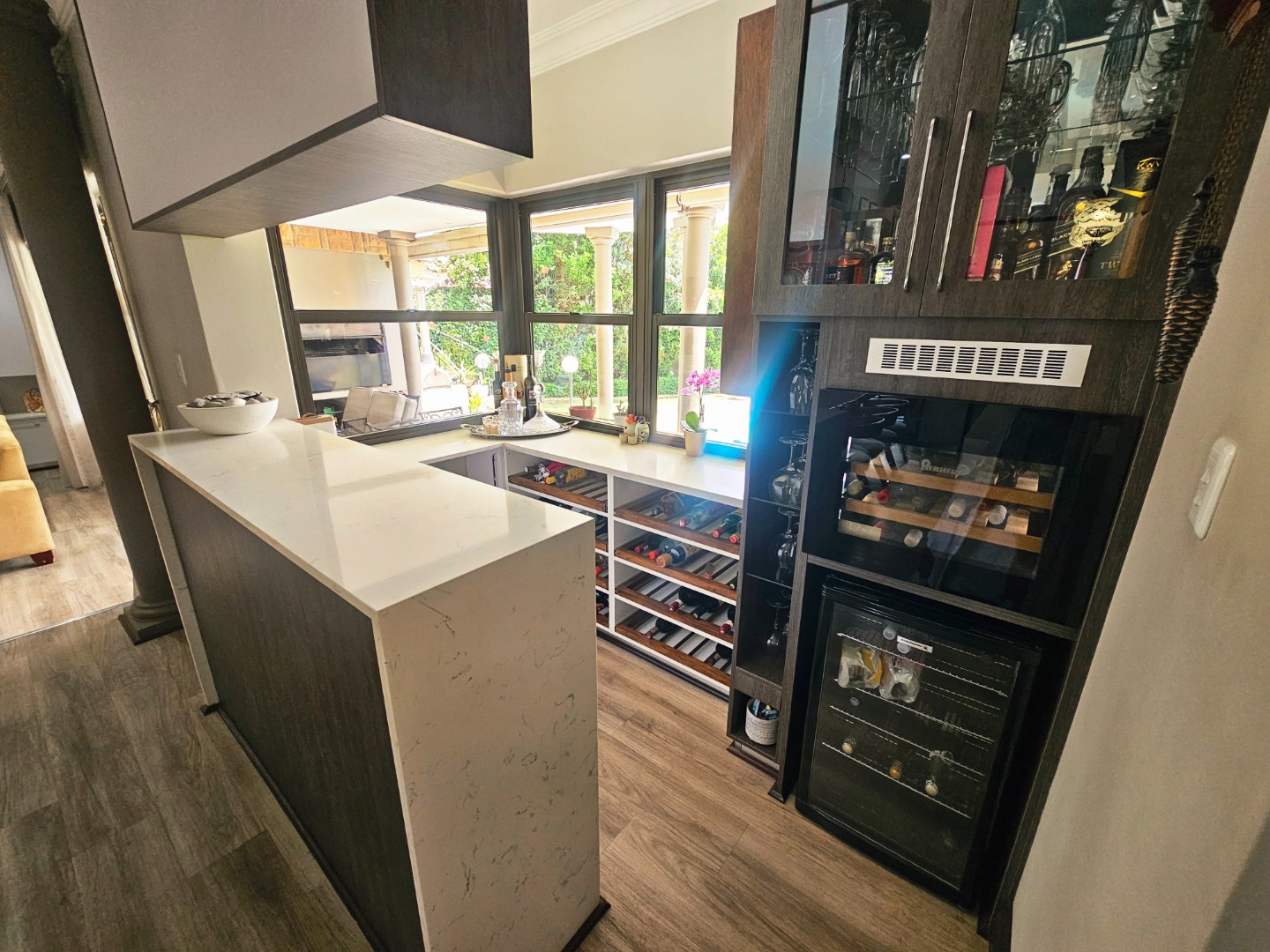 - A modern, functional kitchen with a practical layout to support everyday cooking and entertaining needs. Seperate scullery with loads of packing space. There is a build in bar area that also opens up onto the patio and pool area which is ideal for entertaining.