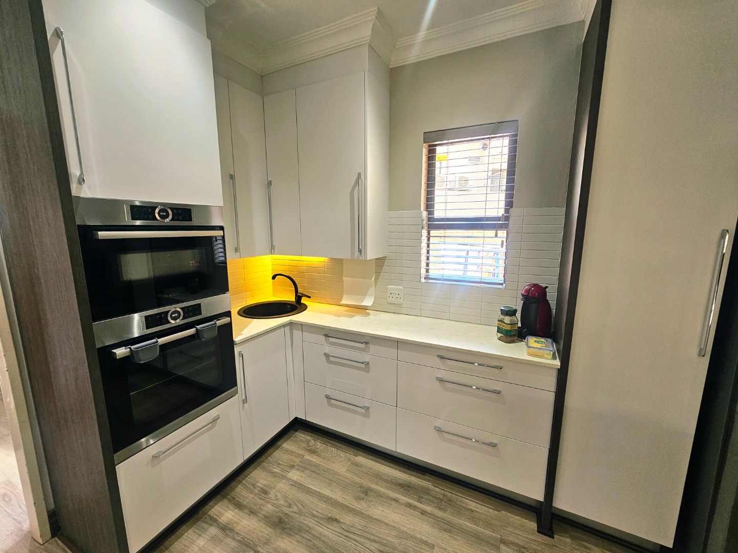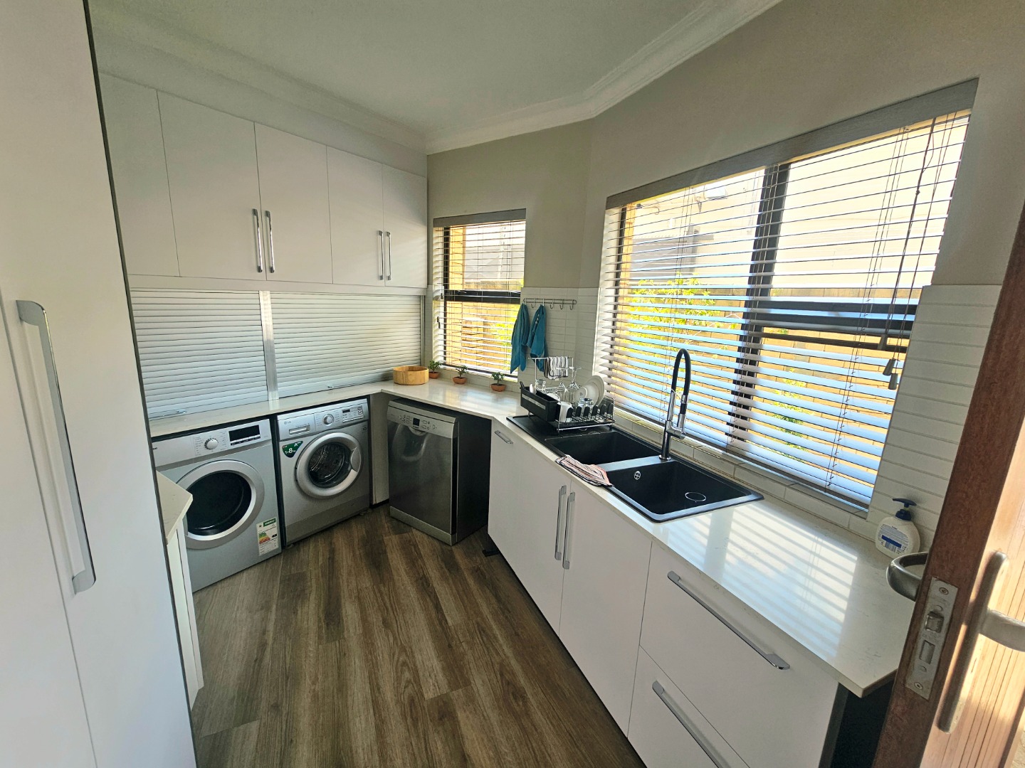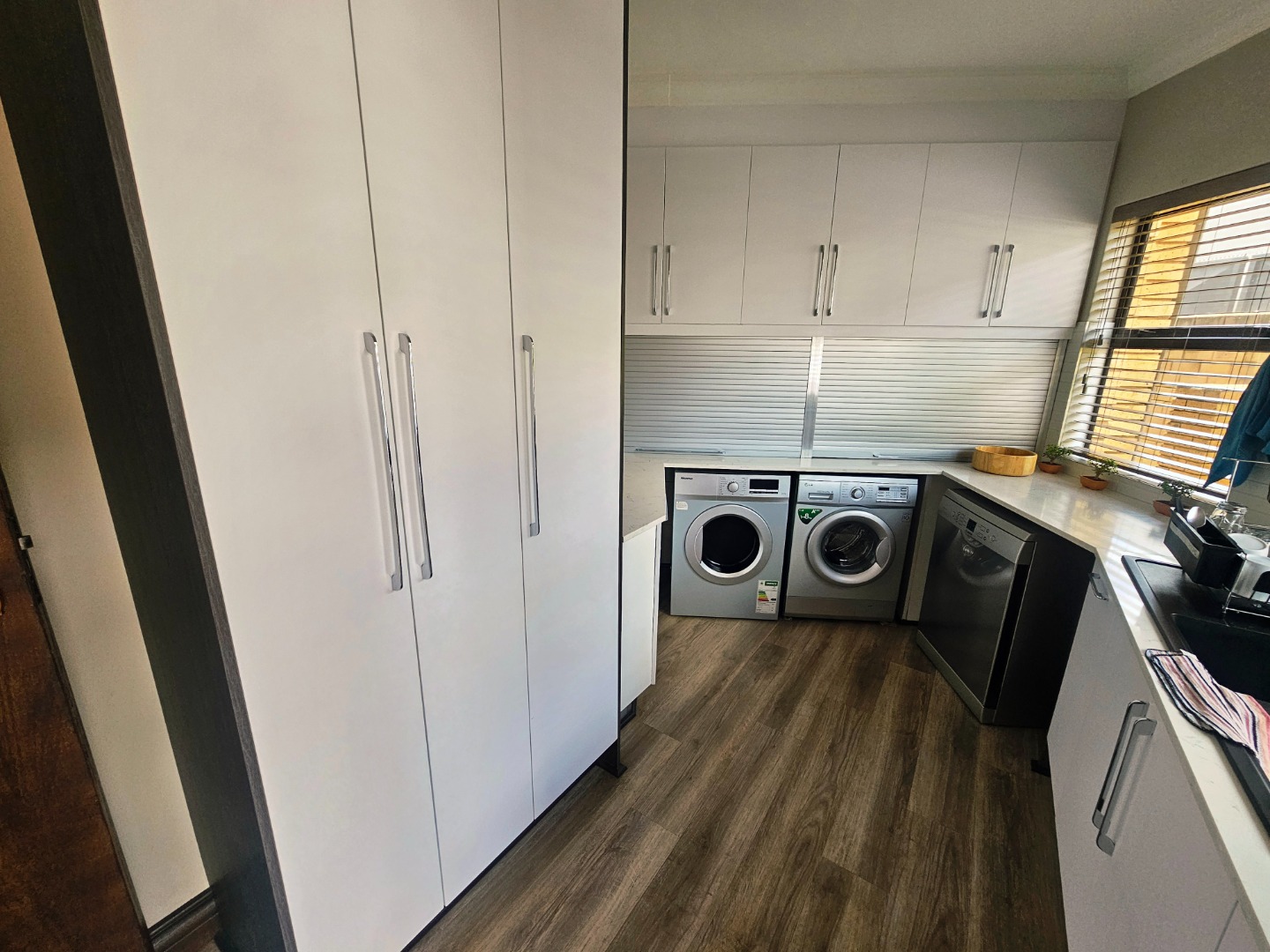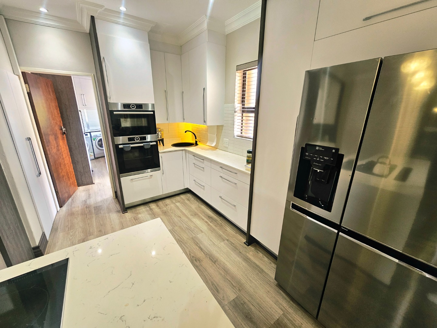 - A modern, functional kitchen with a practical layout to support everyday cooking and entertaining needs. Seperate scullery with loads of packing space. There is a build in bar area that also opens up onto the patio and pool area which is ideal for entertaining.