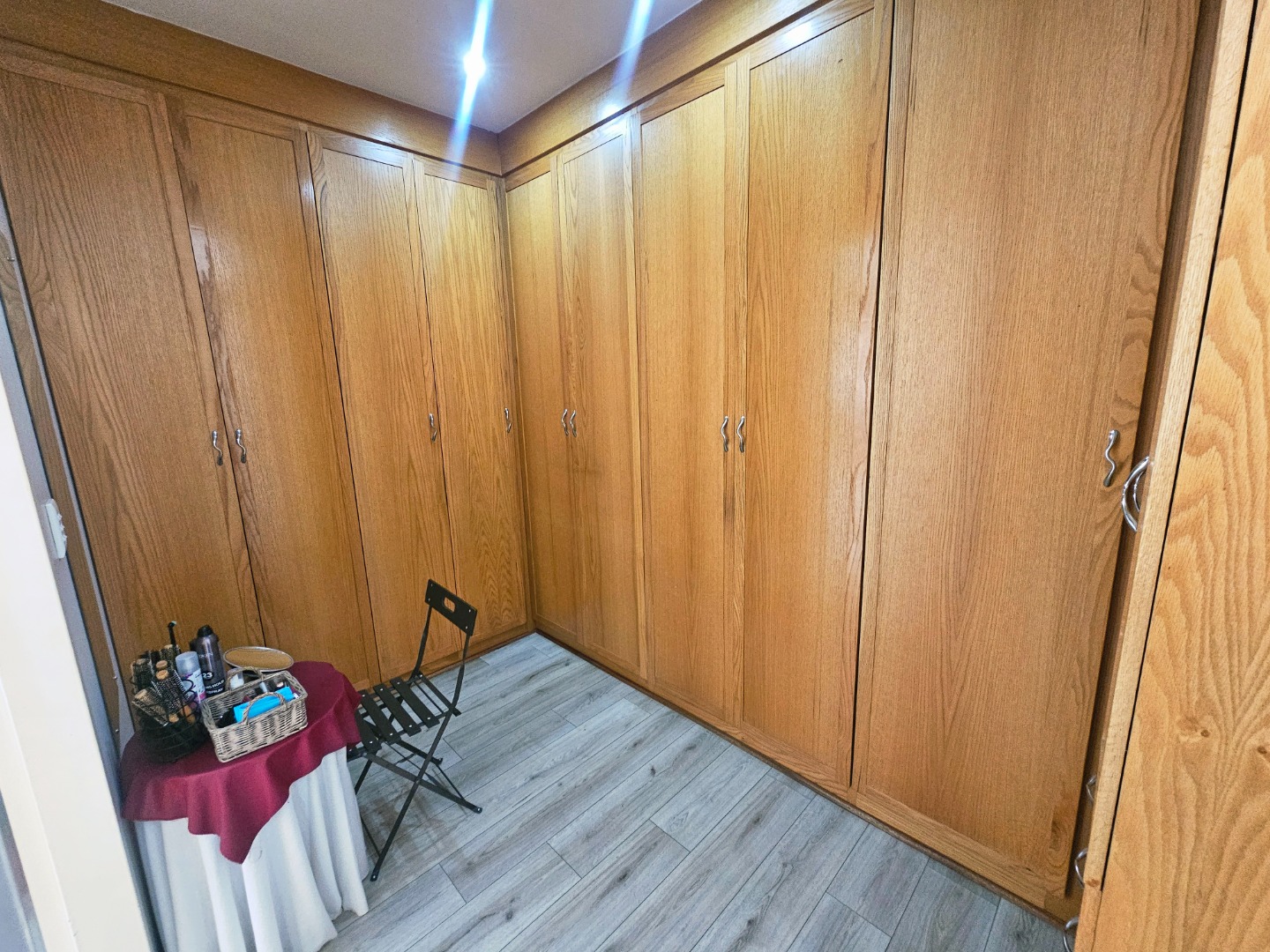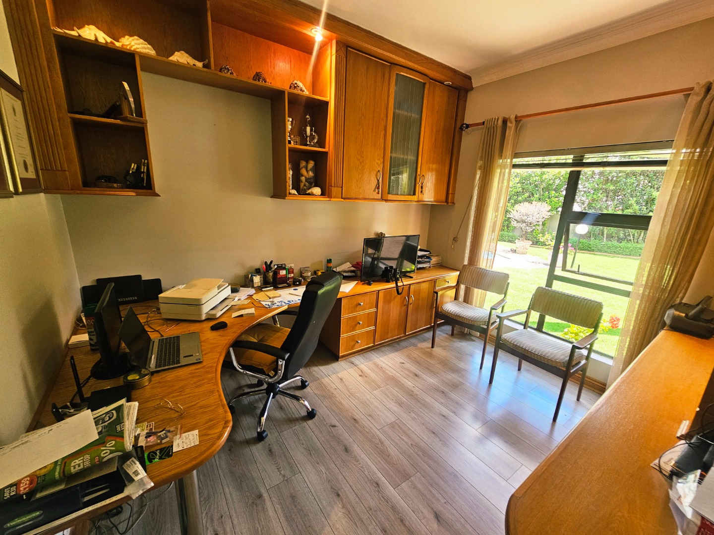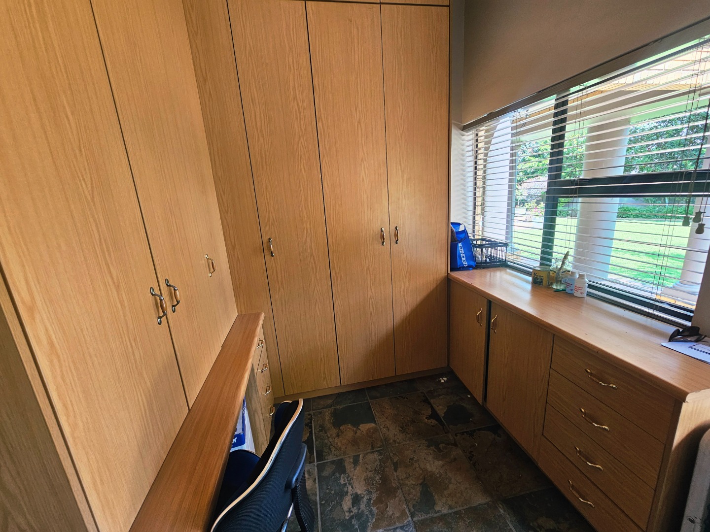 - The garage has build in cupboards and a portion which you can use as a reloading space our outside the house work space. Ideal for any man that loves his hobbies like hunting and fishing.