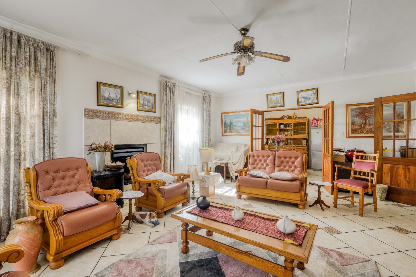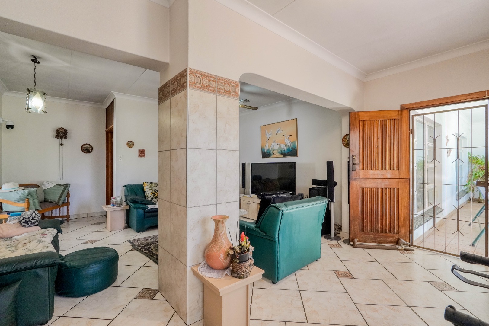 From the dining area you can move into a comfortable lounge which also connects to the entrance hall where the front door is located. This entrance space can easily serve as a second, smaller lounge or reception area. From here, there is also access to the hallway leading to the bedrooms.