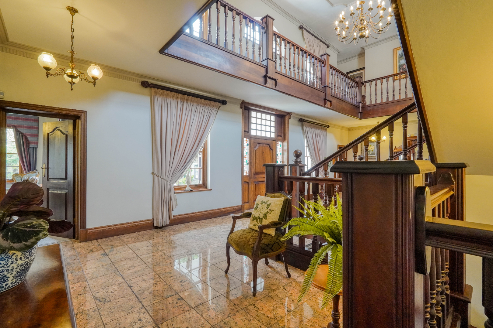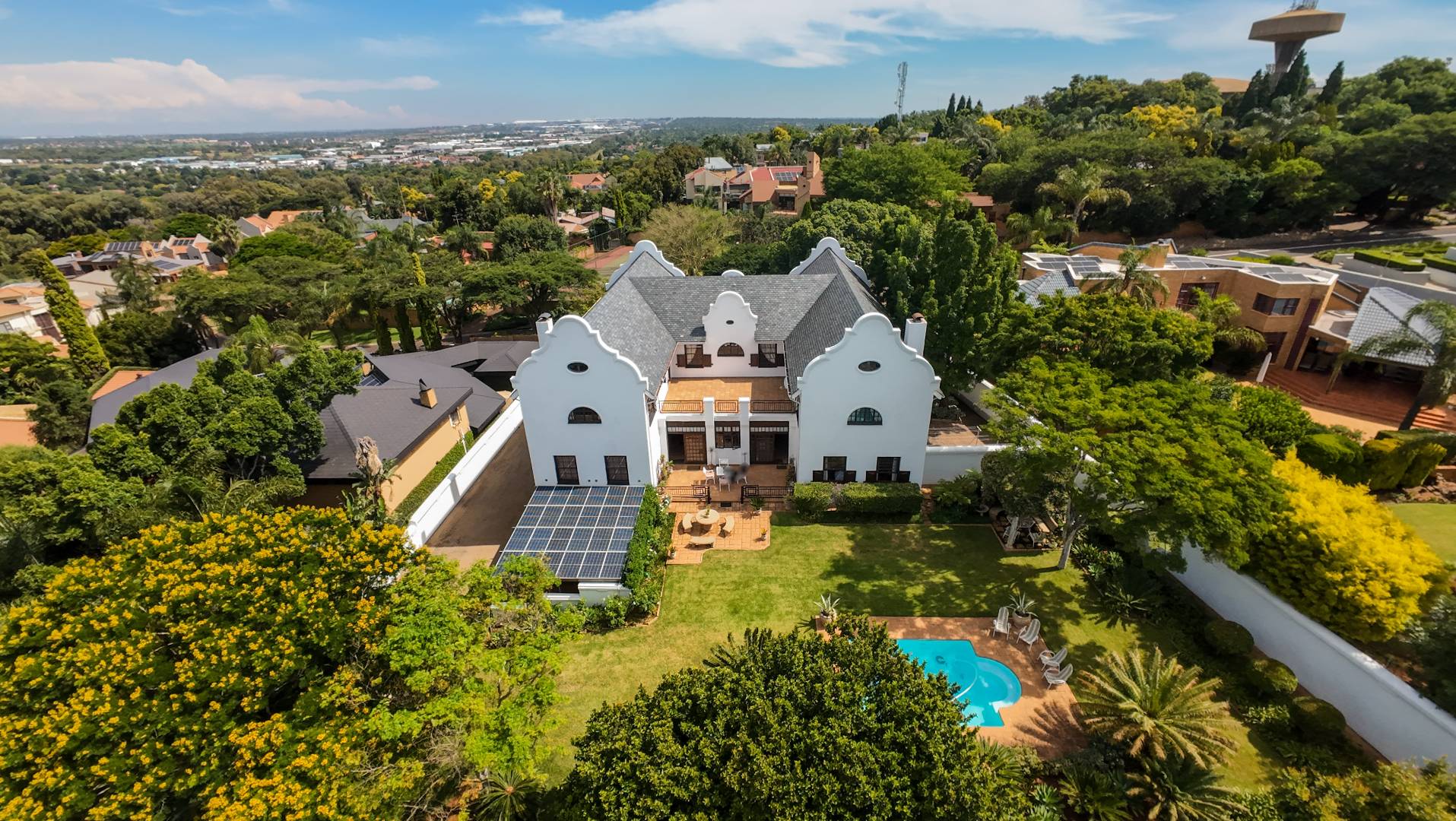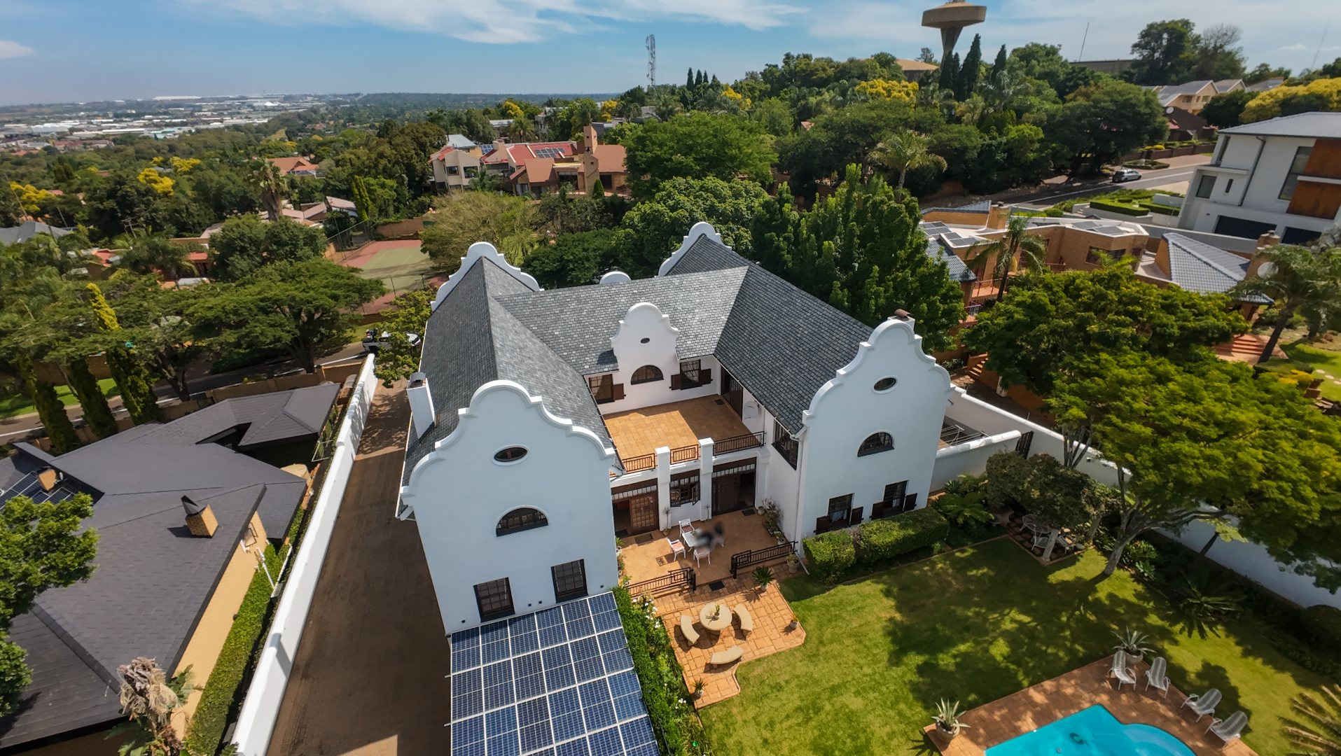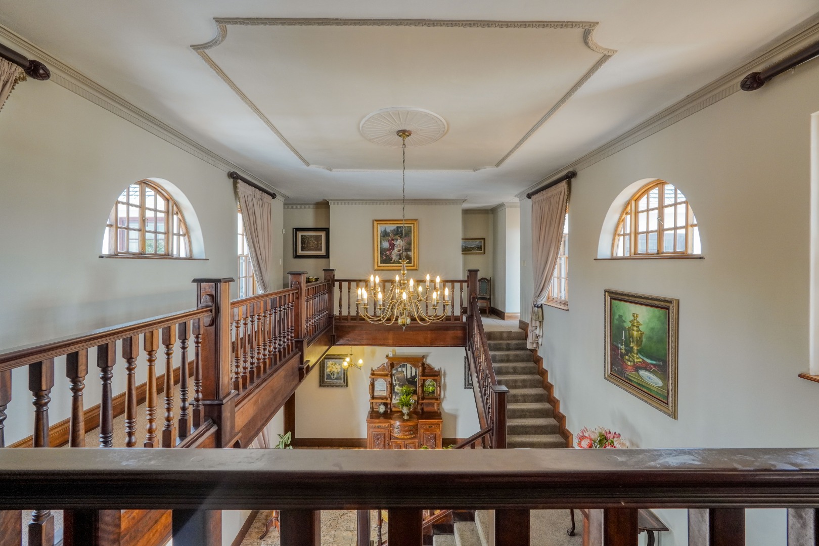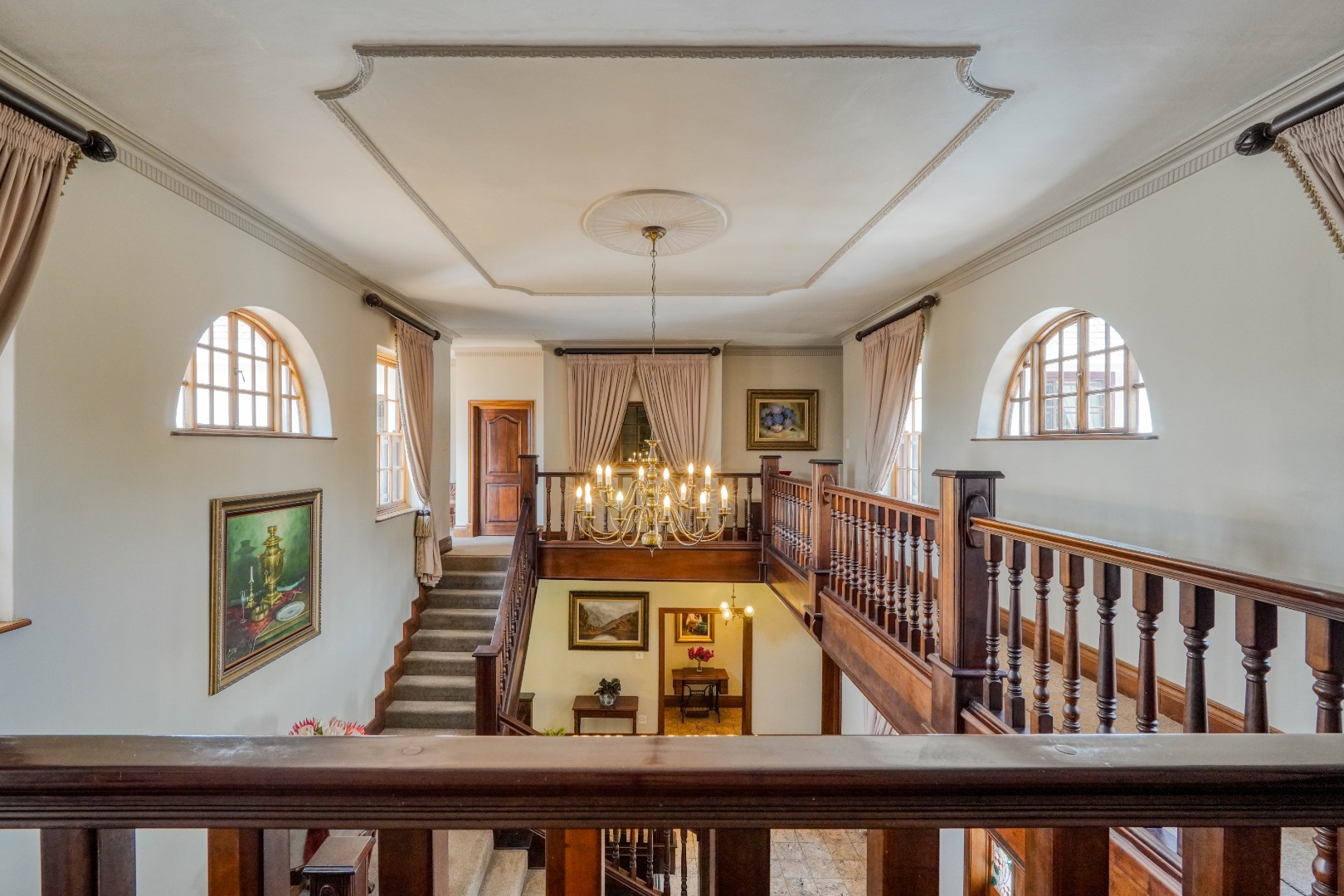 A secondary staircase near the main entrance leads downward and appears to descend into a basement, but instead guides you to the garages in the east wing, giving the home a rare three storey feel. Practical features include solar panels supported by two 5800W inverters and two geysers, ensuring efficiency to match the scale of the property.