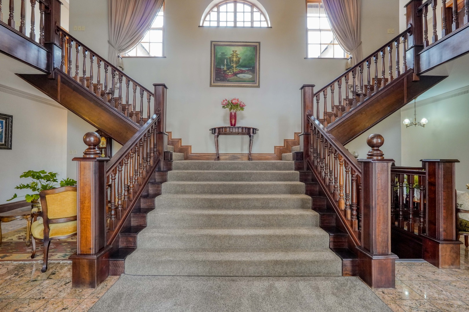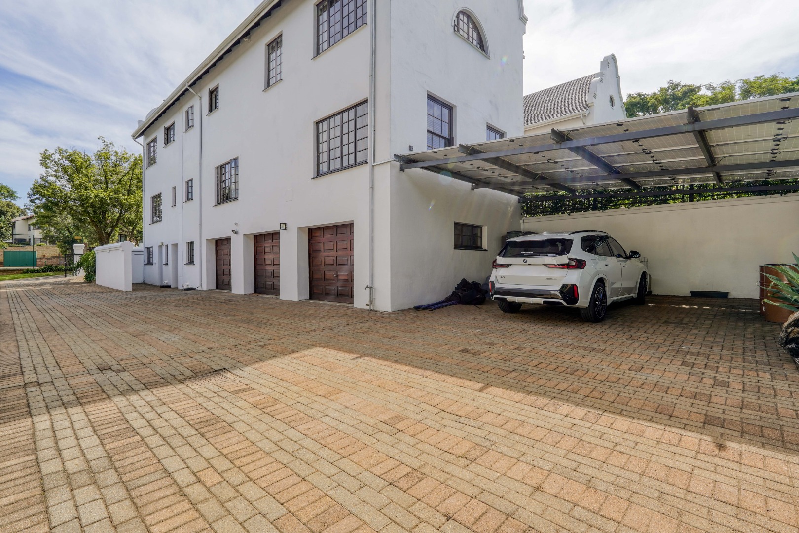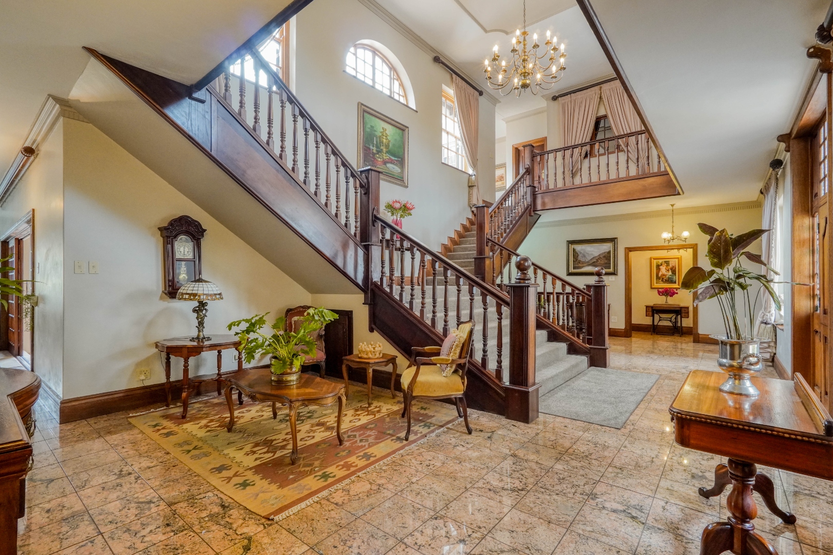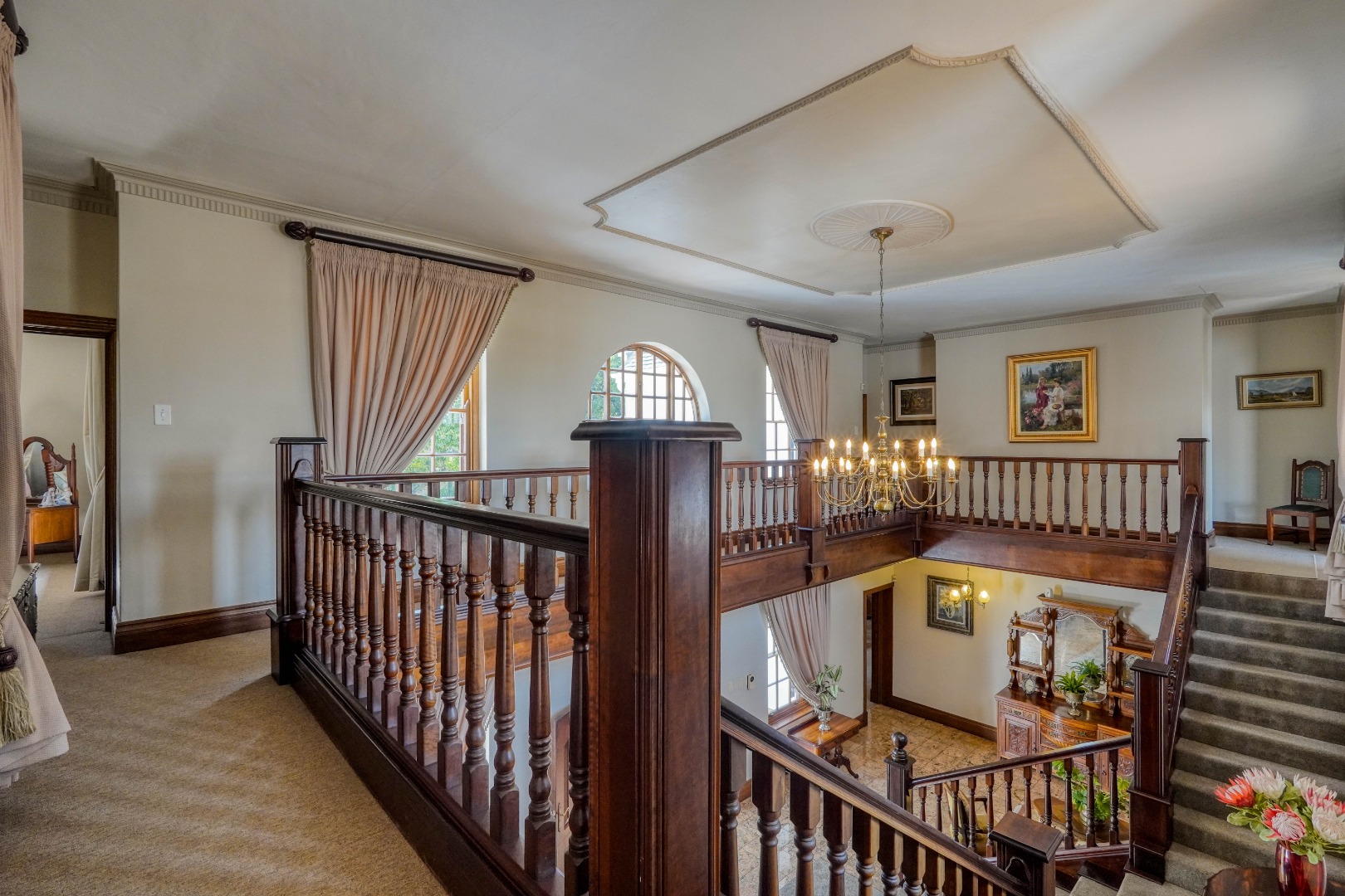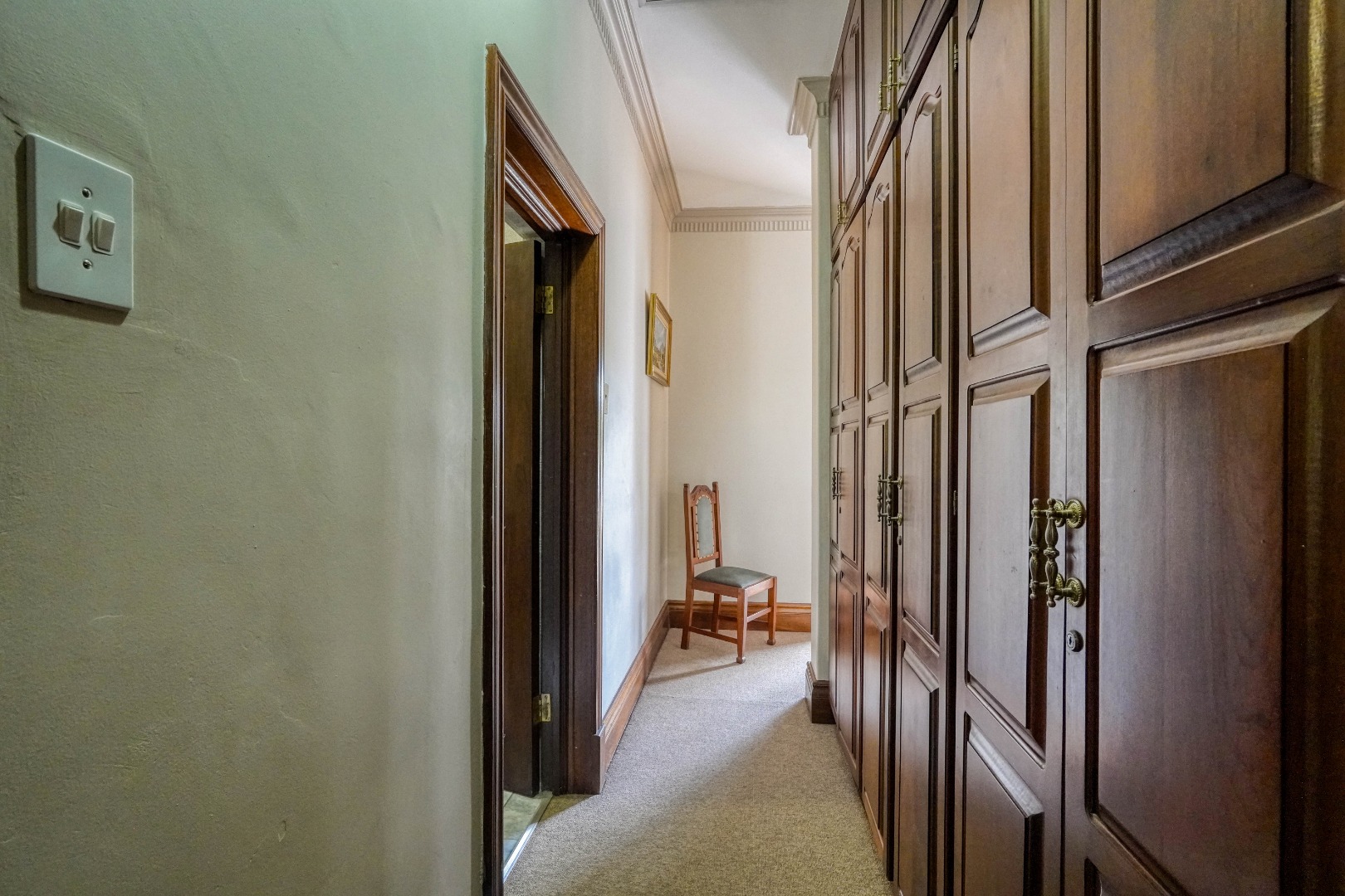 A secondary staircase near the main entrance leads downward and appears to descend into a basement, but instead guides you to the garages in the east wing, giving the home a rare three storey feel. Practical features include solar panels supported by two 5800W inverters and two geysers, ensuring efficiency to match the scale of the property.