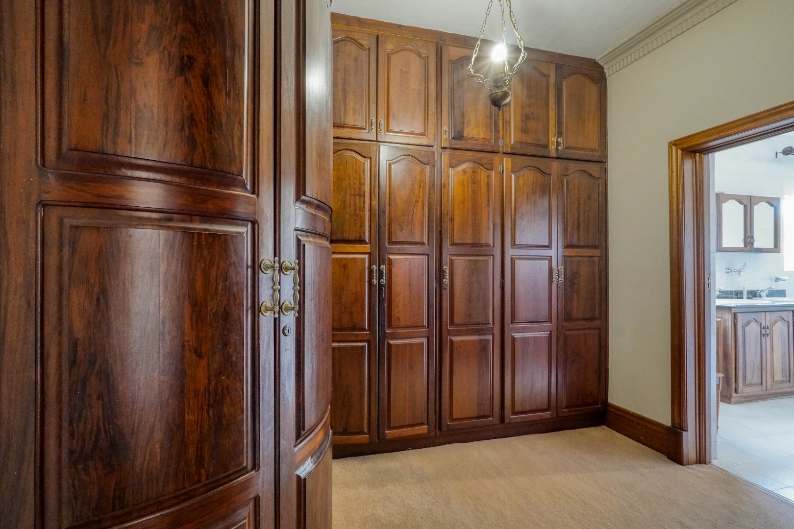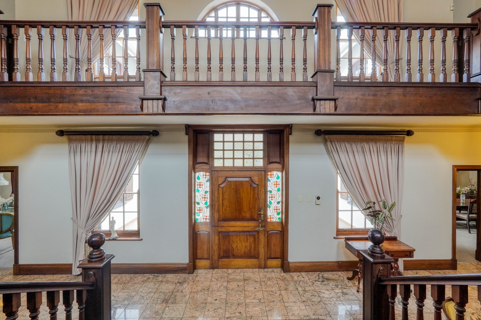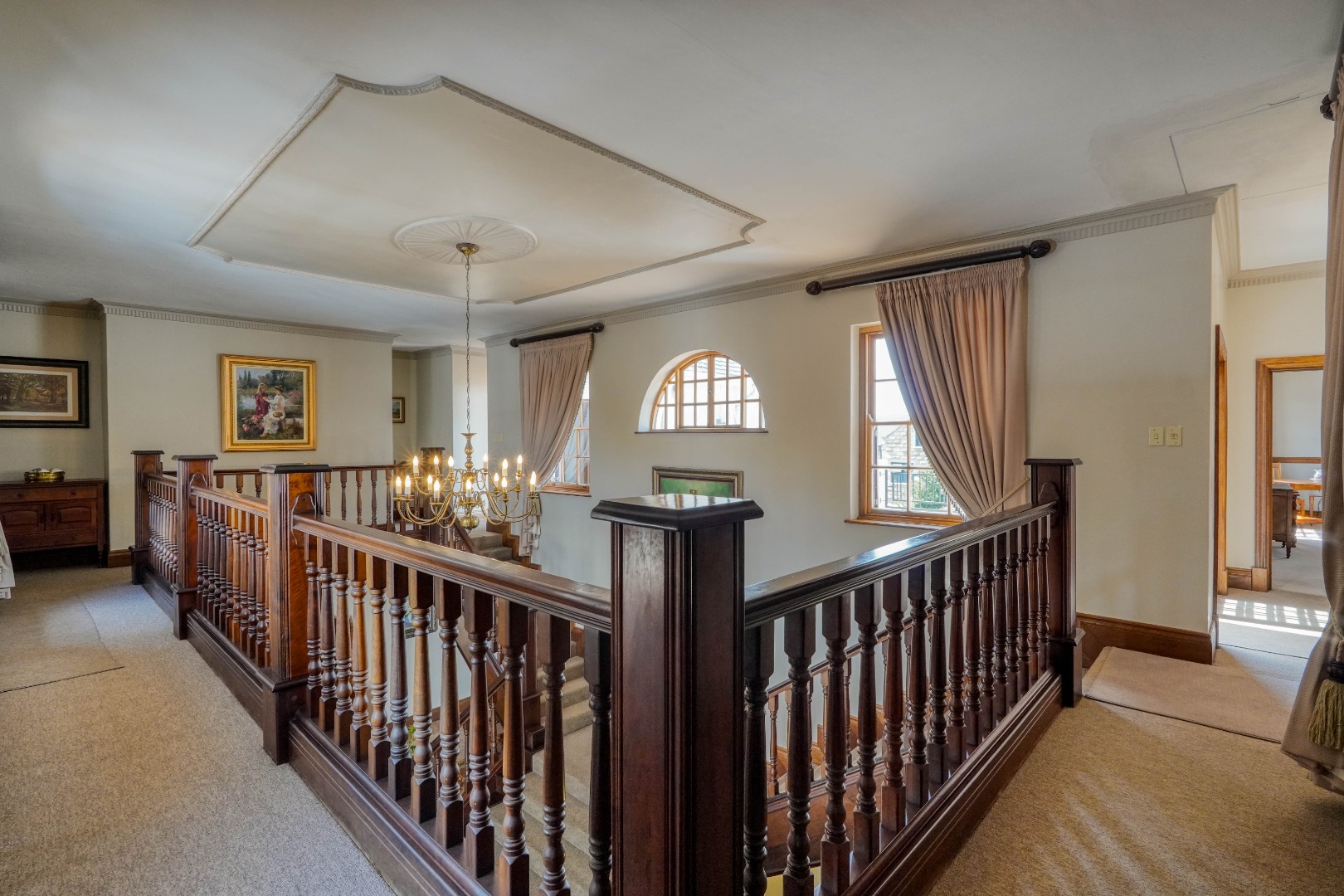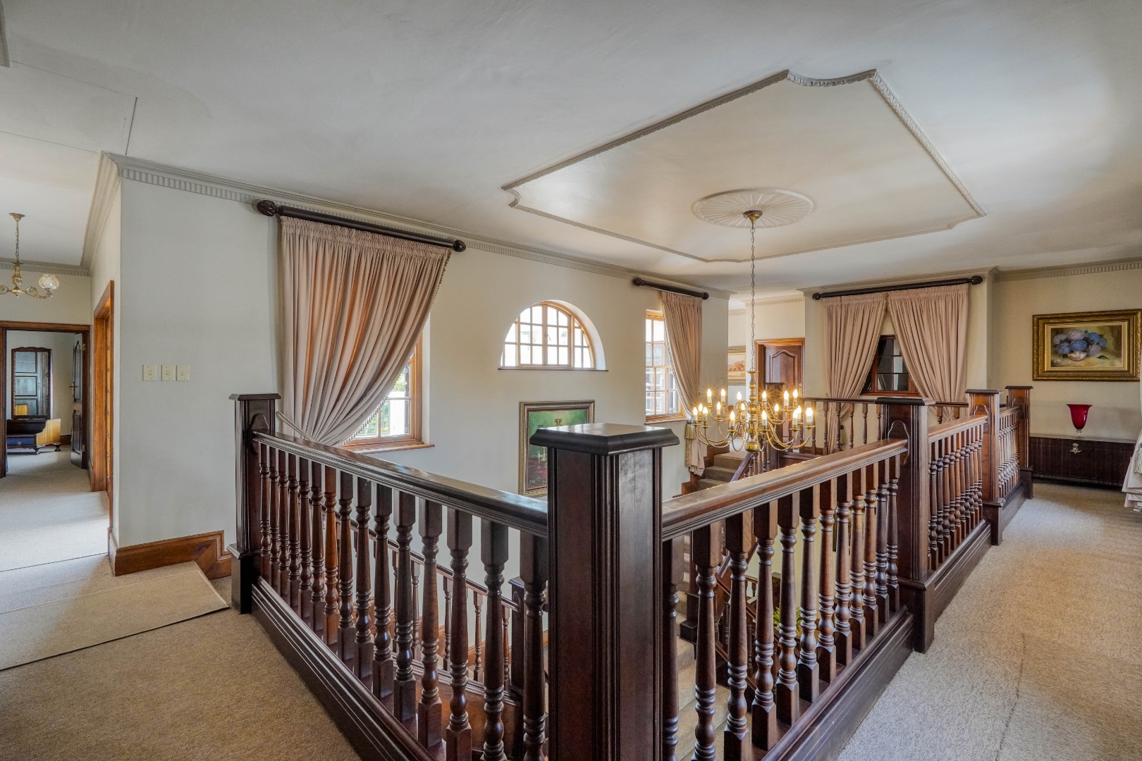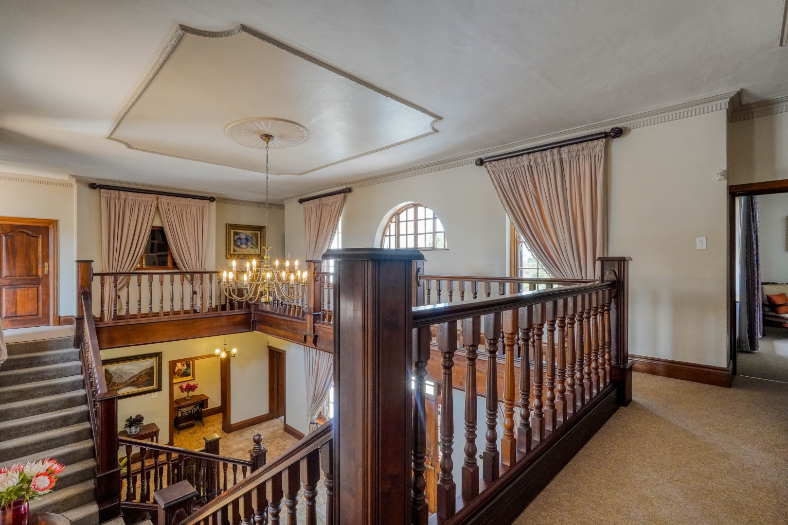 A secondary staircase near the main entrance leads downward and appears to descend into a basement, but instead guides you to the garages in the east wing, giving the home a rare three storey feel. Practical features include solar panels supported by two 5800W inverters and two geysers, ensuring efficiency to match the scale of the property.
