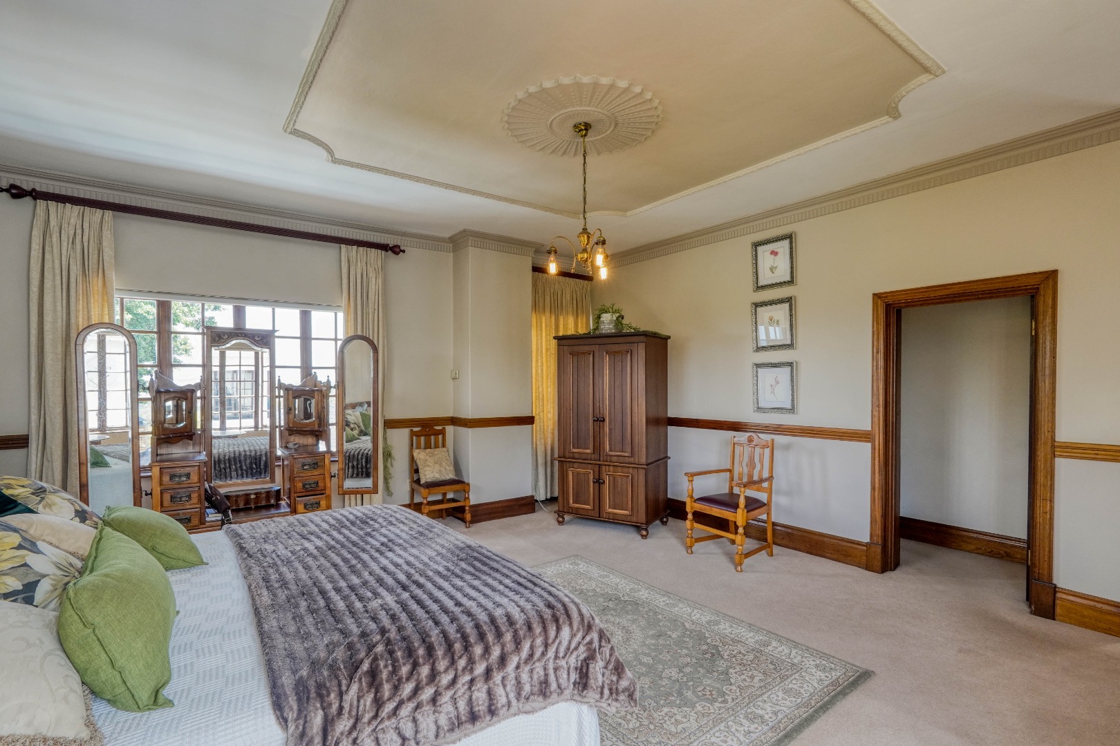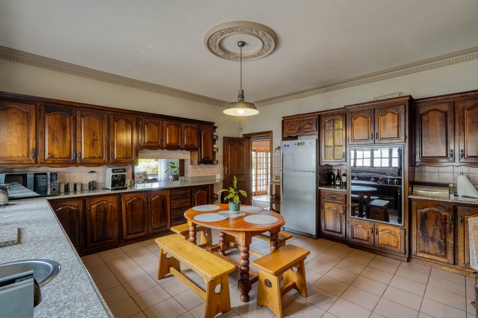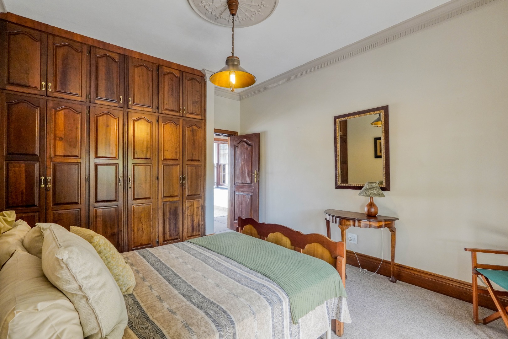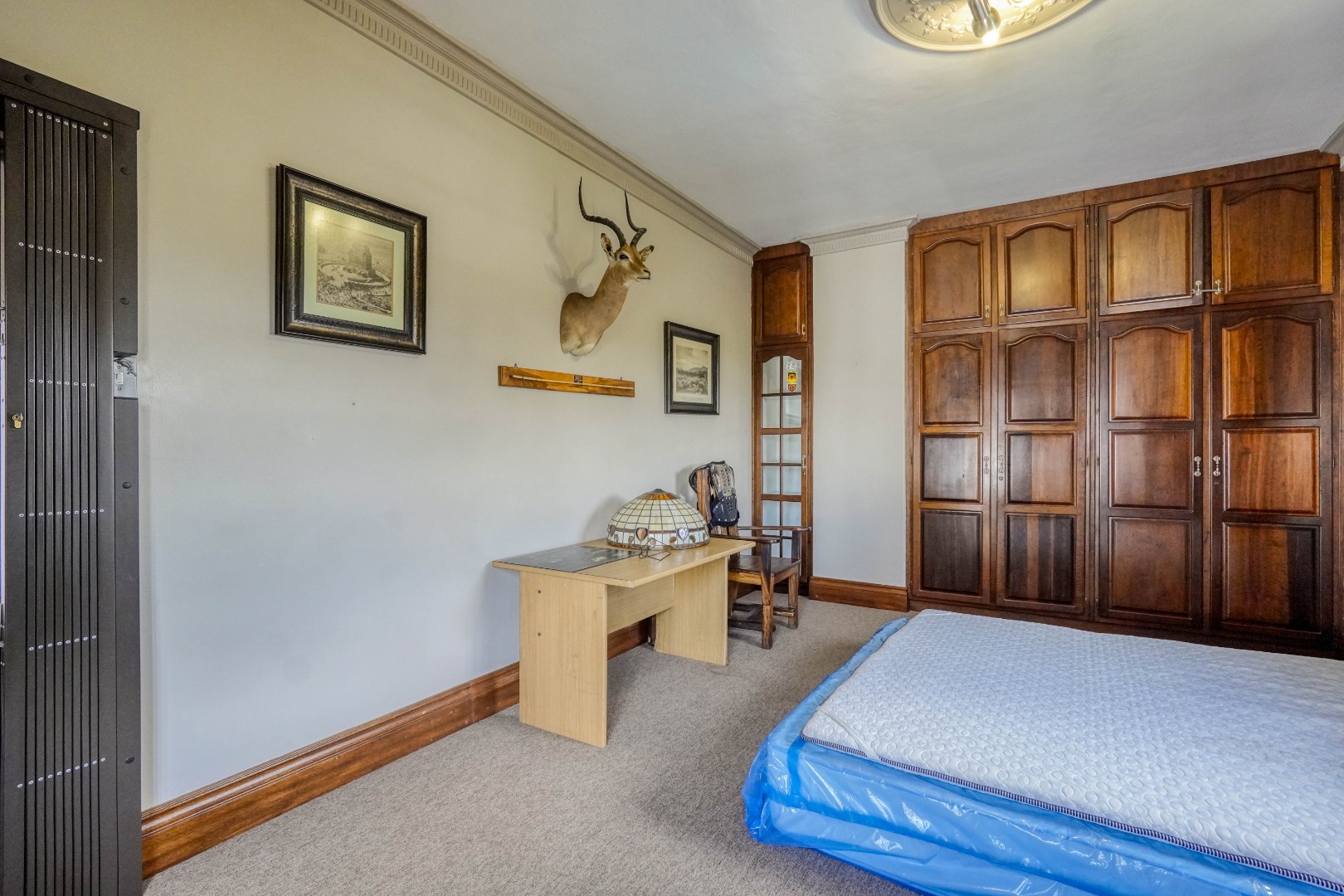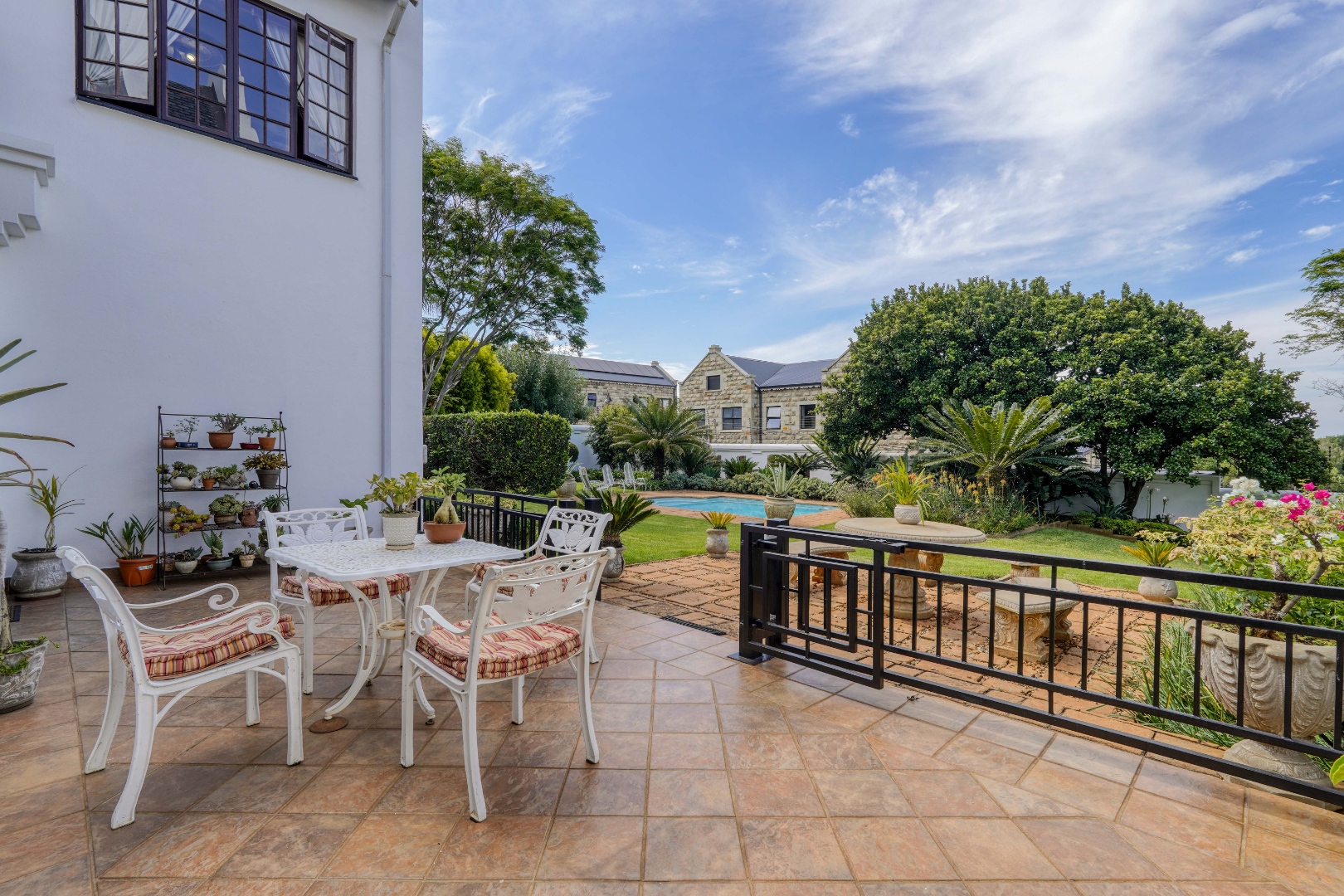 A secondary staircase near the main entrance leads downward and appears to descend into a basement, but instead guides you to the garages in the east wing, giving the home a rare three storey feel. Practical features include solar panels supported by two 5800W inverters and two geysers, ensuring efficiency to match the scale of the property.