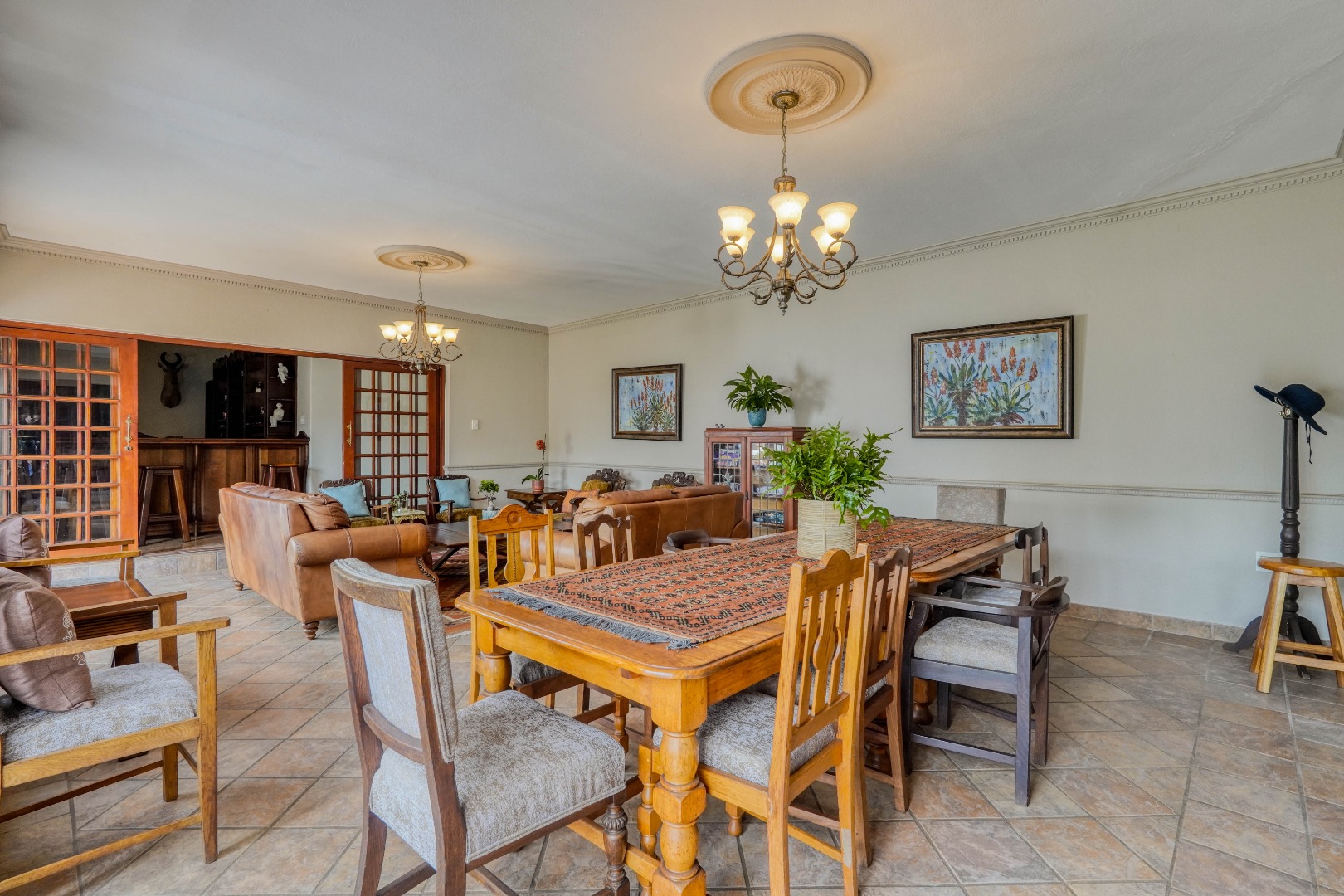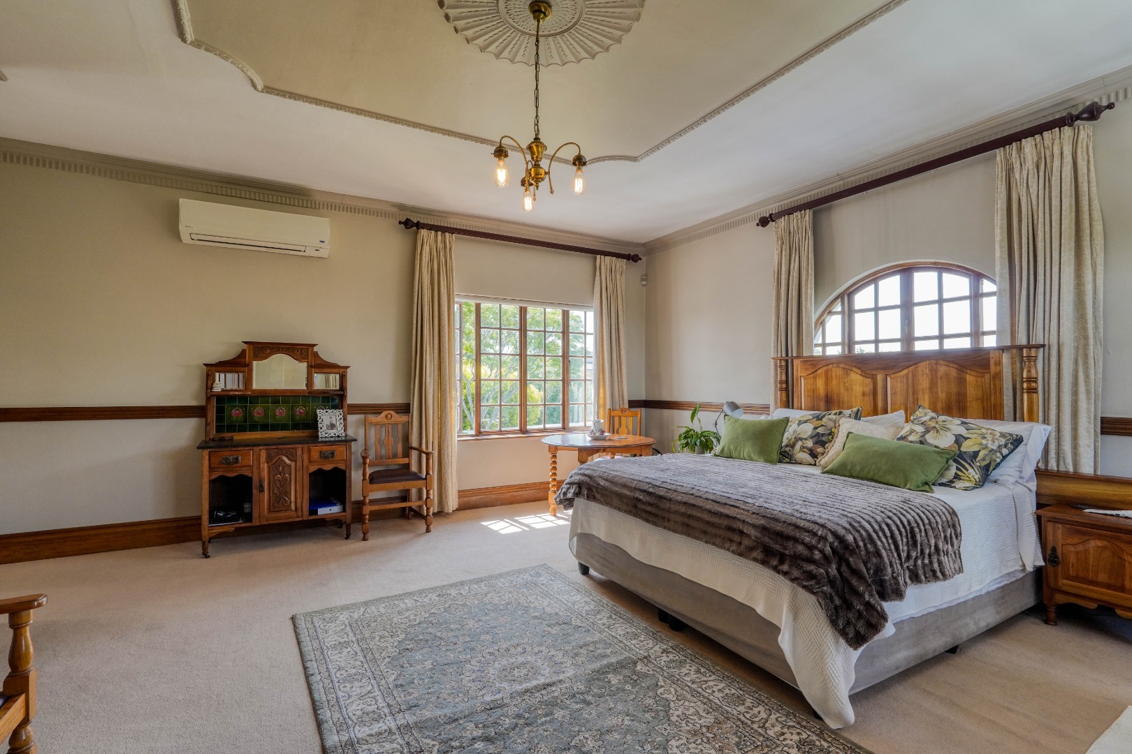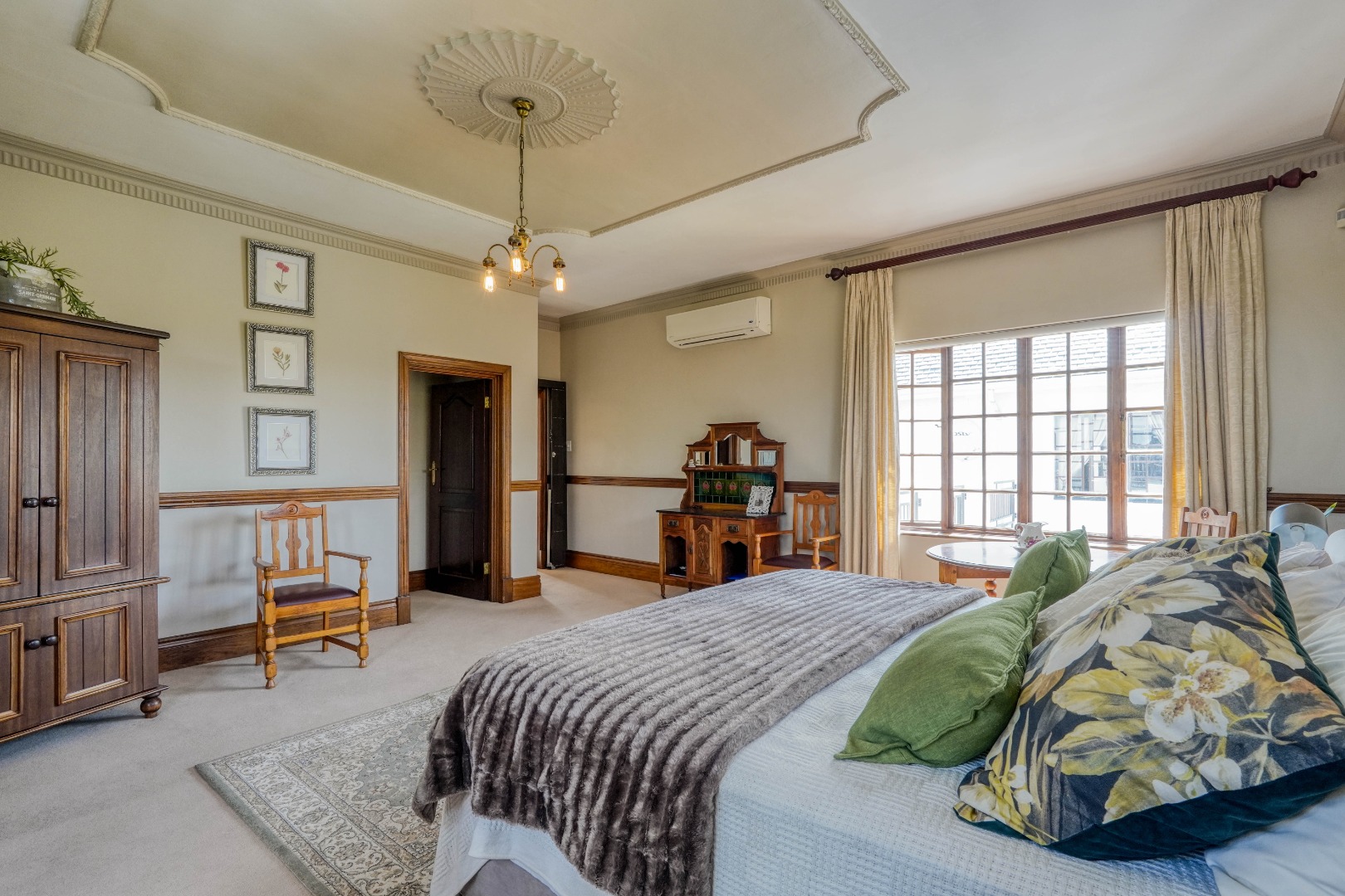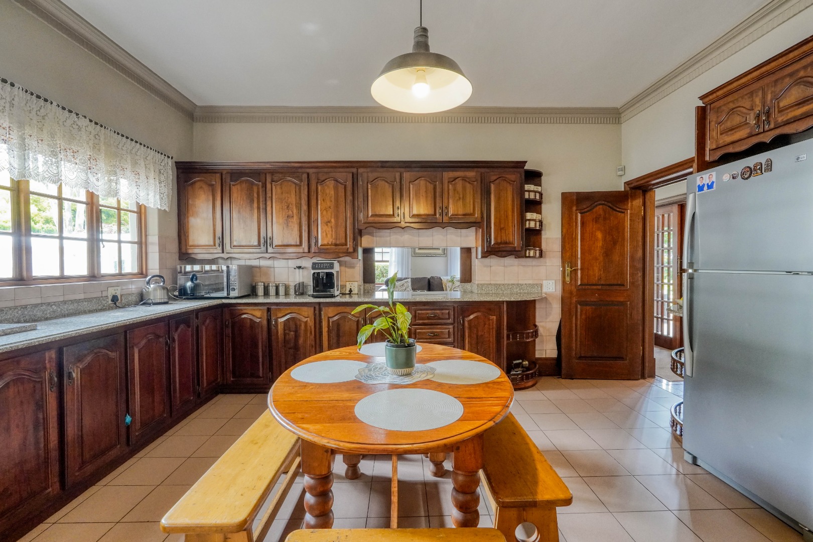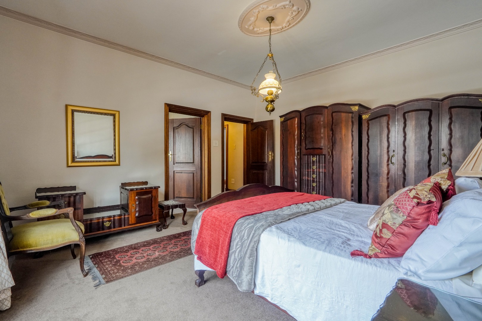 A secondary staircase near the main entrance leads downward and appears to descend into a basement, but instead guides you to the garages in the east wing, giving the home a rare three storey feel. Practical features include solar panels supported by two 5800W inverters and two geysers, ensuring efficiency to match the scale of the property.