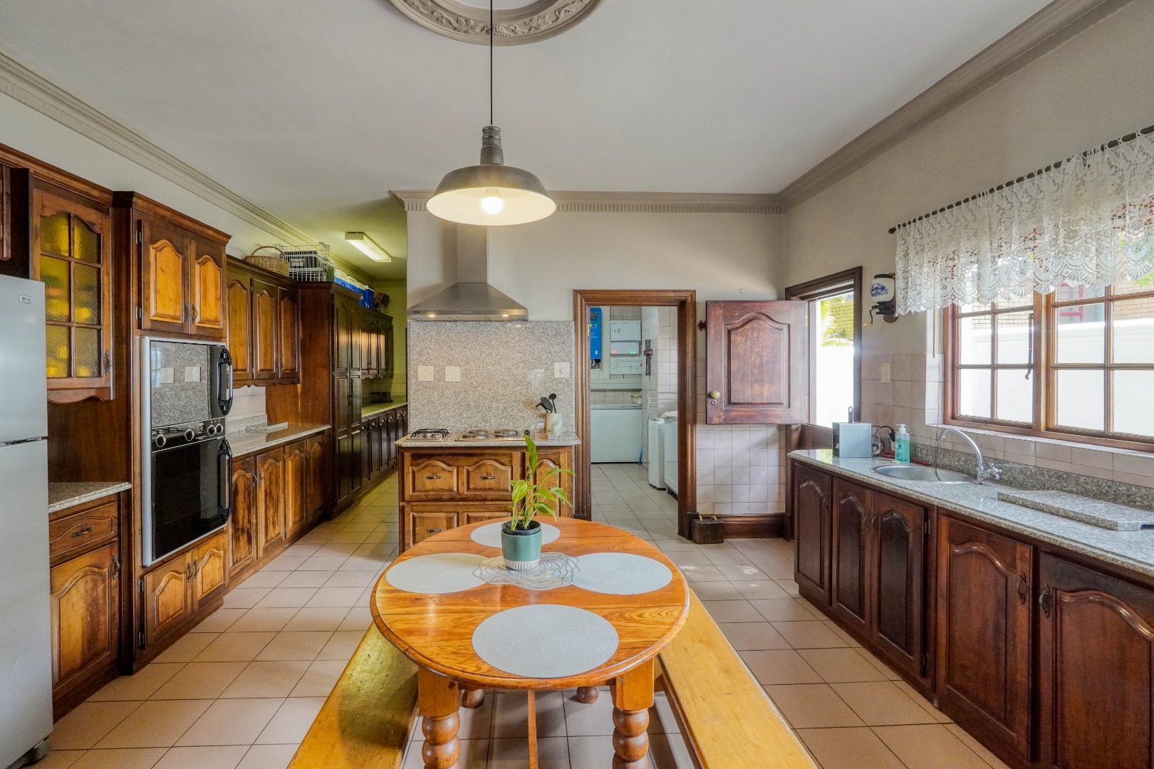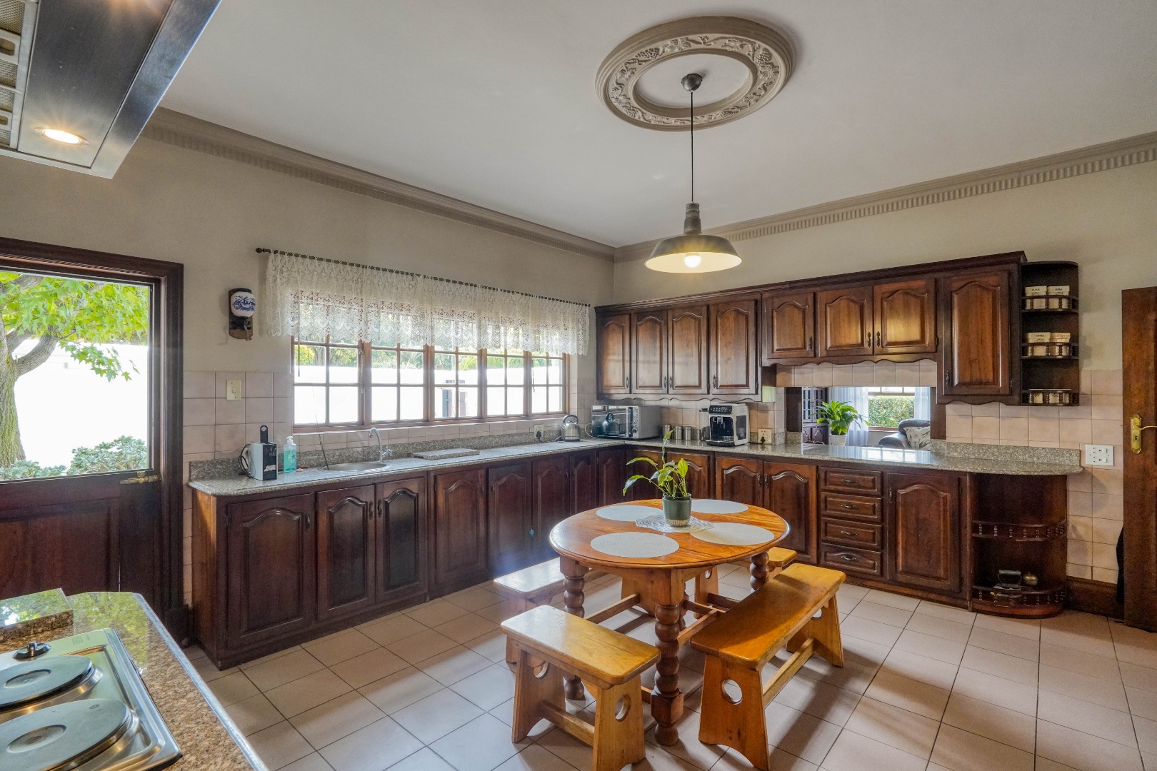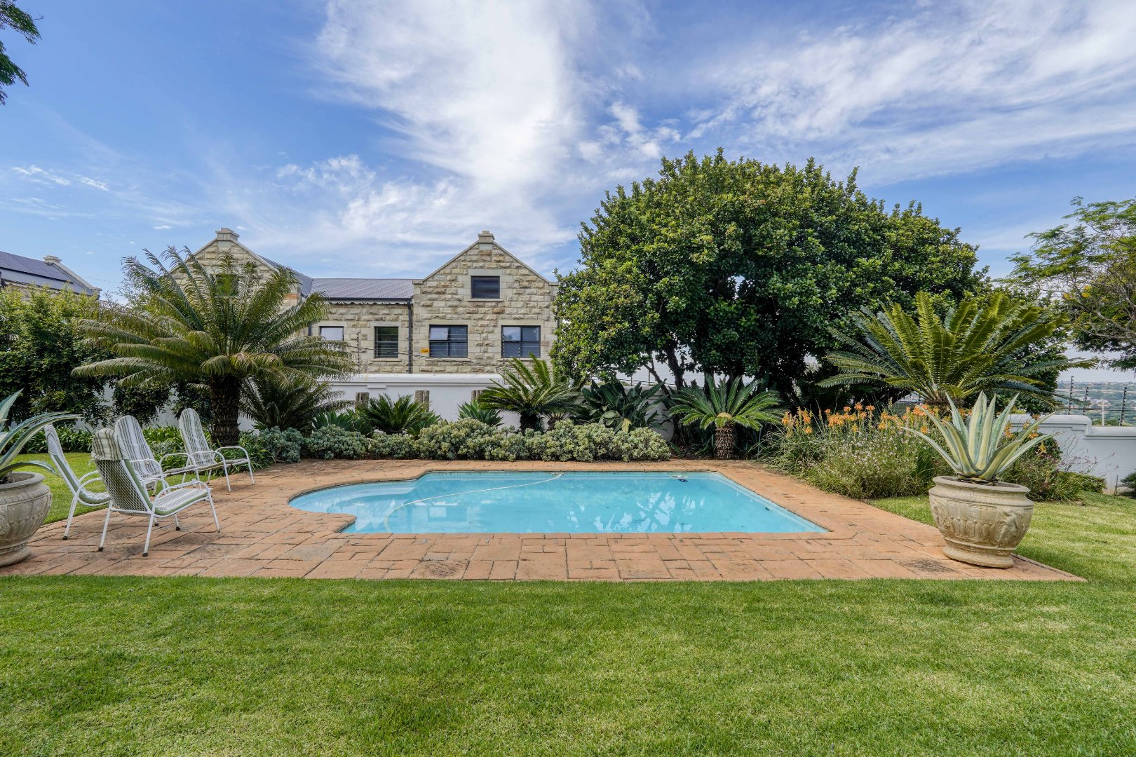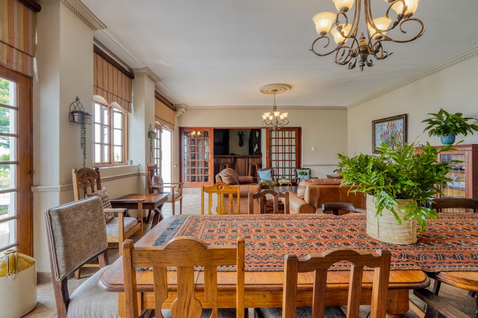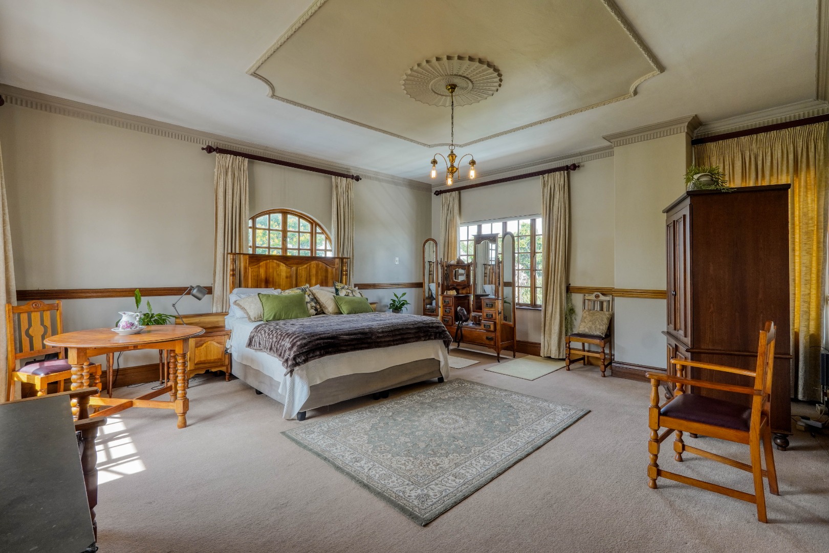 A secondary staircase near the main entrance leads downward and appears to descend into a basement, but instead guides you to the garages in the east wing, giving the home a rare three storey feel. Practical features include solar panels supported by two 5800W inverters and two geysers, ensuring efficiency to match the scale of the property.