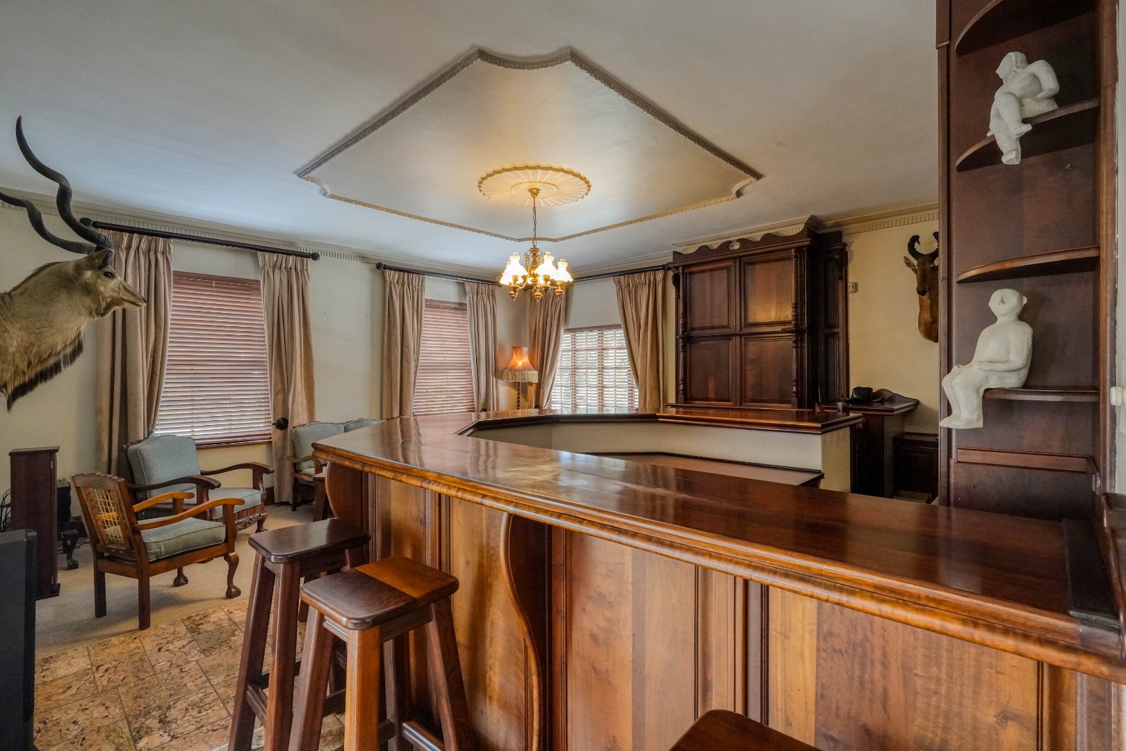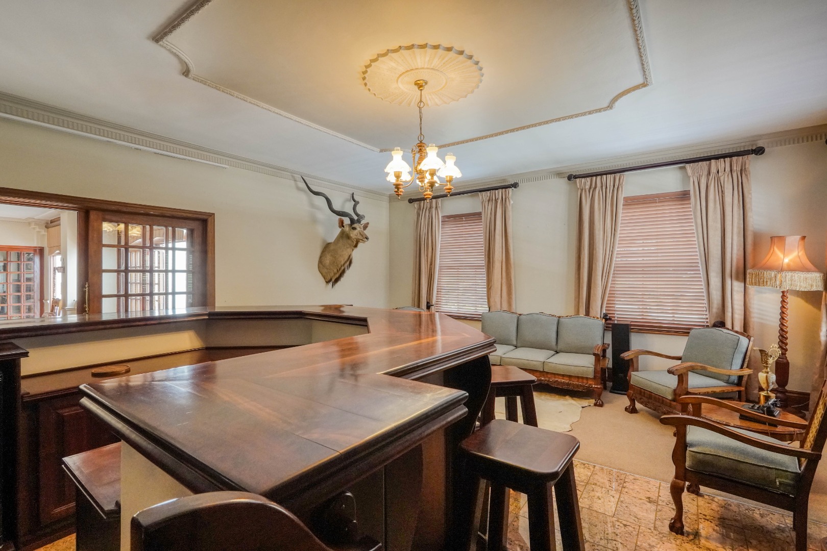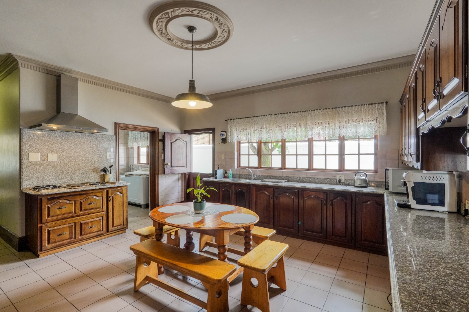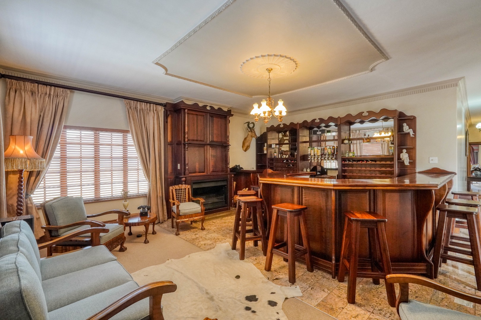 A secondary staircase near the main entrance leads downward and appears to descend into a basement, but instead guides you to the garages in the east wing, giving the home a rare three storey feel. Practical features include solar panels supported by two 5800W inverters and two geysers, ensuring efficiency to match the scale of the property.