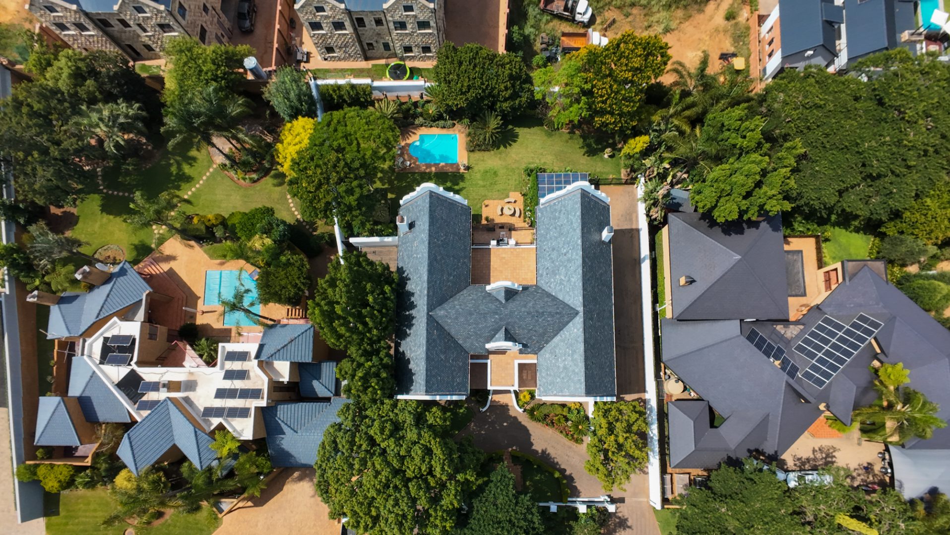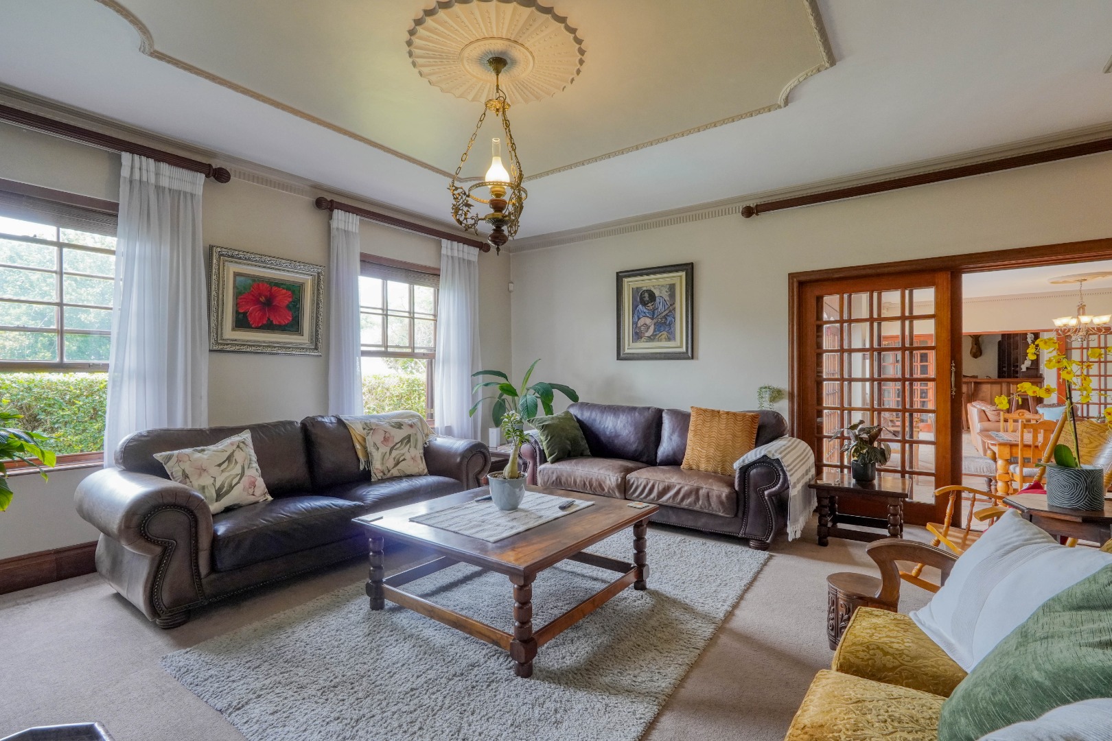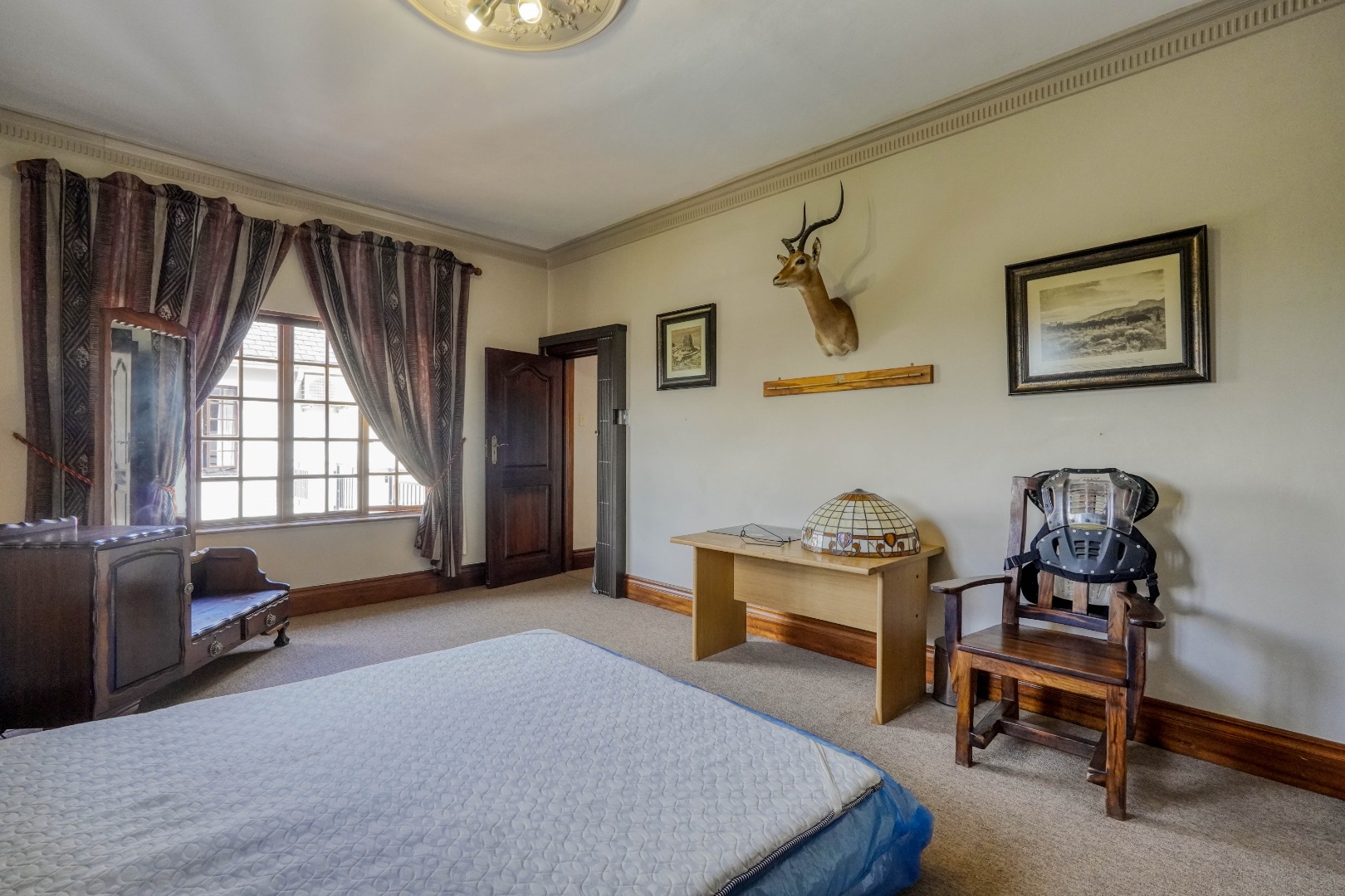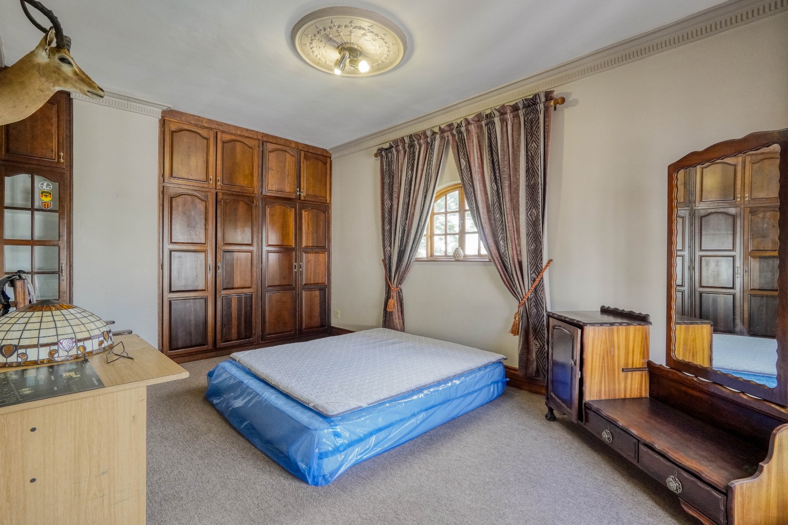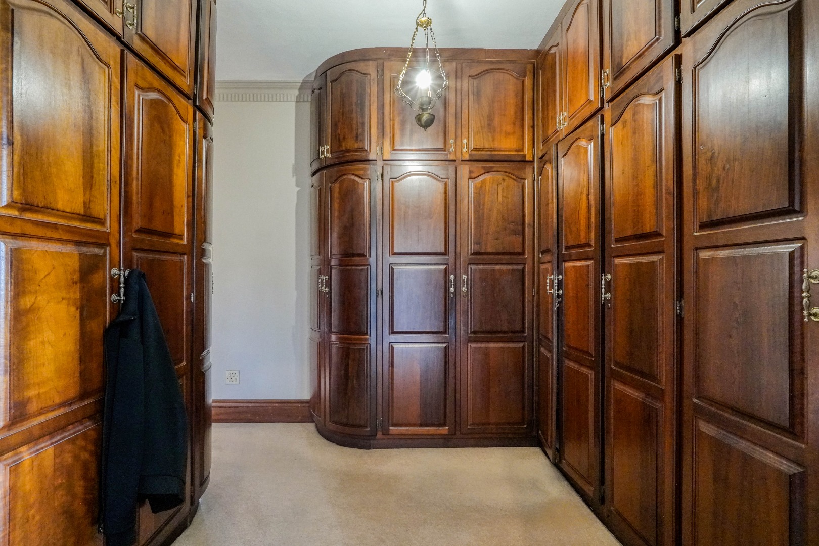 A secondary staircase near the main entrance leads downward and appears to descend into a basement, but instead guides you to the garages in the east wing, giving the home a rare three storey feel. Practical features include solar panels supported by two 5800W inverters and two geysers, ensuring efficiency to match the scale of the property.