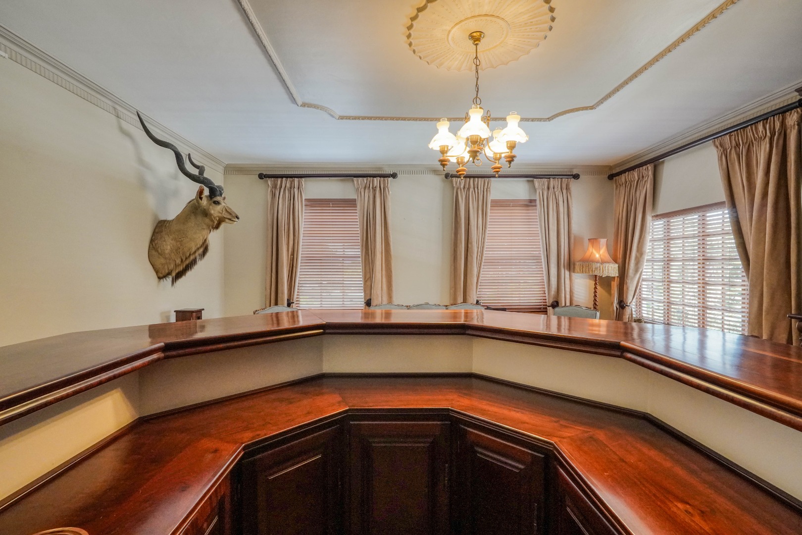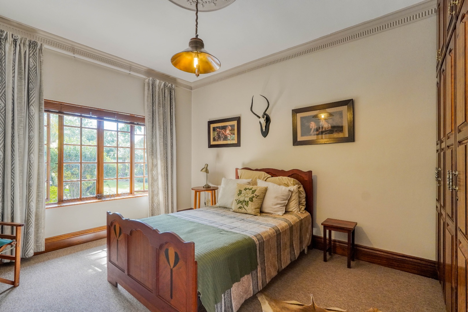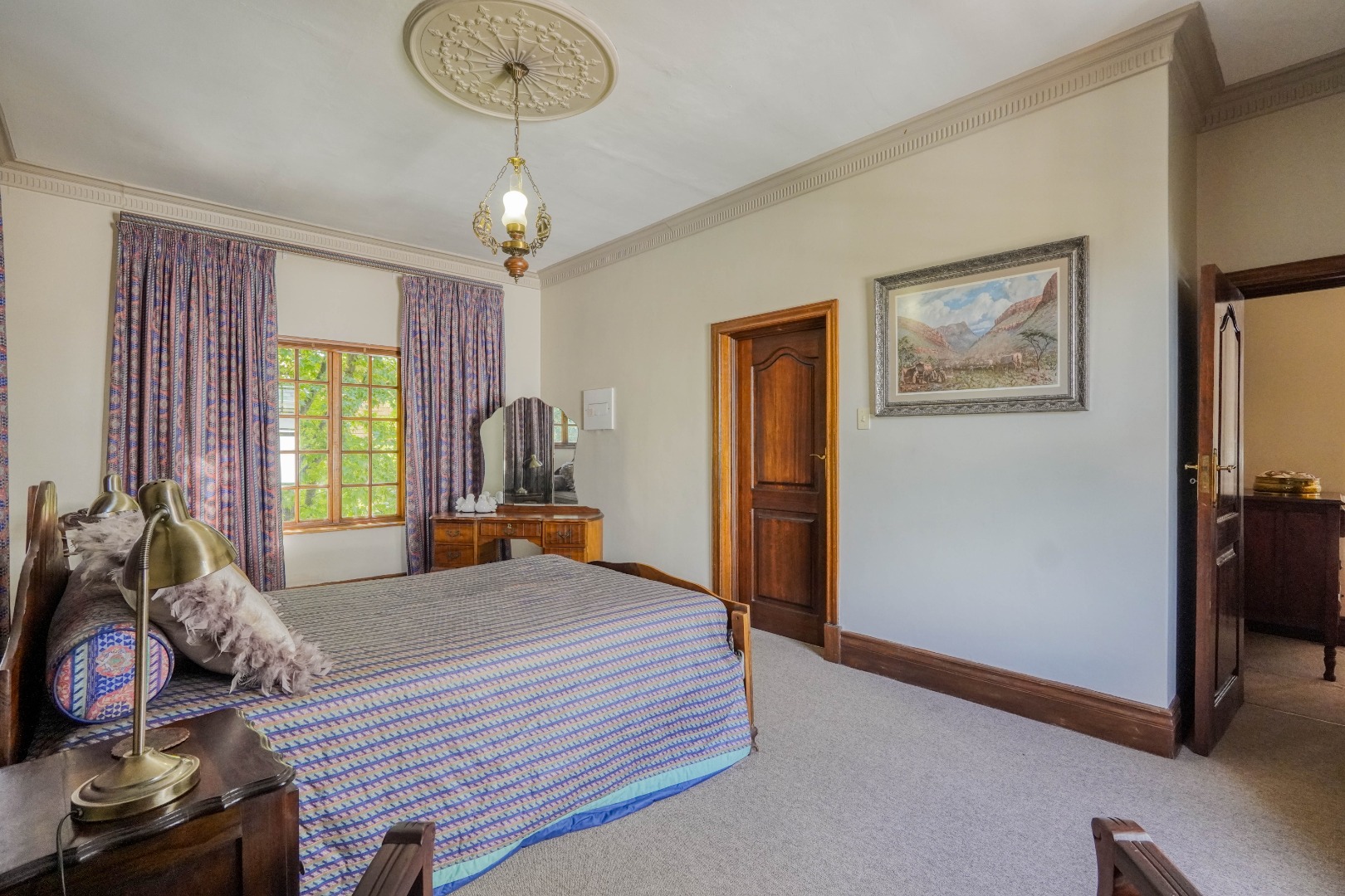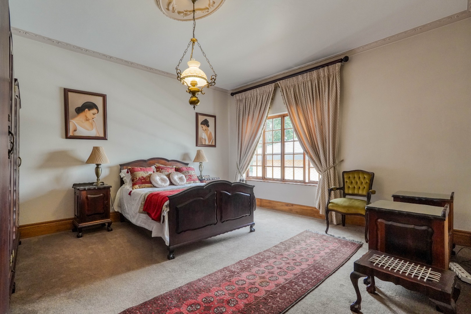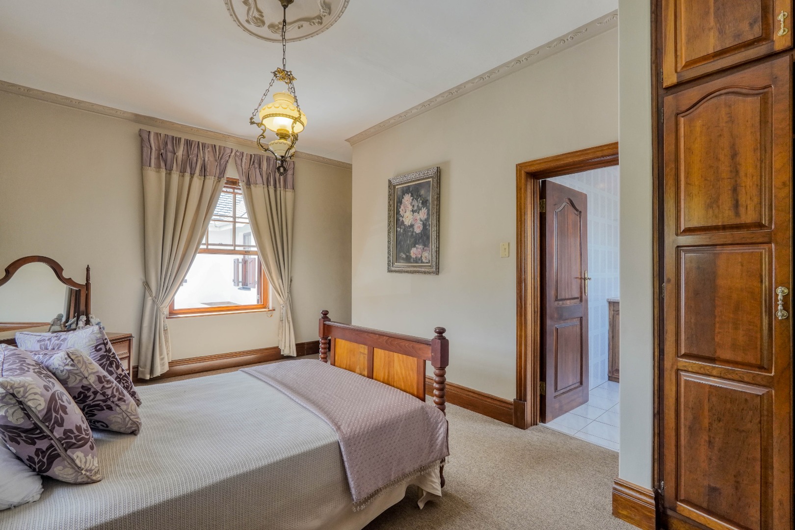 A secondary staircase near the main entrance leads downward and appears to descend into a basement, but instead guides you to the garages in the east wing, giving the home a rare three storey feel. Practical features include solar panels supported by two 5800W inverters and two geysers, ensuring efficiency to match the scale of the property.