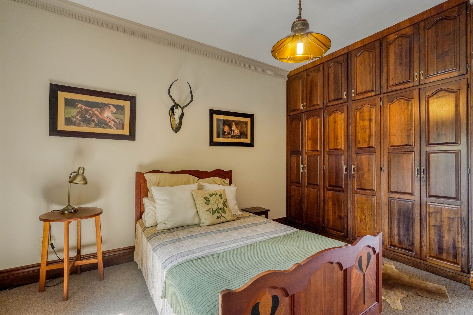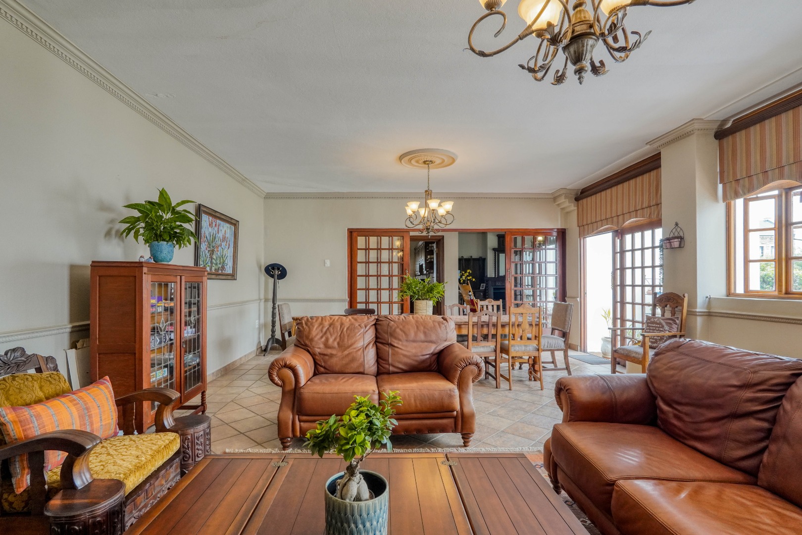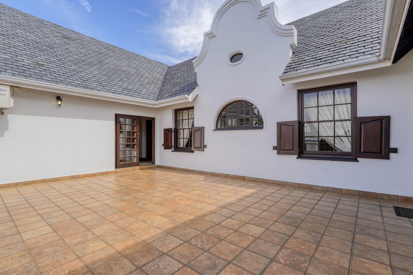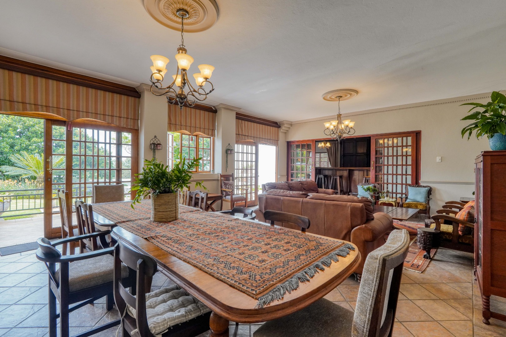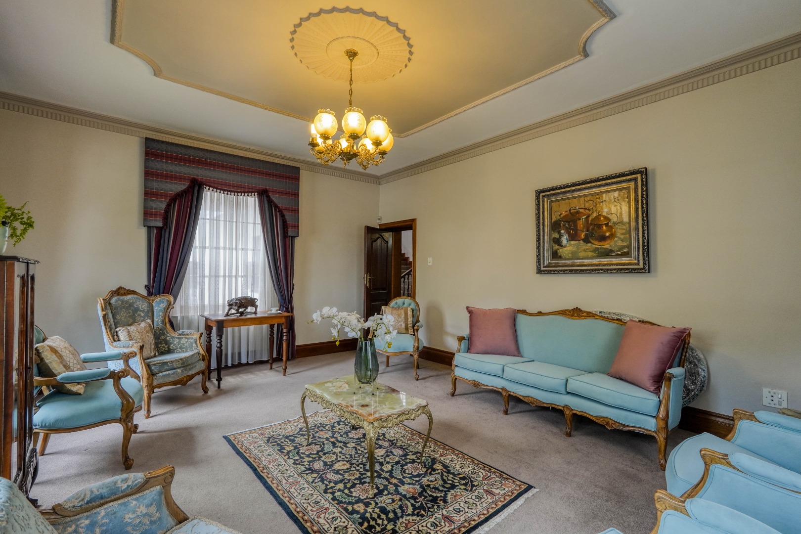 A secondary staircase near the main entrance leads downward and appears to descend into a basement, but instead guides you to the garages in the east wing, giving the home a rare three storey feel. Practical features include solar panels supported by two 5800W inverters and two geysers, ensuring efficiency to match the scale of the property.