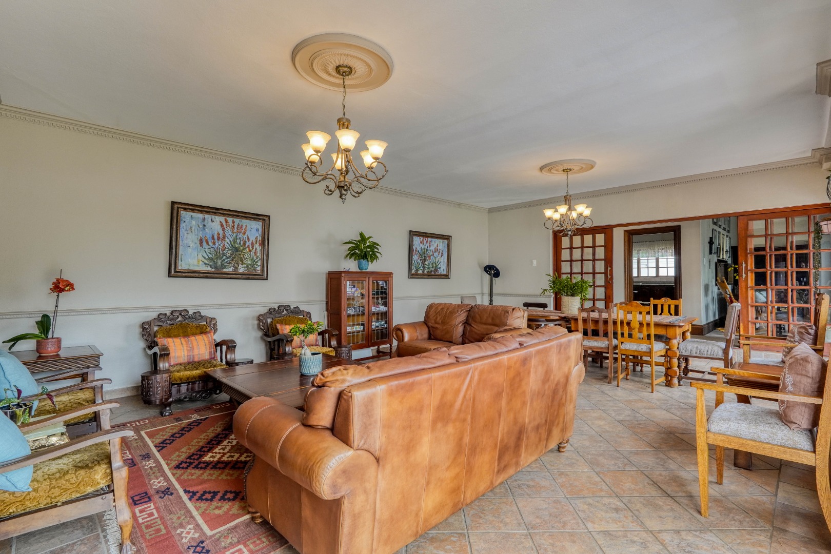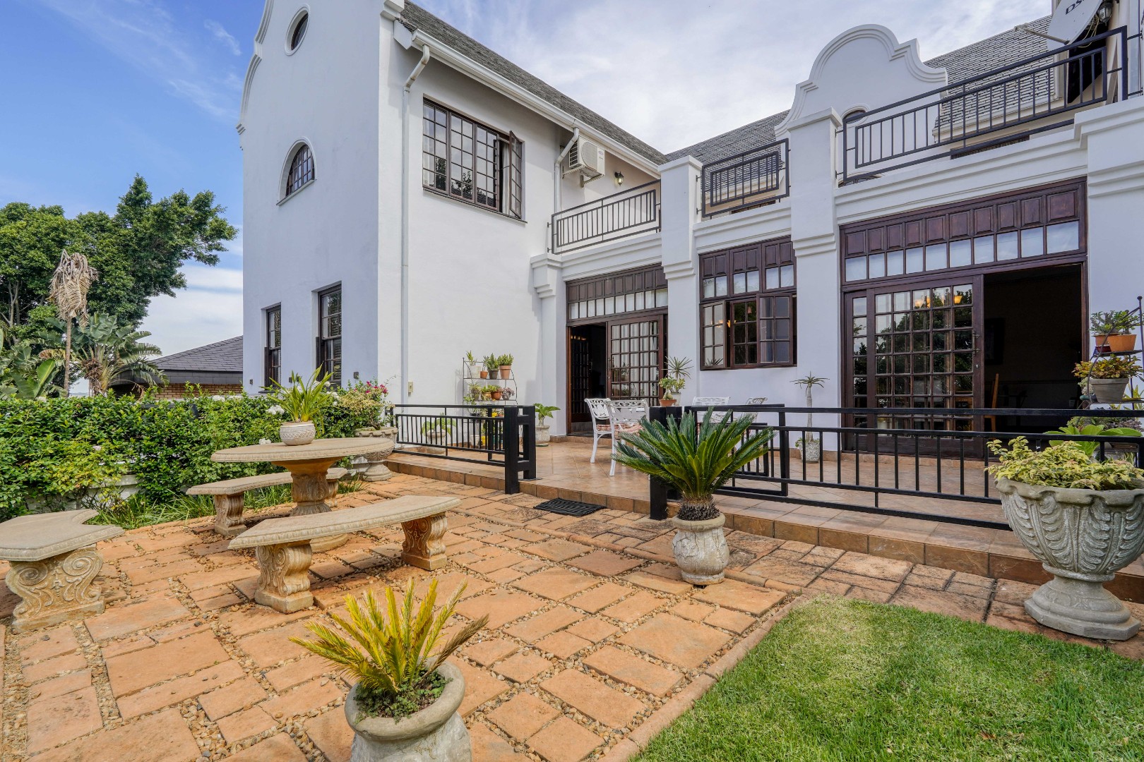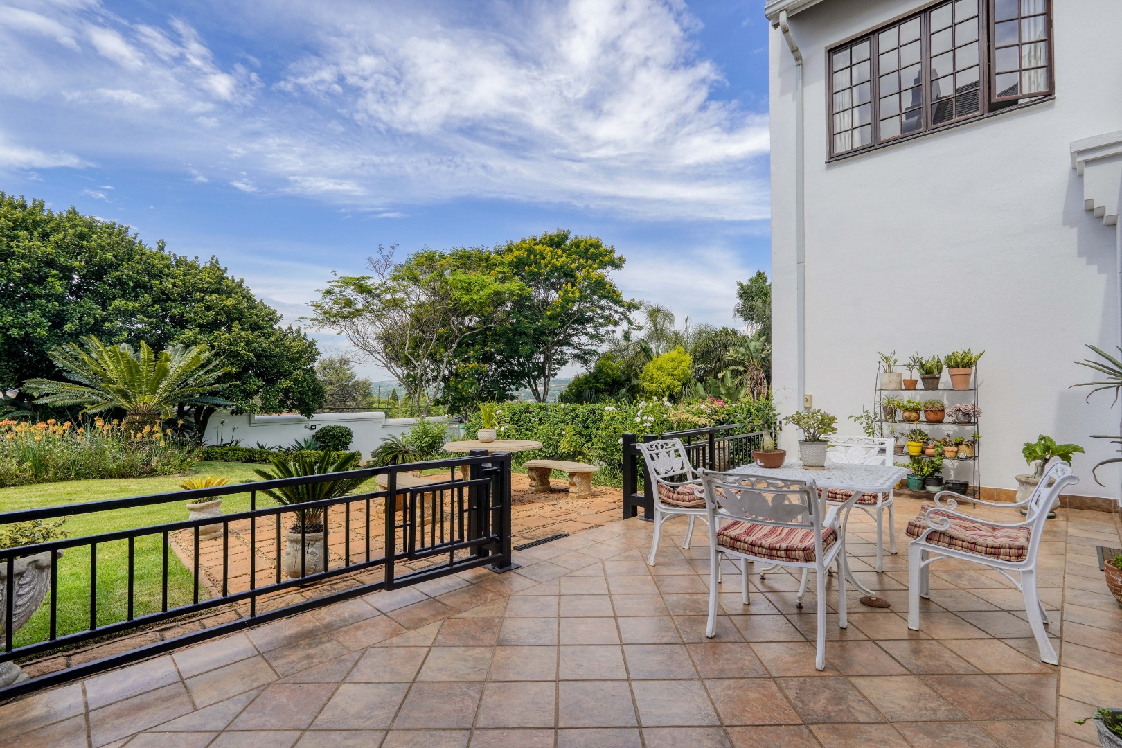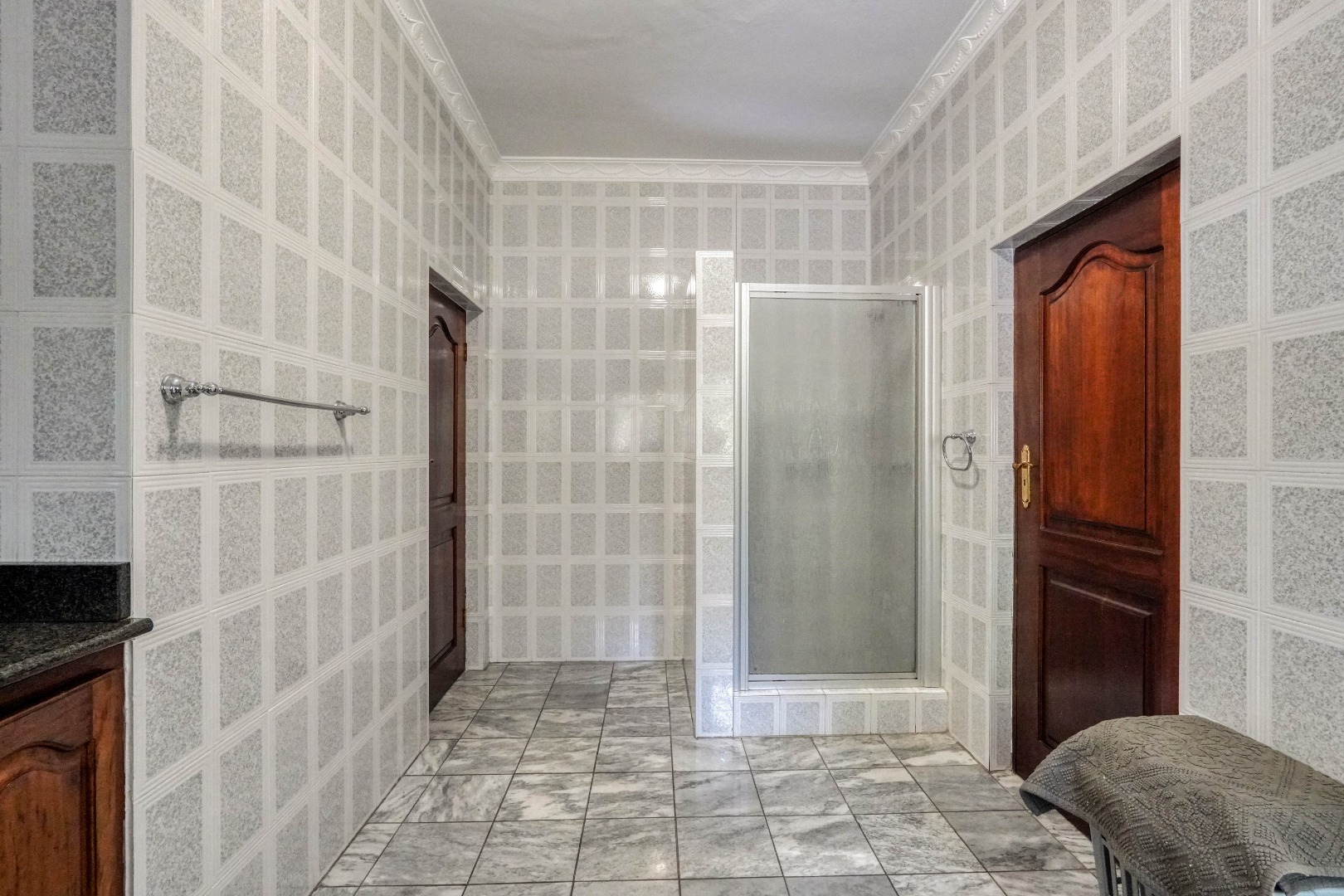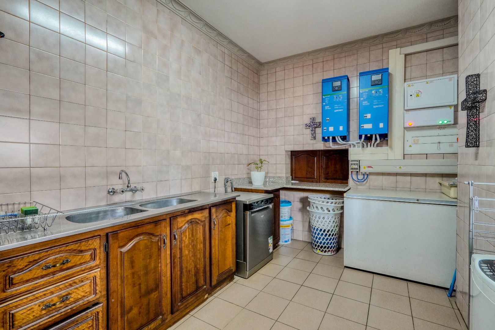 A secondary staircase near the main entrance leads downward and appears to descend into a basement, but instead guides you to the garages in the east wing, giving the home a rare three storey feel. Practical features include solar panels supported by two 5800W inverters and two geysers, ensuring efficiency to match the scale of the property.