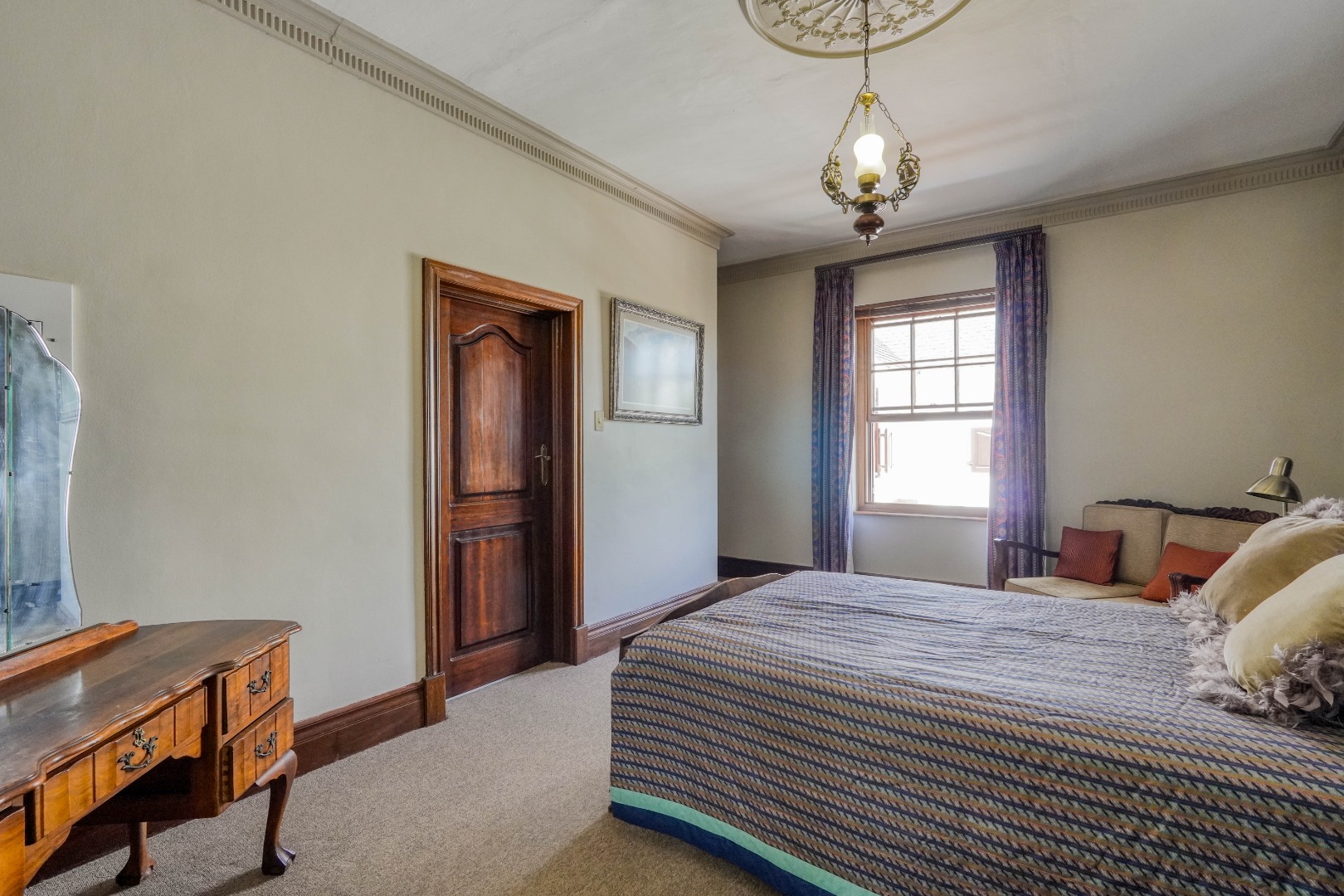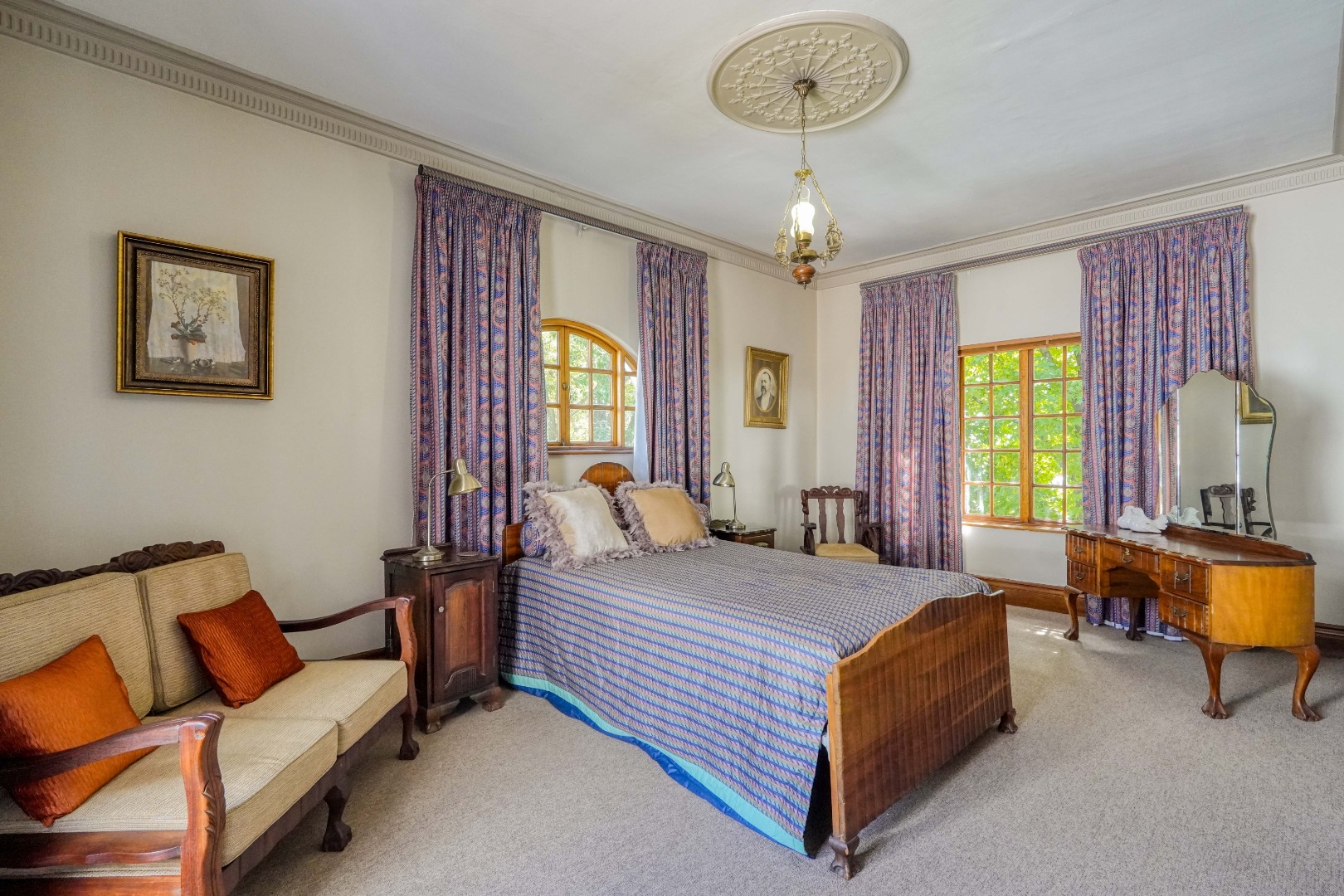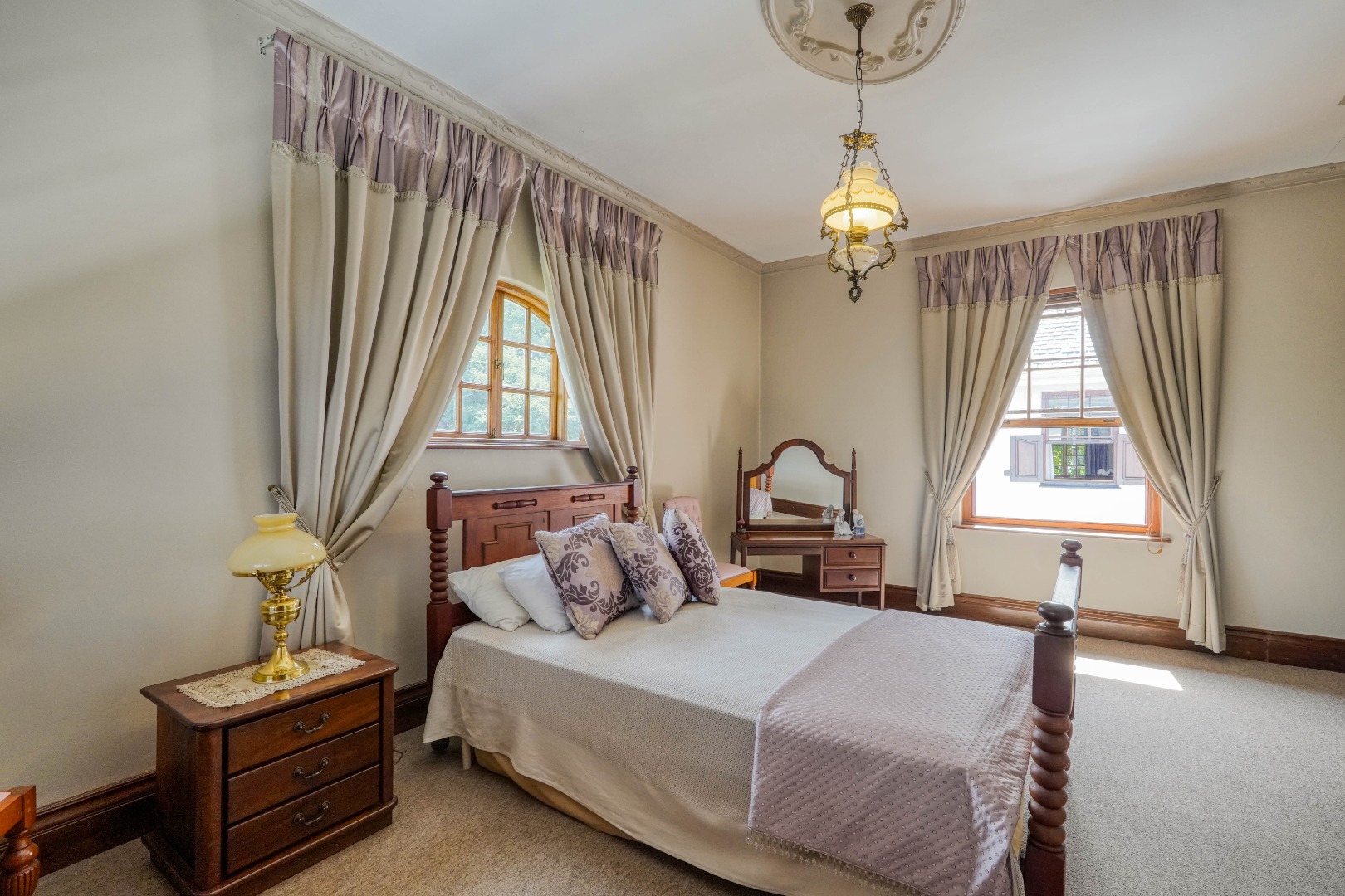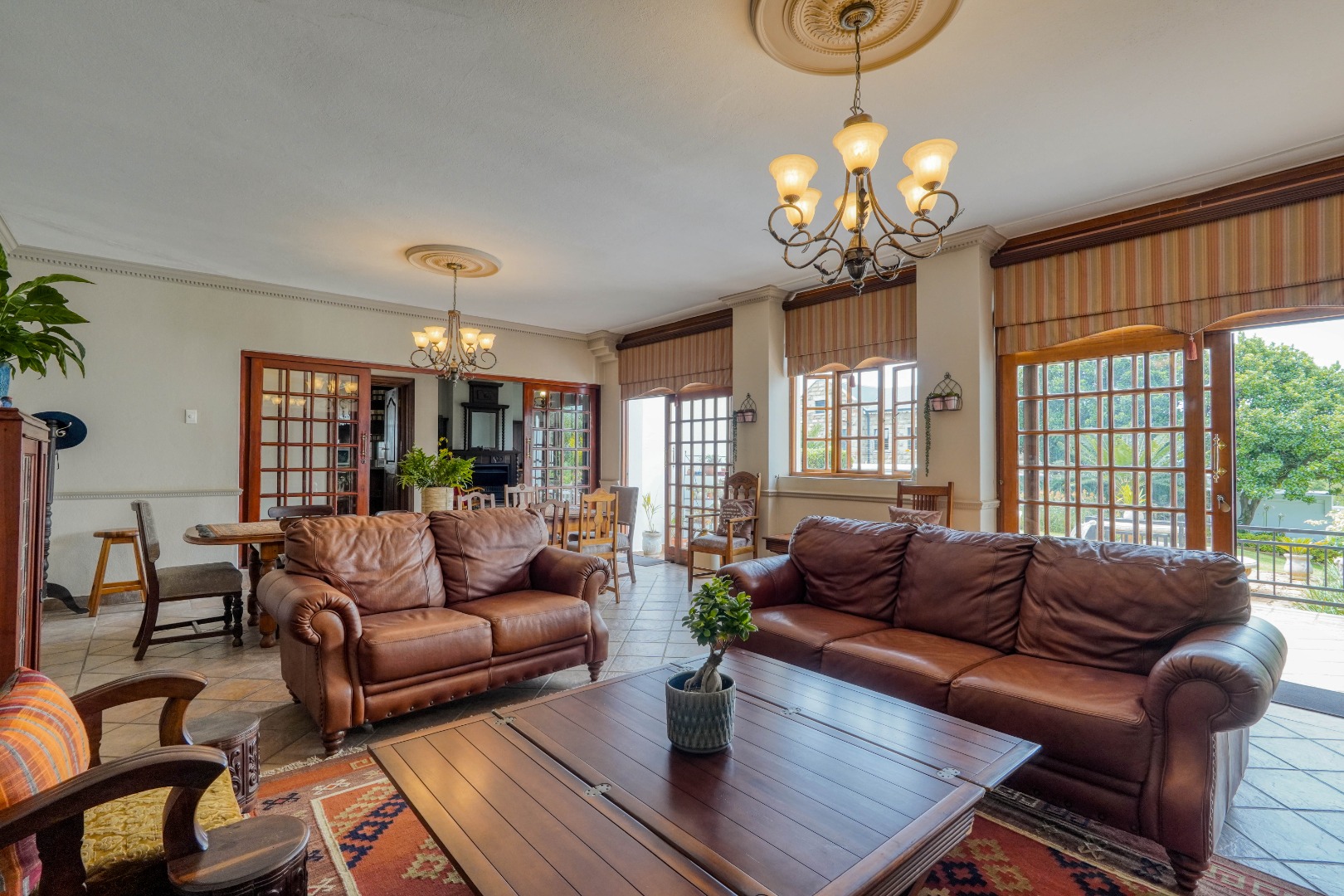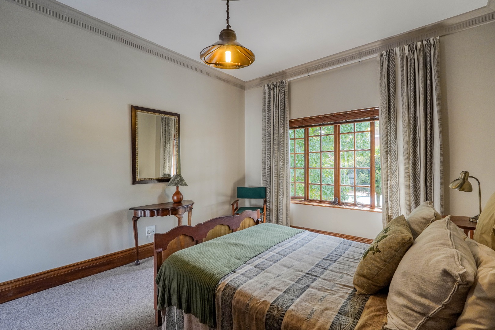 A secondary staircase near the main entrance leads downward and appears to descend into a basement, but instead guides you to the garages in the east wing, giving the home a rare three storey feel. Practical features include solar panels supported by two 5800W inverters and two geysers, ensuring efficiency to match the scale of the property.