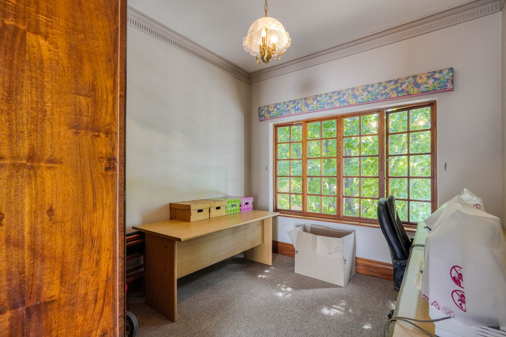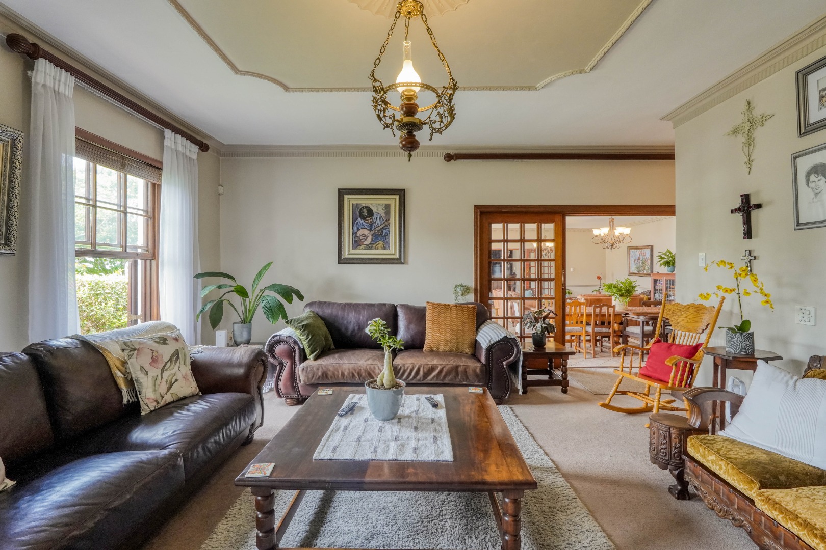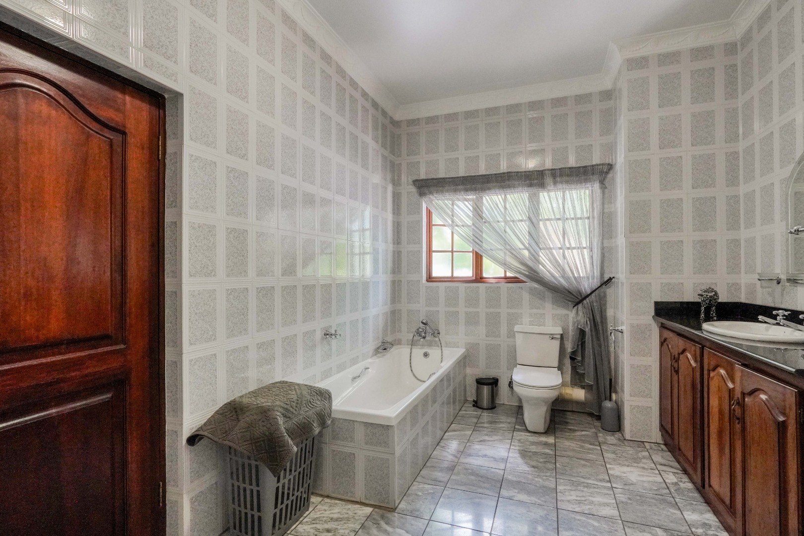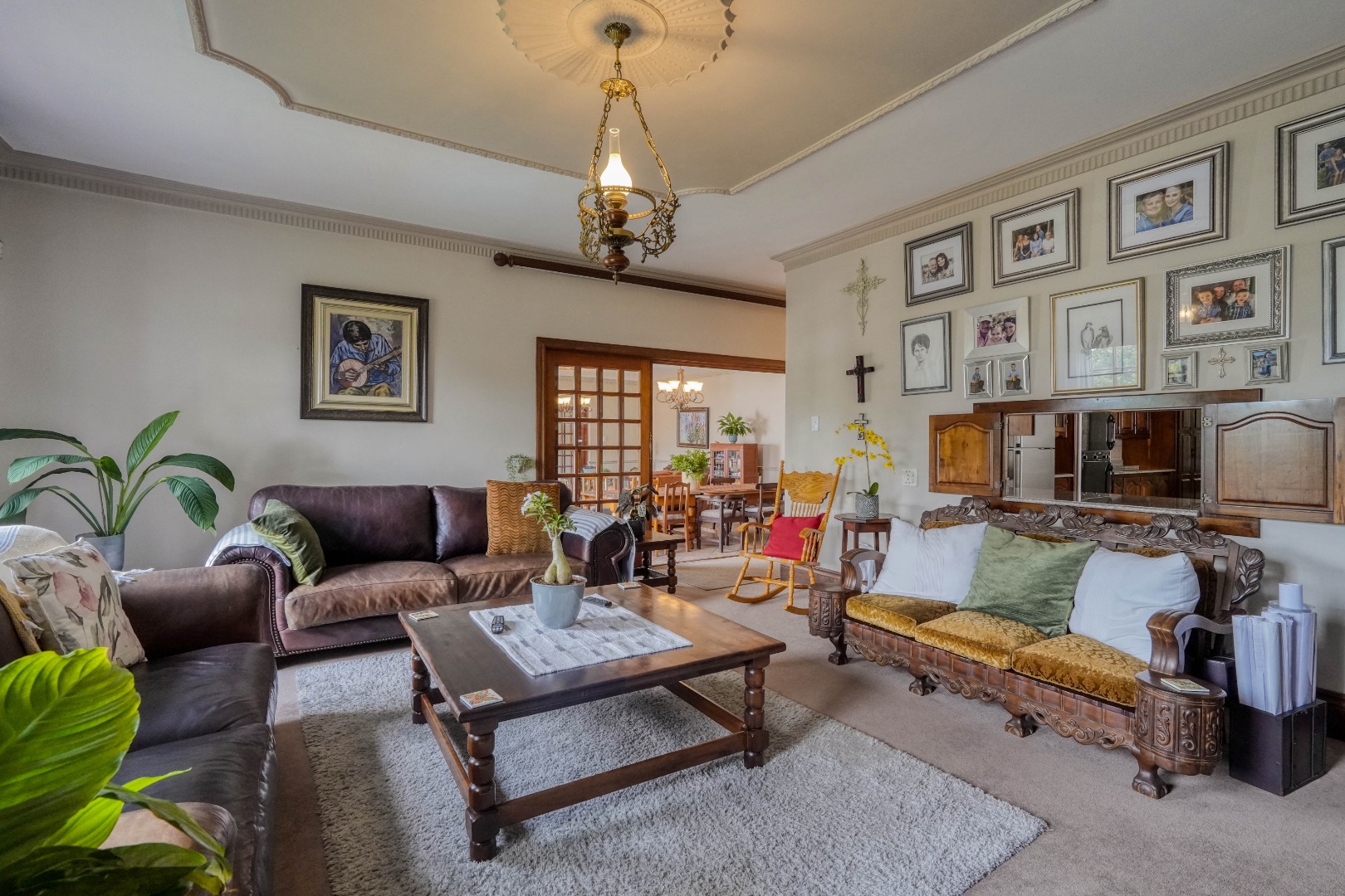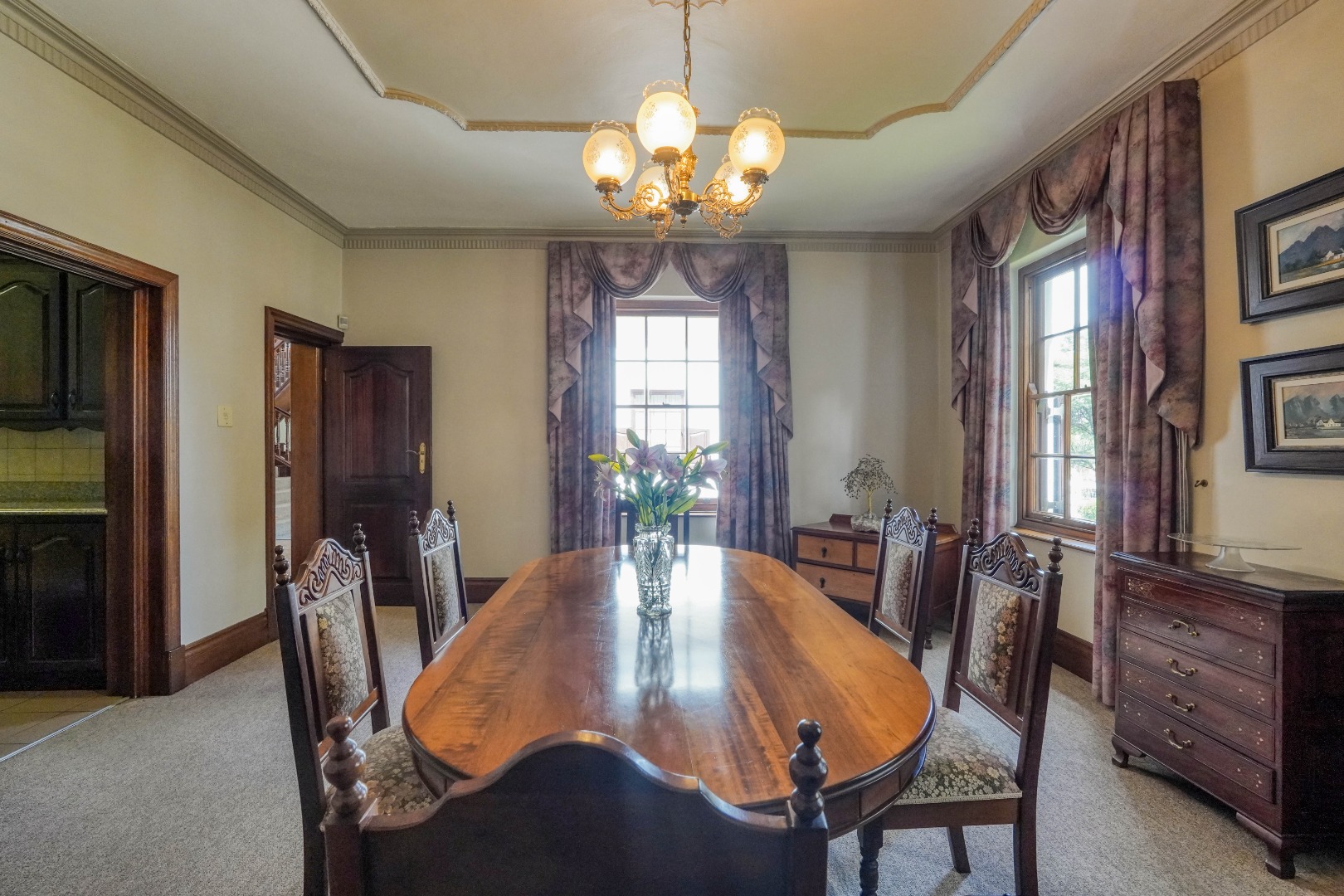 A secondary staircase near the main entrance leads downward and appears to descend into a basement, but instead guides you to the garages in the east wing, giving the home a rare three storey feel. Practical features include solar panels supported by two 5800W inverters and two geysers, ensuring efficiency to match the scale of the property.