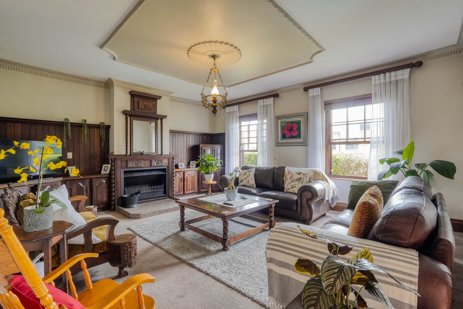 From the moment you arrive, this striking six bedroom mansion sets a tone of old world elegance and scale. A dual driveway and feature fountain lead you to the formal entrance on the south wing, where a dramatic central staircase welcomes you and immediately divides the home into east and west wings. The architectural style throughout evokes classic 1800s charm, with generous proportions, symmetry, and richly layered living spaces.