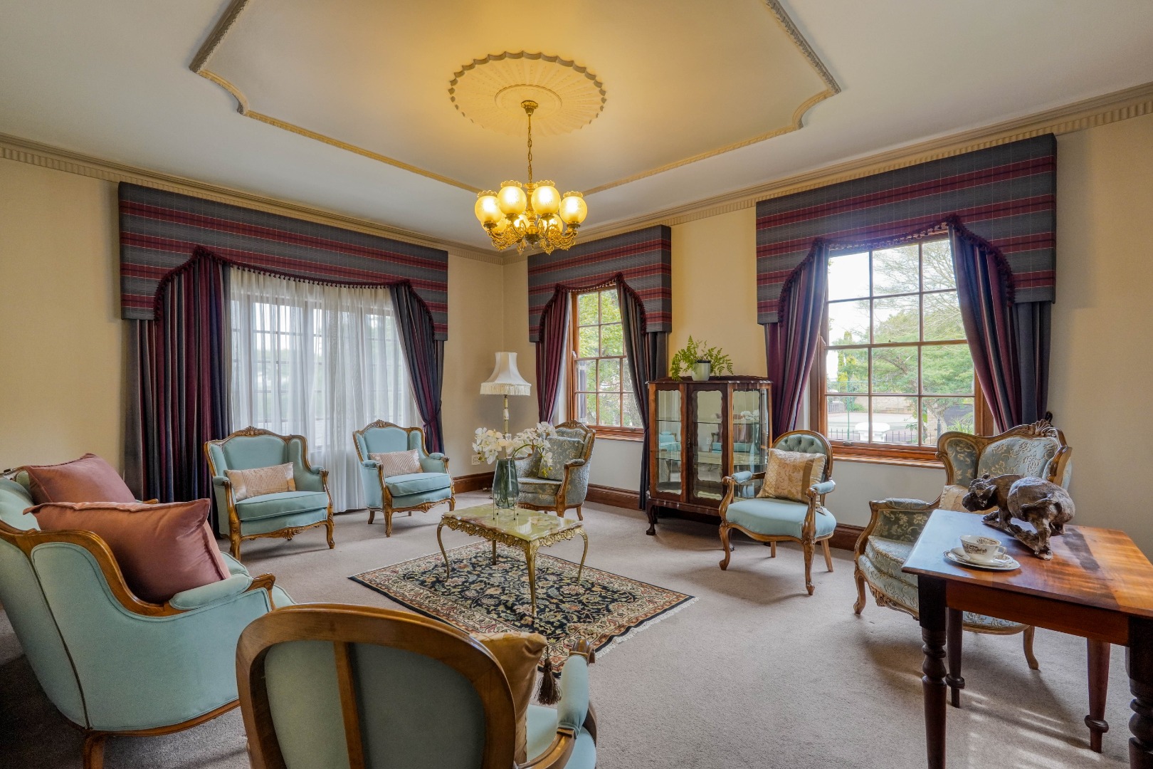 The ground floor offers three distinct lounges, each with its own character. At the heart of the north wing, a formal lounge shares its space with the dining area and opens directly to the backyard, creating a graceful flow toward the patio, swimming pool, and a small covered seating area ideal for relaxed afternoons and tea gatherings. To the north east wing, an entertainment lounge with a large built in bar provides a social hub, while the north west wing hosts a more intimate lounge with a fireplace, perfect for quieter evenings. These living spaces are thoughtfully positioned with the dining lounge sitting between the bar lounge and the fireplace lounge, enhancing the sense of balance and grandeur.