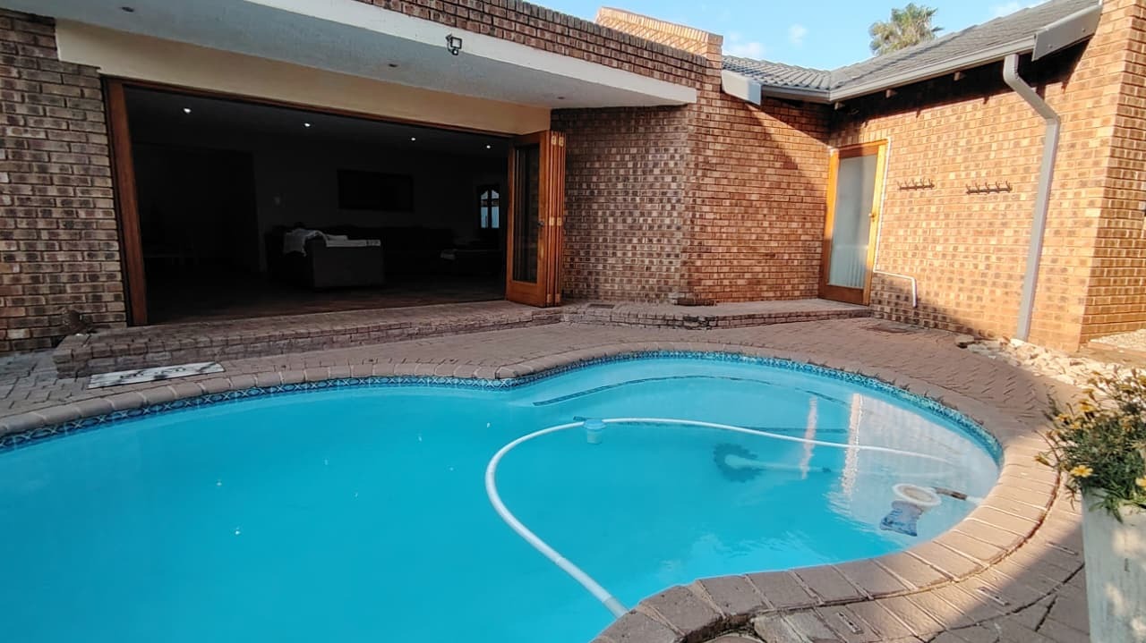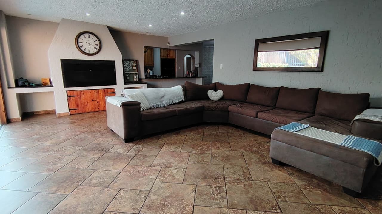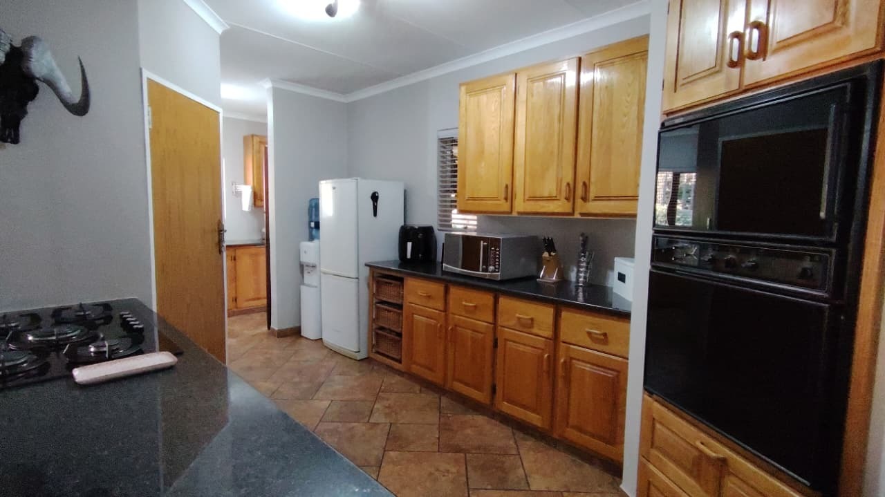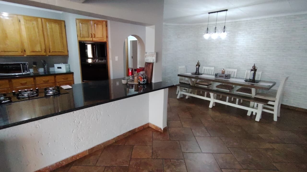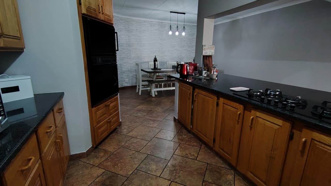 Discover this expansive family residence nestled within a secure gated community in Eldoraigne, Centurion. Boasting a generous 426 sqm under roof on a 1000 sqm erf, this property offers an exceptional lifestyle with ample space for comfortable living and entertaining. The interior features an inviting open-plan design, seamlessly connecting living areas. The main kitchen is well-appointed with dark granite countertops, a modern 5-burner gas hob, and built-in double ovens, complemented by ample wooden cabinetry and a convenient pantry. A second kitchen further enhances the home's versatility, ideal for dual living arrangements or extended family. The spacious lounge and dedicated family TV room provide multiple zones for relaxation, while the dining area, featuring a stylish brick-effect accent wall and modern chandelier, is perfect for hosting gatherings. An integrated indoor braai in one of the living spaces adds to the entertainment appeal.