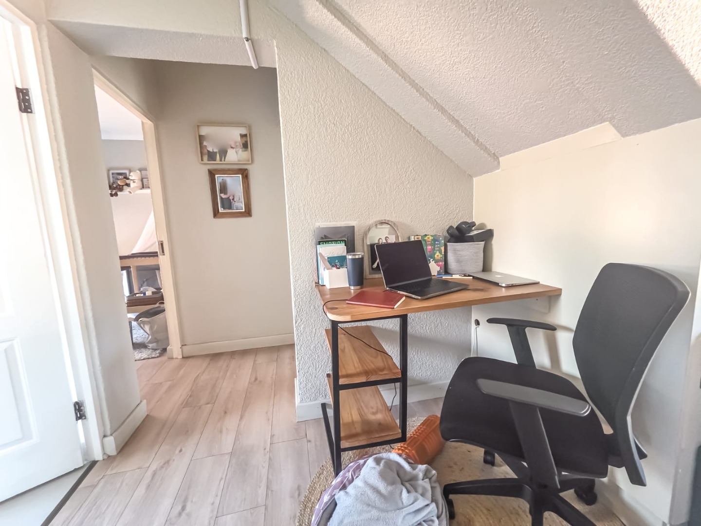 The compact yet highly functional kitchen is equipped with light cabinetry, granite-style countertops, and space for appliances. The home comprises two comfortable bedrooms, one of which is currently configured as a cozy nursery, alongside a contemporary bathroom featuring a stylish walk-in shower with herringbone accent tiles and a modern vanity.