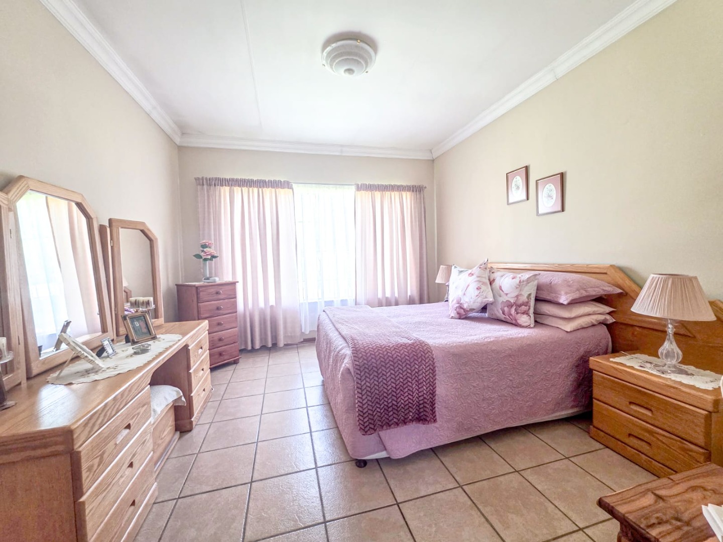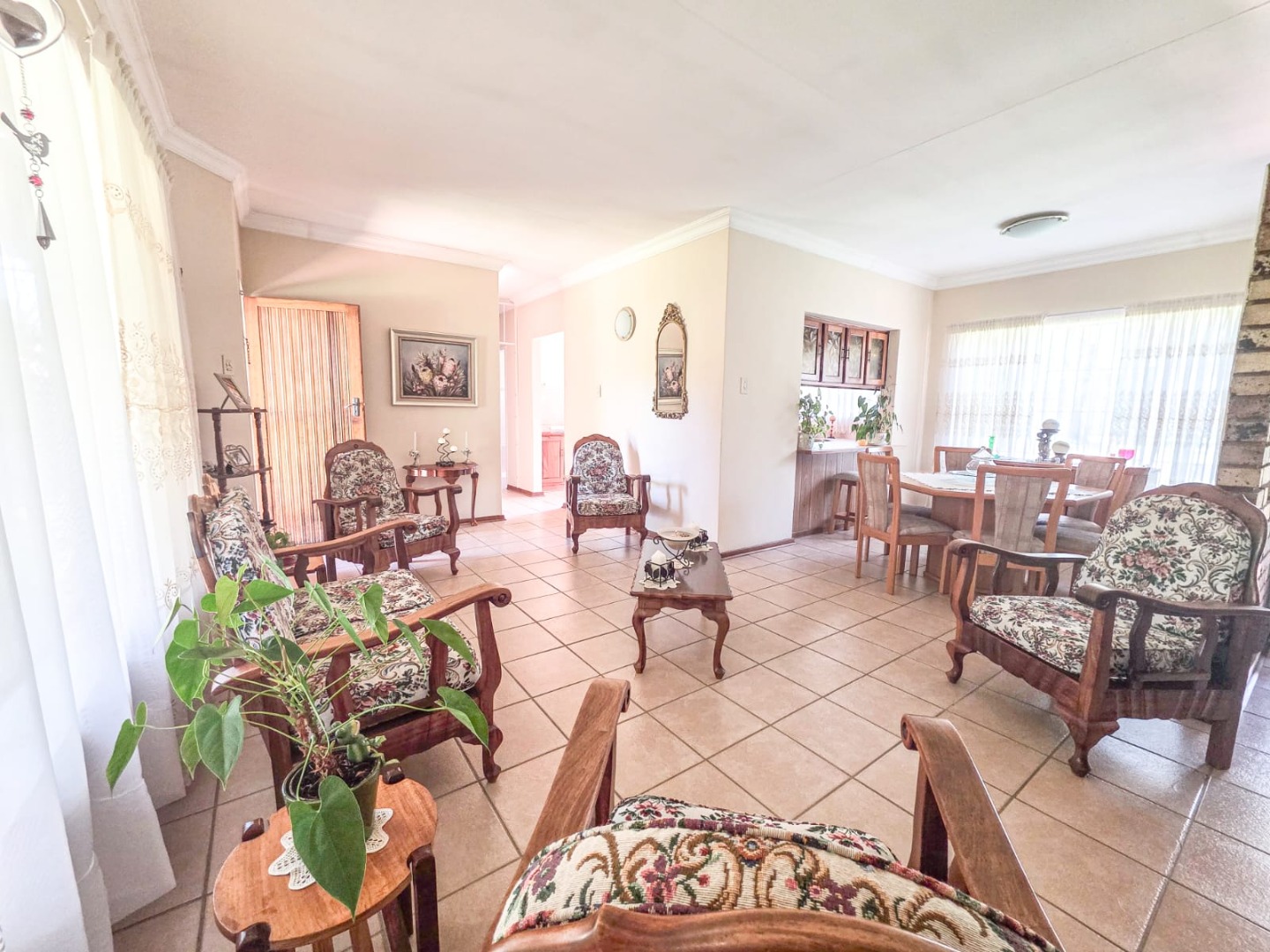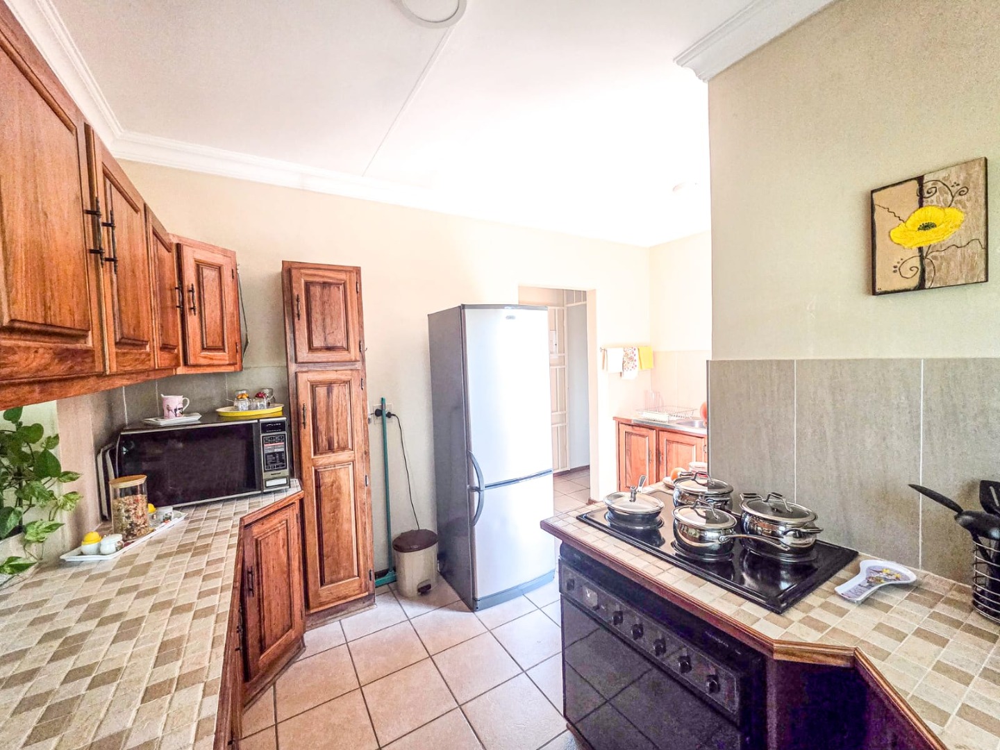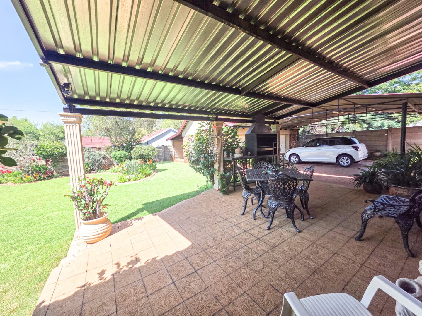 Discover this spacious 3-bedroom, 2-bathroom family home situated in the desirable Heuweloord, Centurion. The interior features an inviting open-plan living and dining area with consistent tiled flooring, benefiting from ample natural light. The kitchen boasts extensive wooden cabinetry, tiled countertops, a built-in electric hob, and a convenient pantry. Bedrooms are generously sized. Outside, enjoy a lush garden, a paved patio, and a dedicated outdoor braai area perfect for entertaining. The property includes double garages and a large covered carport, providing abundant parking. Security is enhanced with electric fencing, an alarm system, and security gates, ensuring peace of mind in this suburban South African setting.