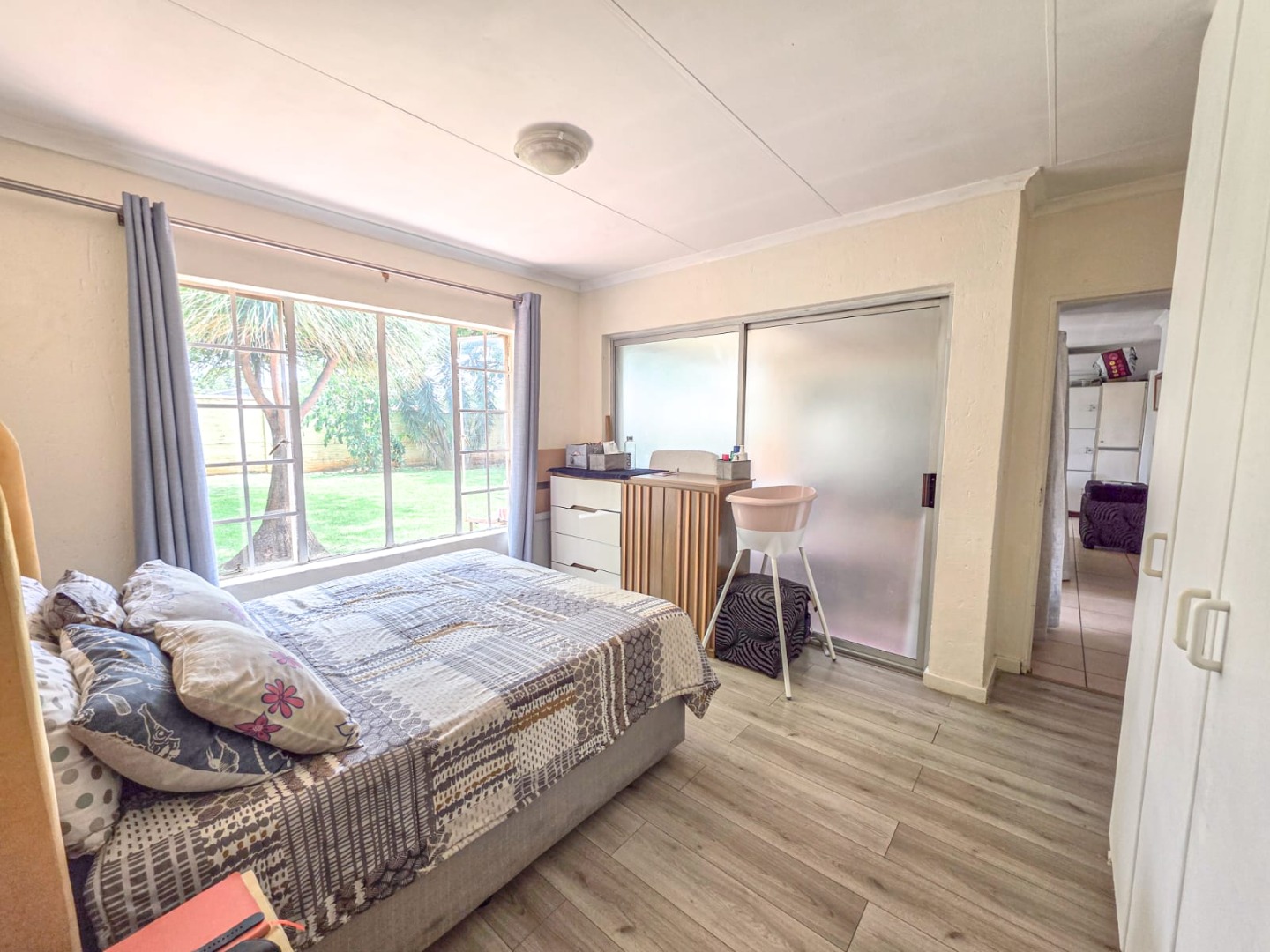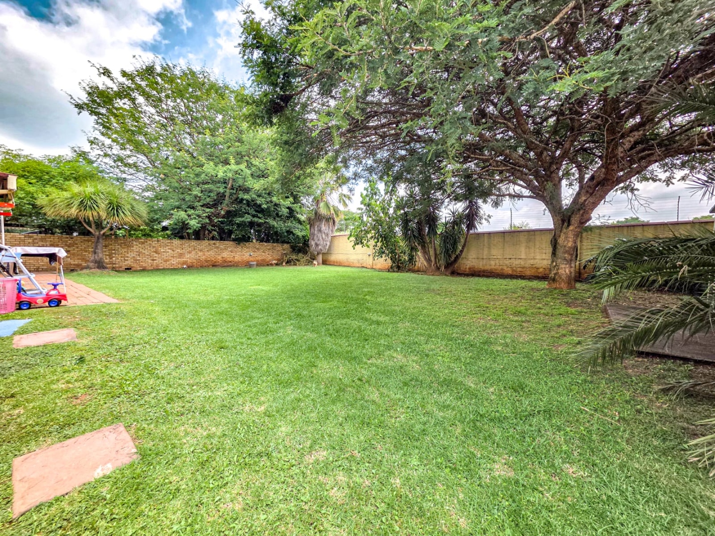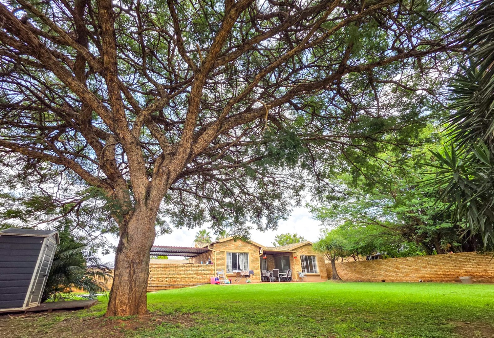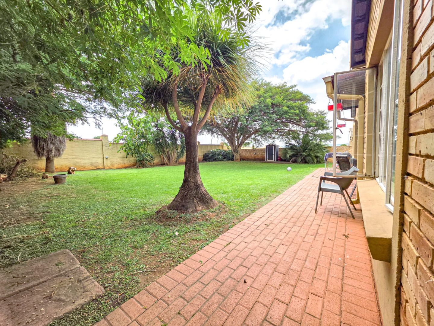 Step outside to a large, private backyard, perfect for outdoor enjoyment. Mature trees provide natural shade, complementing the covered patio area – an ideal spot for entertaining or quiet relaxation. A small storage shed adds practical utility, and the property is secured by a perimeter wall. Residents will appreciate the robust security measures, including 24-hour security, a security post, access gate, burglar bars, and security gates, all within a totally walled security estate. Fibre connectivity is also available, catering to modern communication needs.