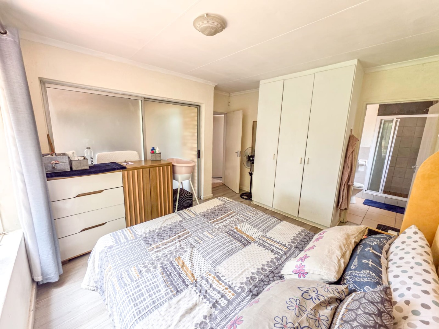 SOLE MANDATE - Discover this charming 2-bedroom, 2-bathroom residence located within a secure complex in Heuwelsig Estate, Centurion. Spanning 64 sqm, this home offers a practical and comfortable living environment, ideal for individuals or small families seeking a secure lifestyle. The interior features an inviting open-plan living and kitchen area, complete with durable tiled flooring, a ceiling fan, and air conditioning for year-round comfort. Large windows and sliding doors ensure abundant natural light throughout the main living spaces.